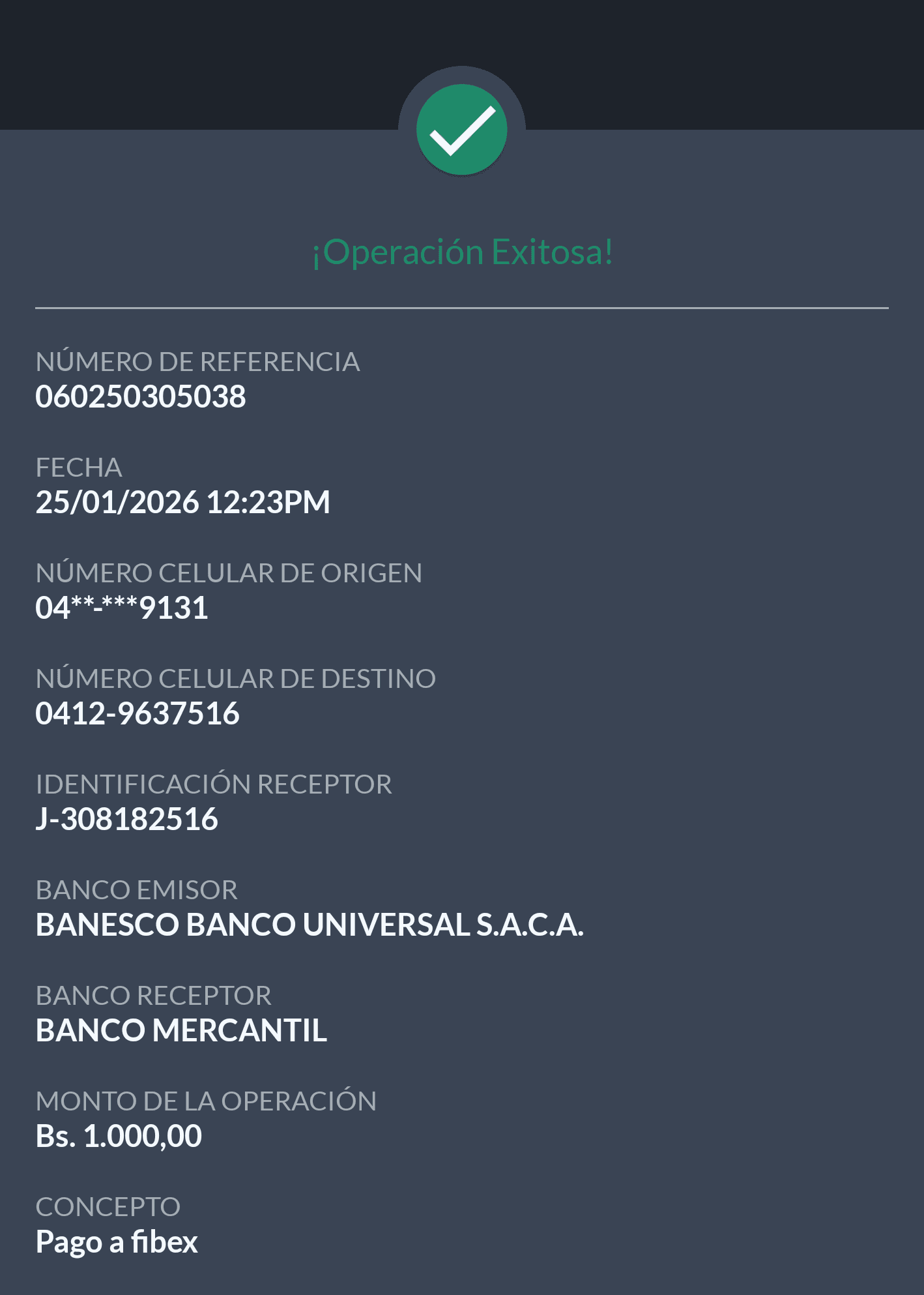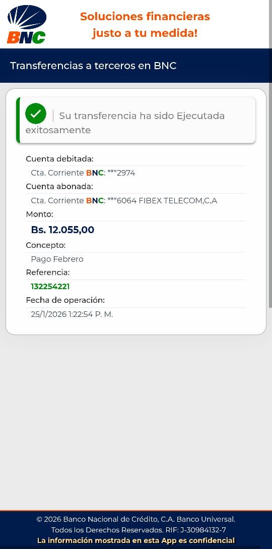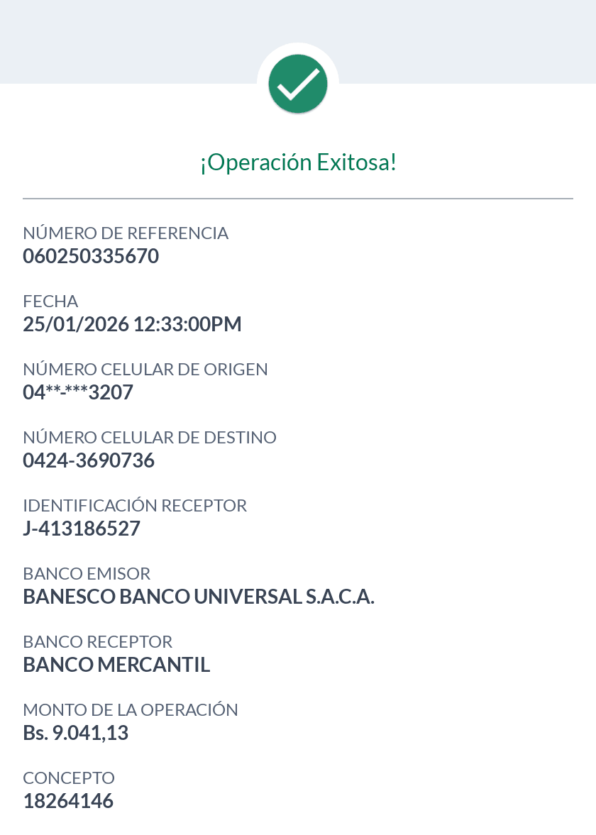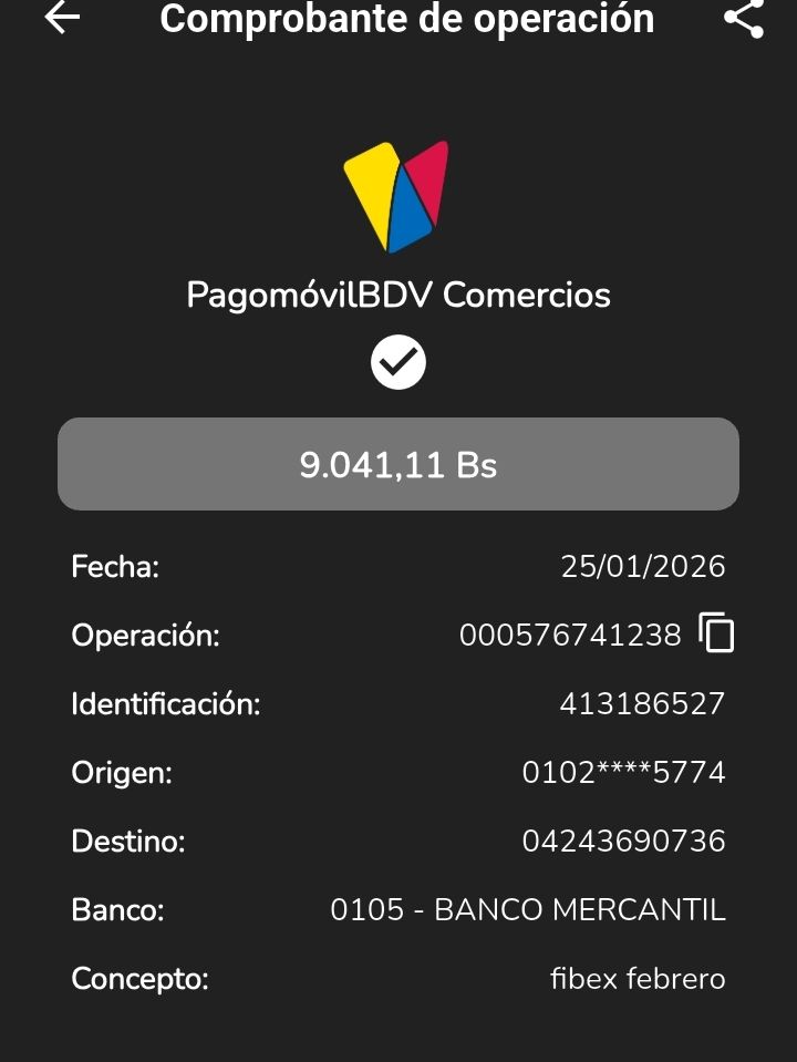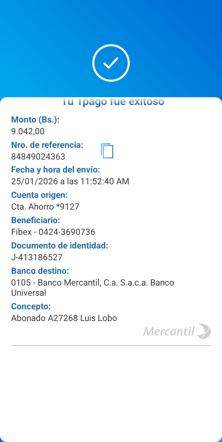 | A25227 | FRANCISCO JOSE VASQUEZ VERA | 2026-01-23 | MERCANTIL 2163 | 000000744264 | | 4,520.55 BS | 301.37 | REGISTRADO |
