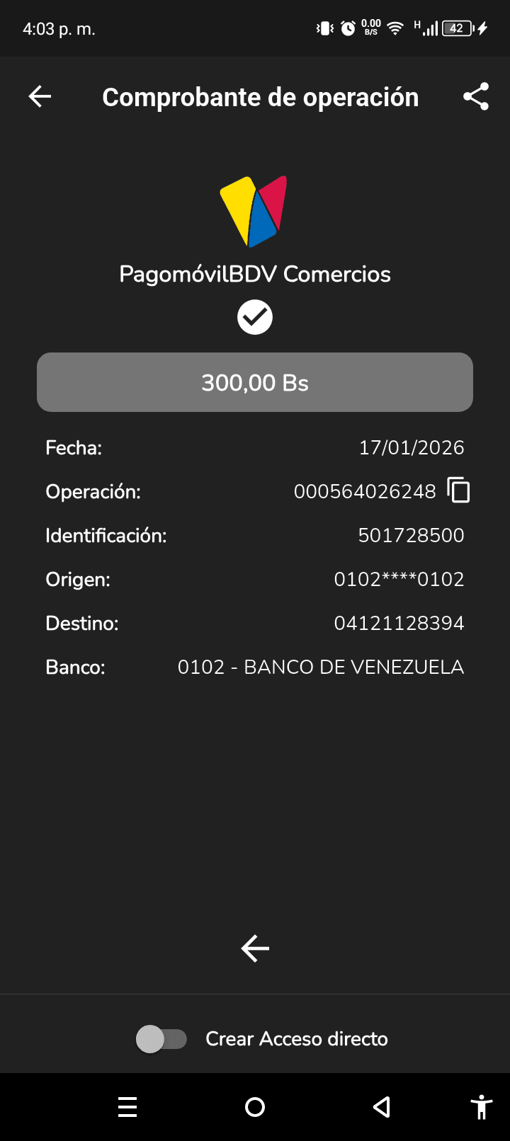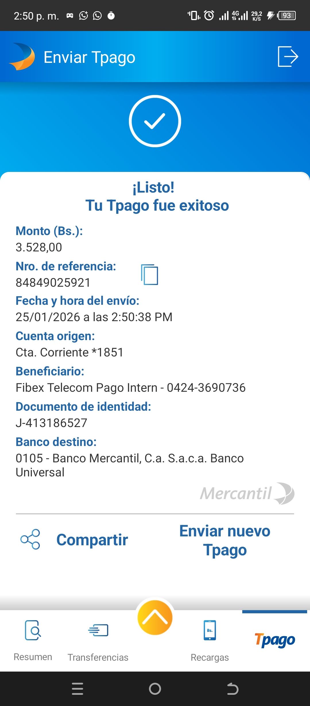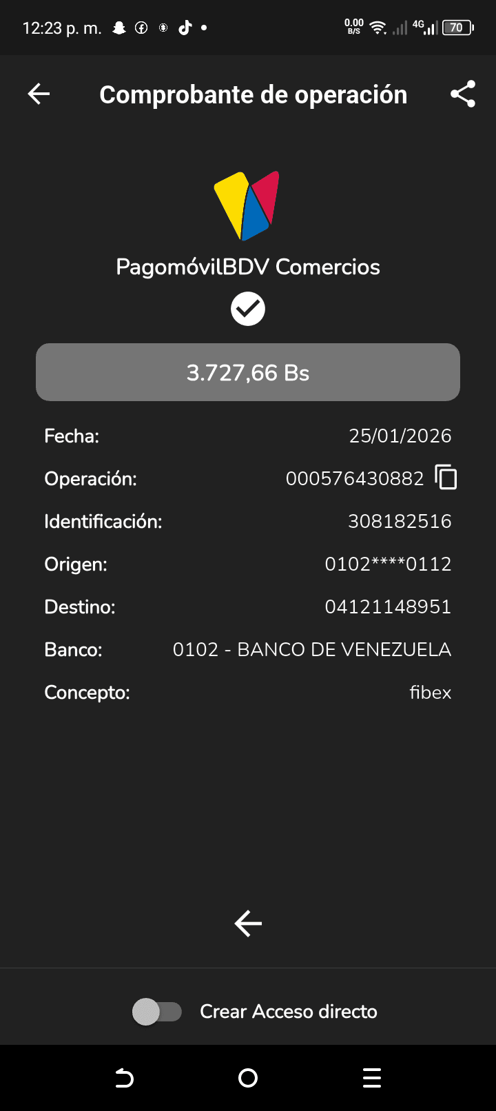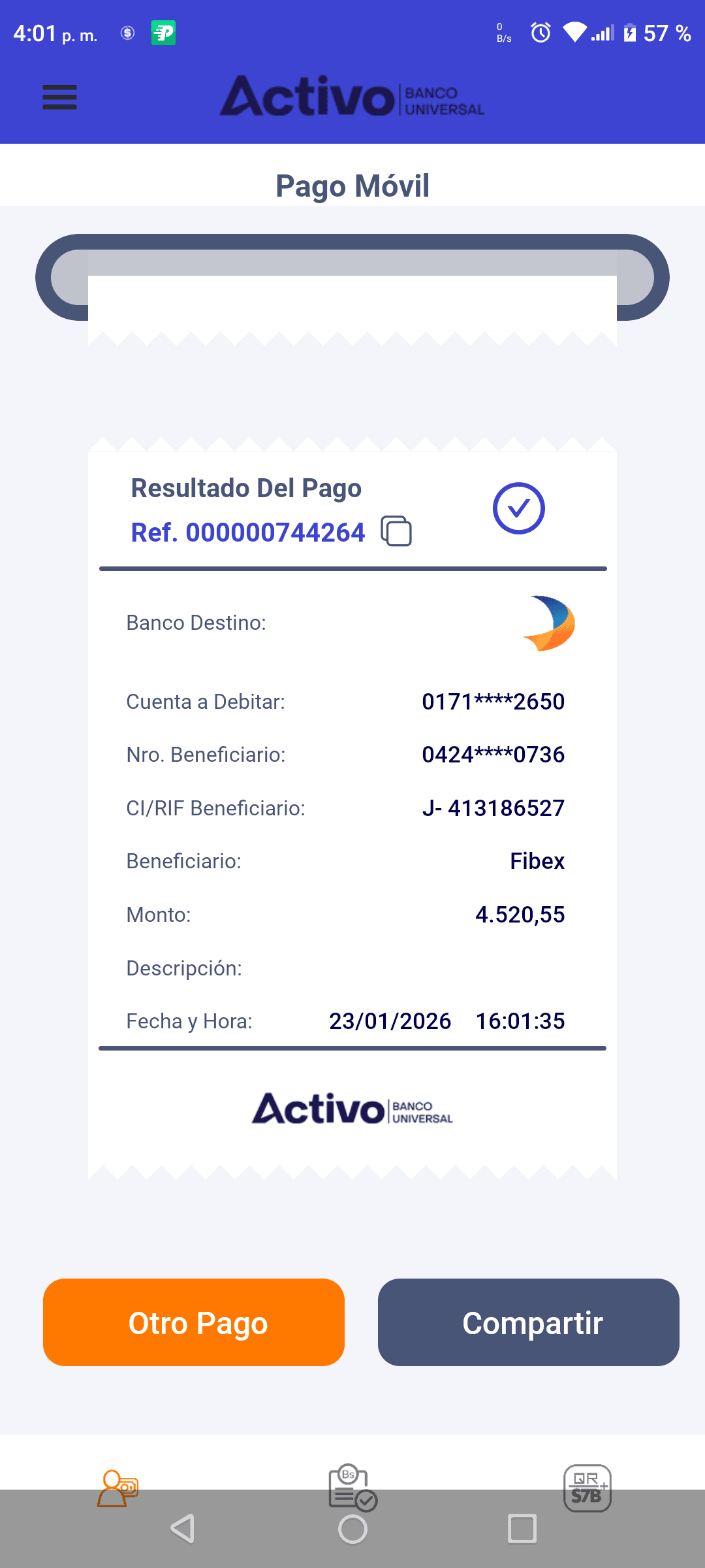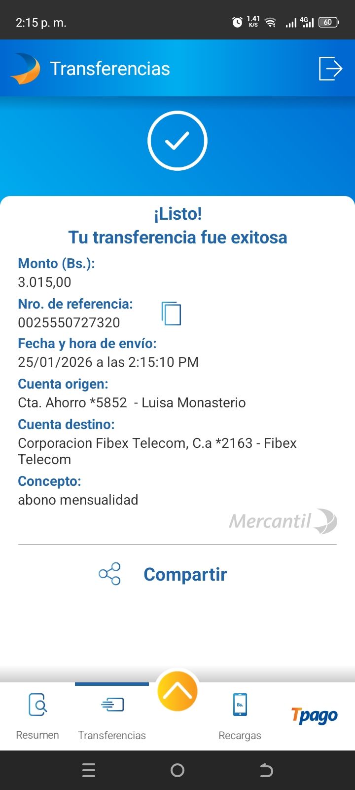 | A25227 | FRANCISCO JOSE VASQUEZ VERA | 2026-01-23 | MERCANTIL 2163 | 000000744264 | | 4,520.55 BS | 301.37 | REGISTRADO |