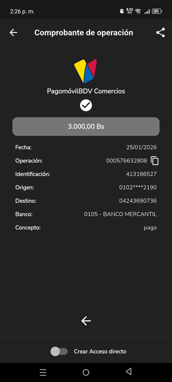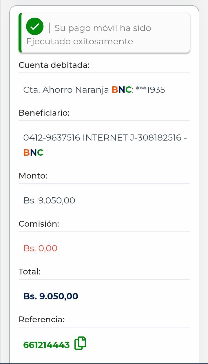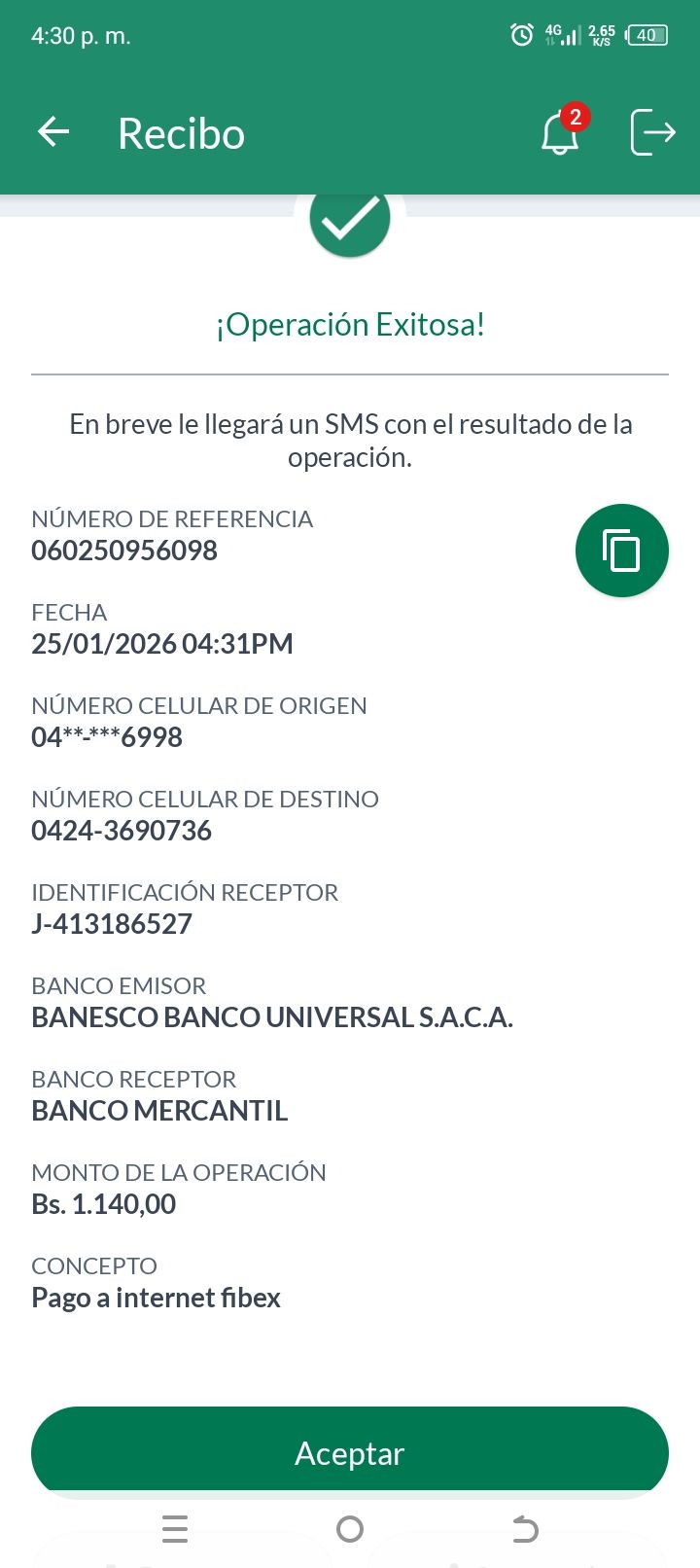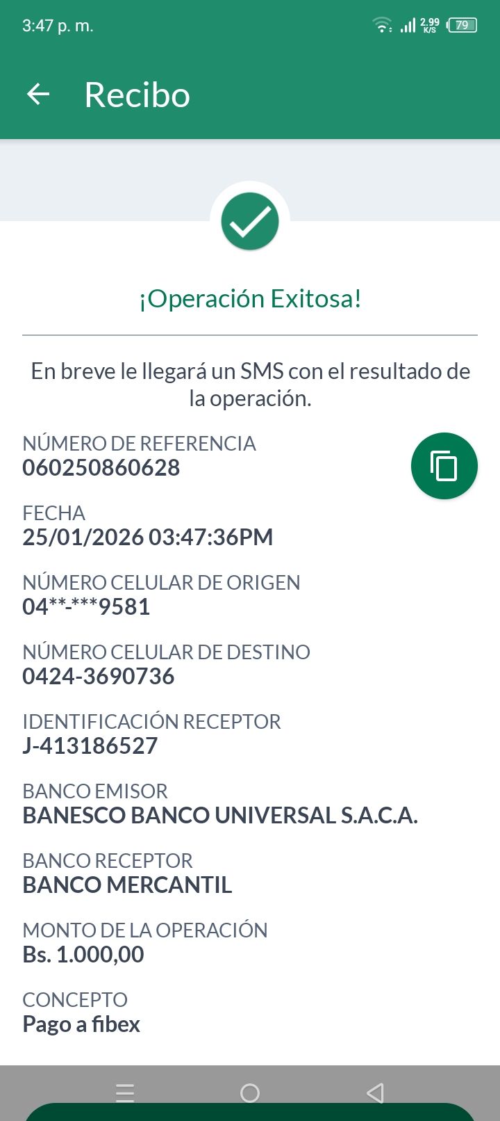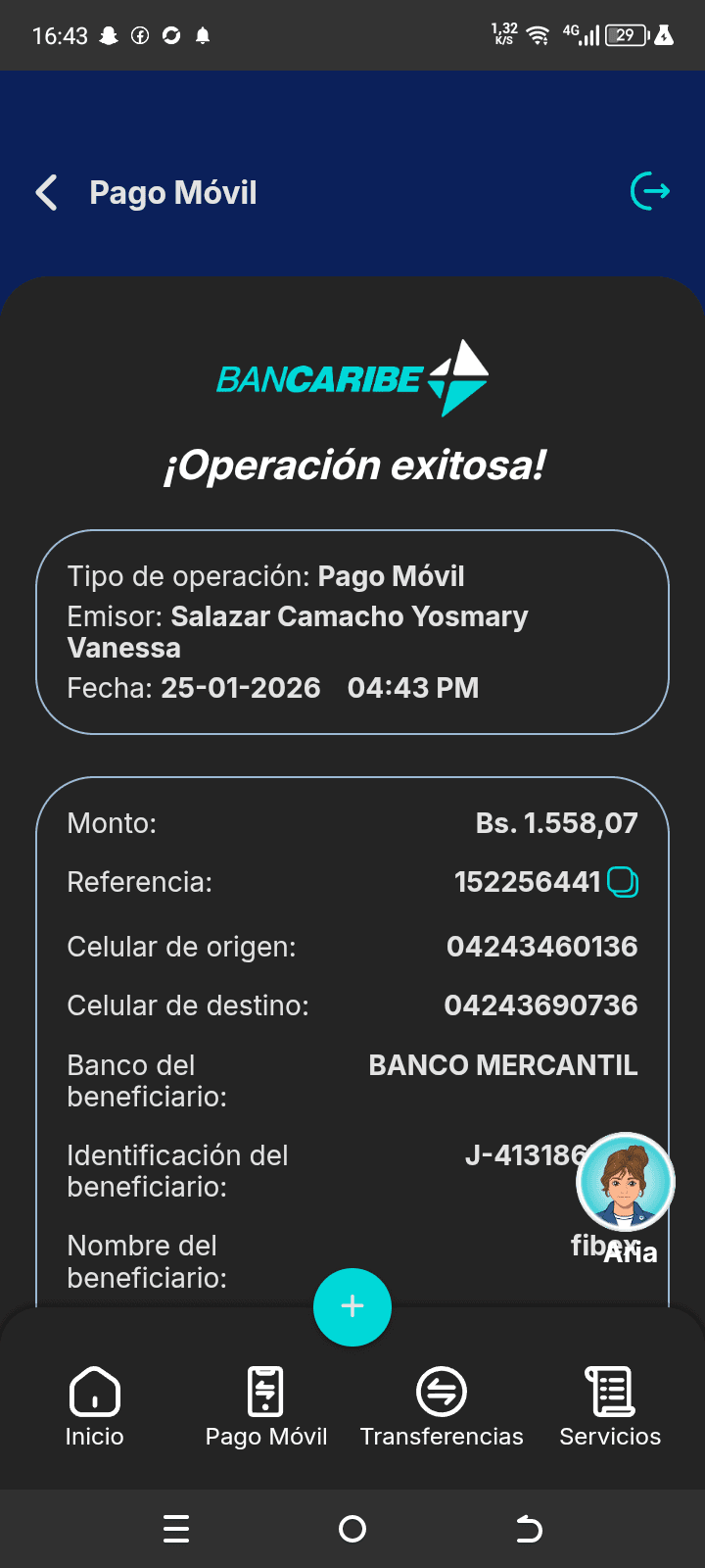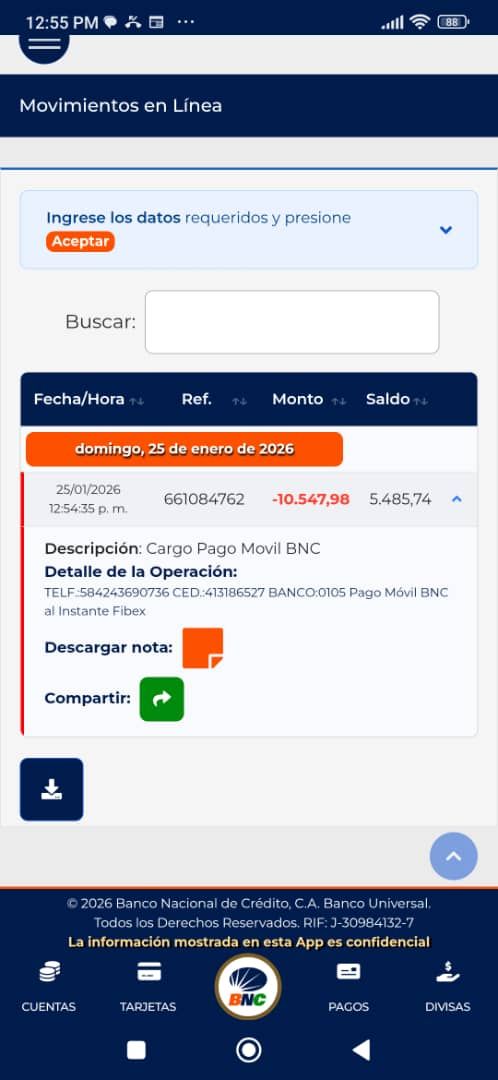 | A74010 | JEANCARLOS JOSE GALÍNDEZ AREVALO | 2026-01-25 | MERCANTIL-4381-ARAGU | 8484902332 | | 2,586.83 BS | 301.37 | REGISTRADO |