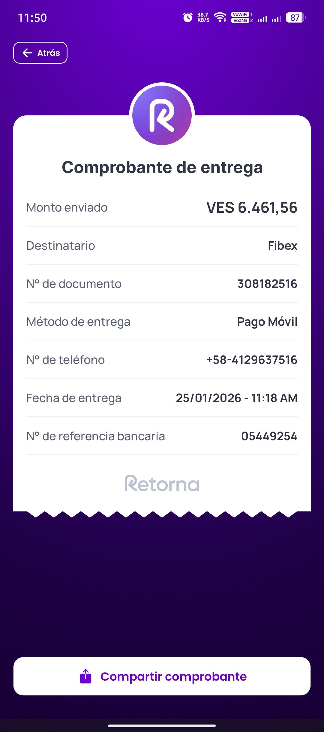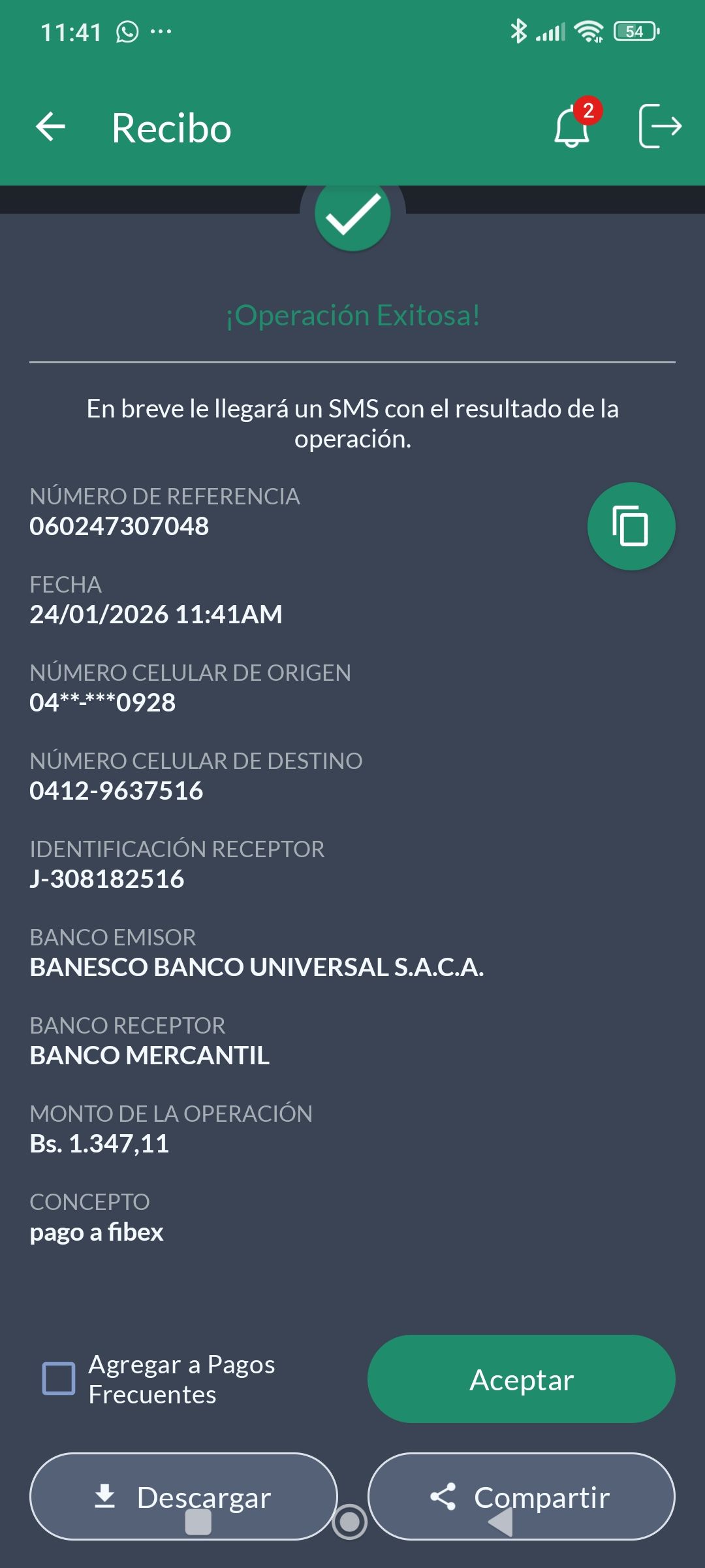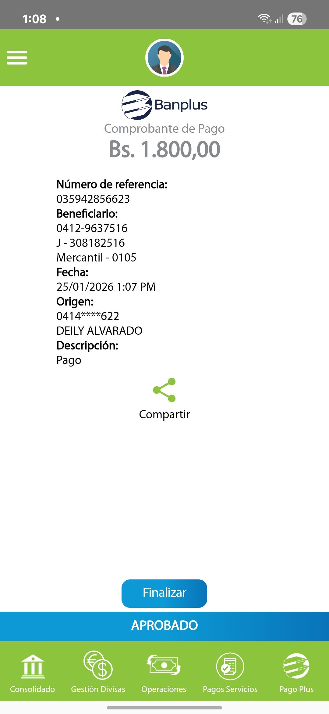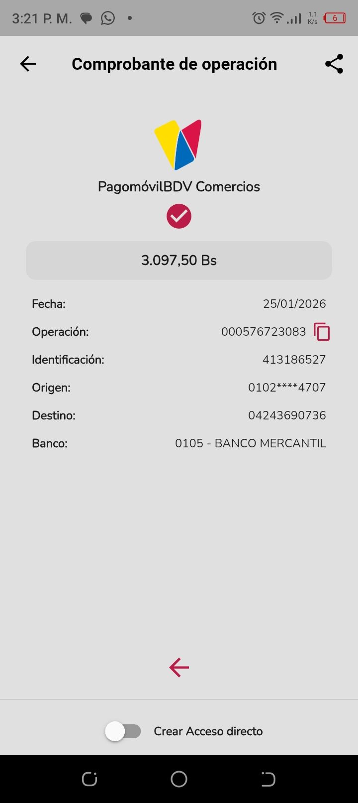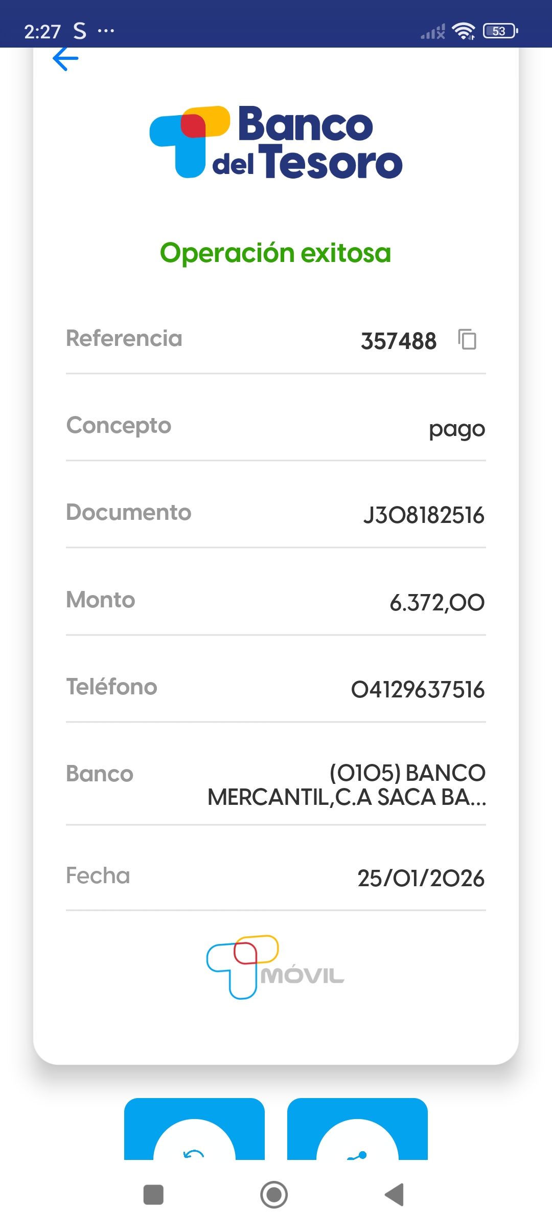 | A74010 | JEANCARLOS JOSE GALÍNDEZ AREVALO | 2026-01-25 | MERCANTIL-4381-ARAGU | 8484902332 | | 2,586.83 BS | 301.37 | REGISTRADO |