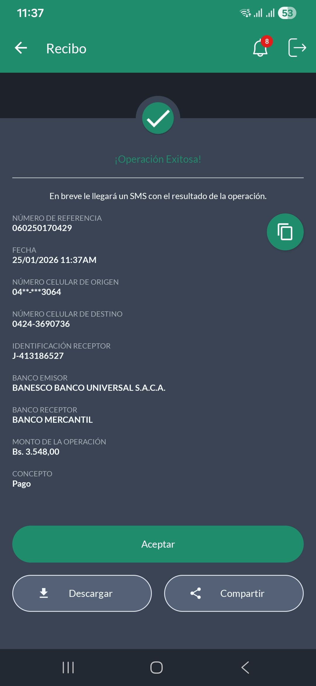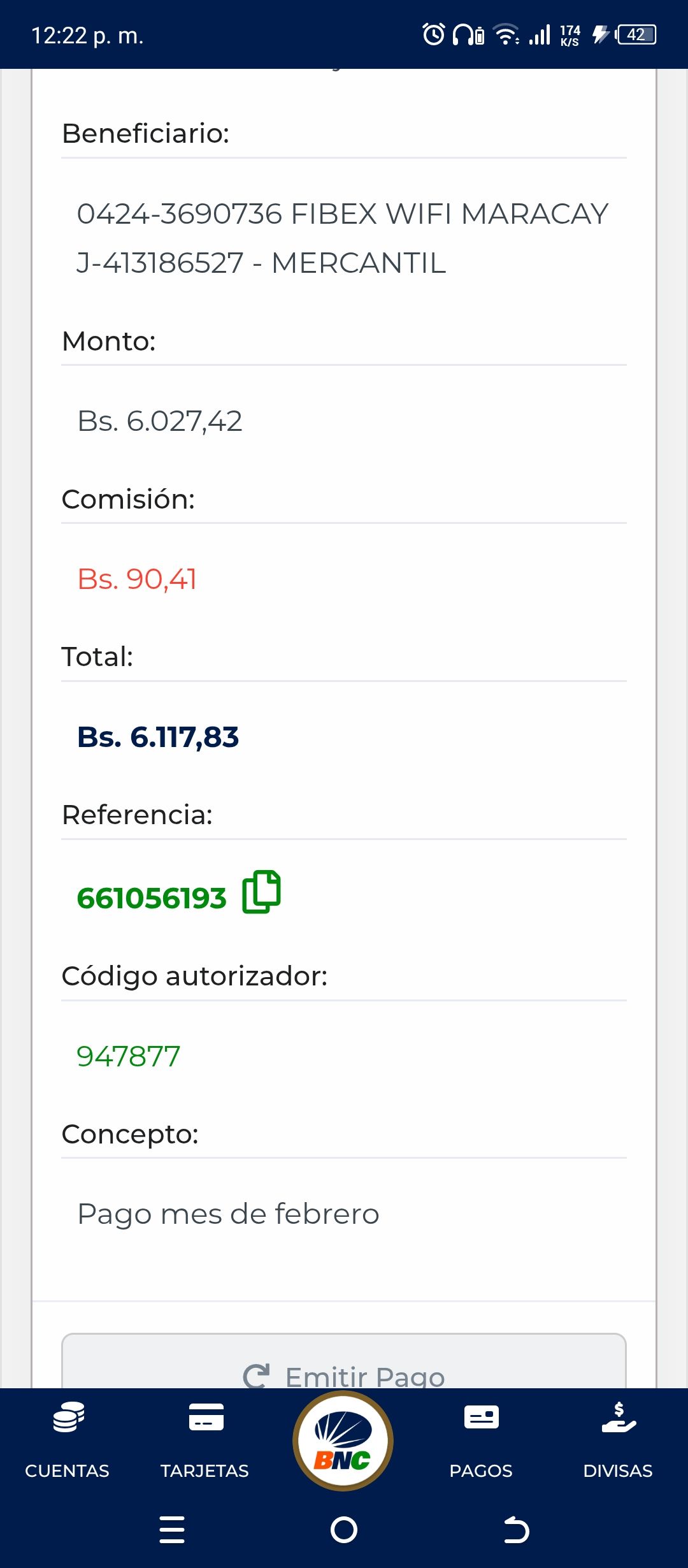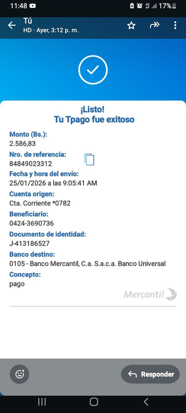 | A4931 | MARIA ALEJANDRA GARCIA DUARTE | 2026-01-25 | MERCANTIL-4381-ARAGU | 060250170429 | | 3,548.00 BS | 301.37 | REGISTRADO |