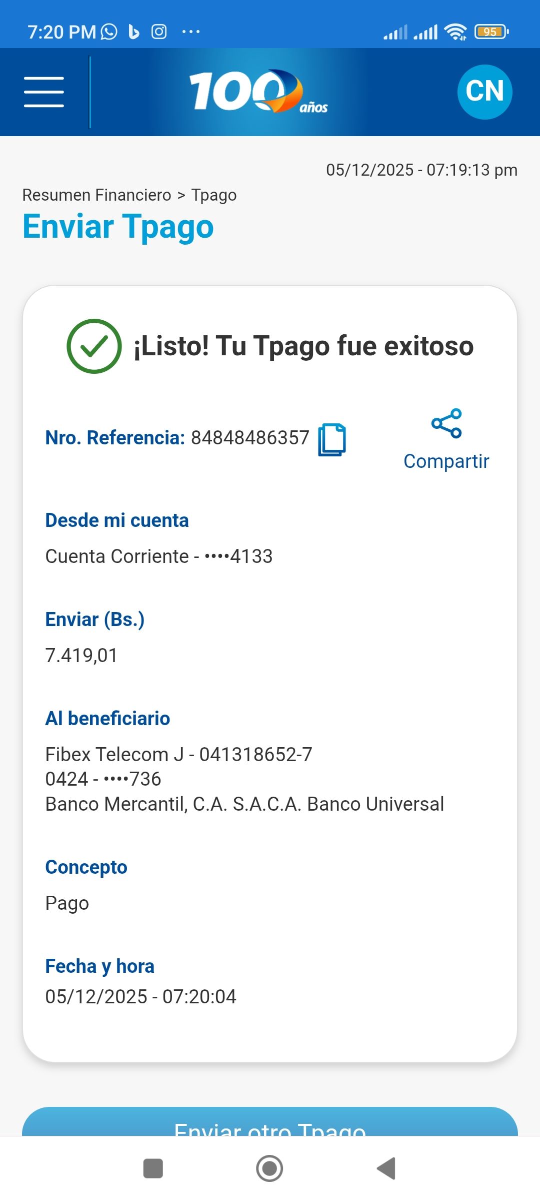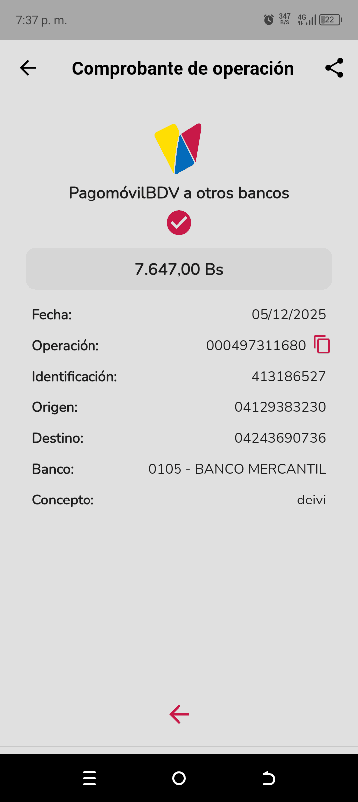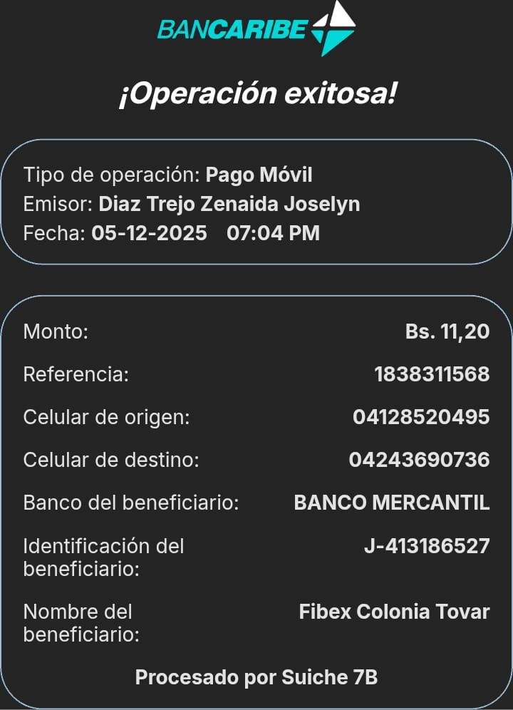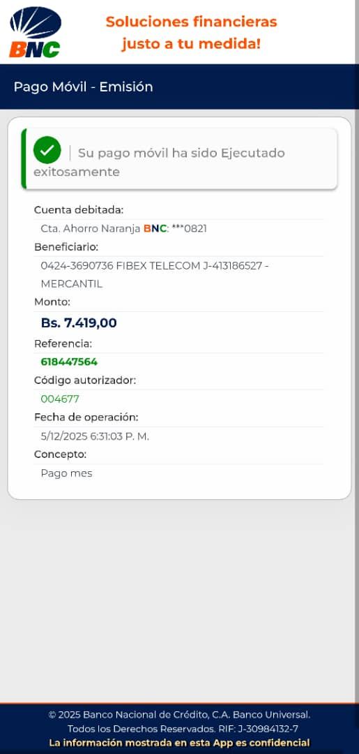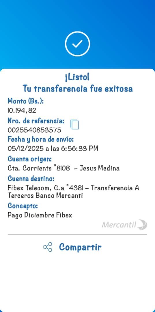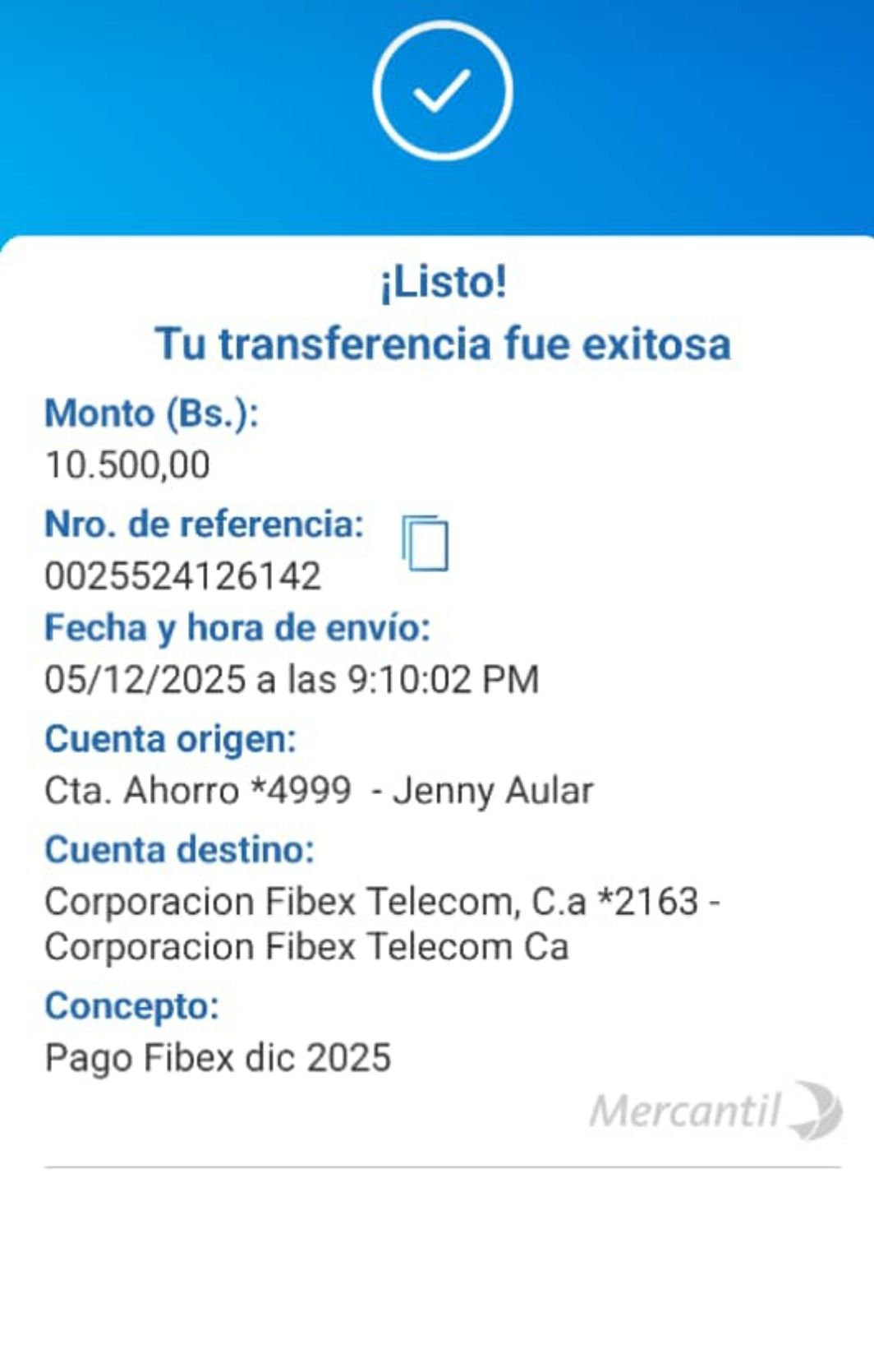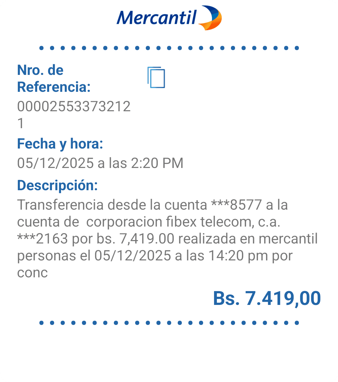 | V7621 | JULIO CESAR LUGO BOCHAGA | 2025-12-05 | MERCANTIL 2163 | 95183493 | | 11,644.00 BS | 247.30 | REGISTRADO |