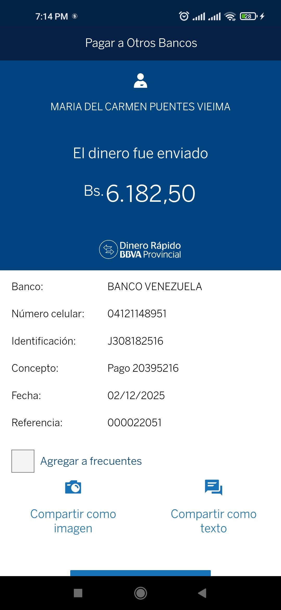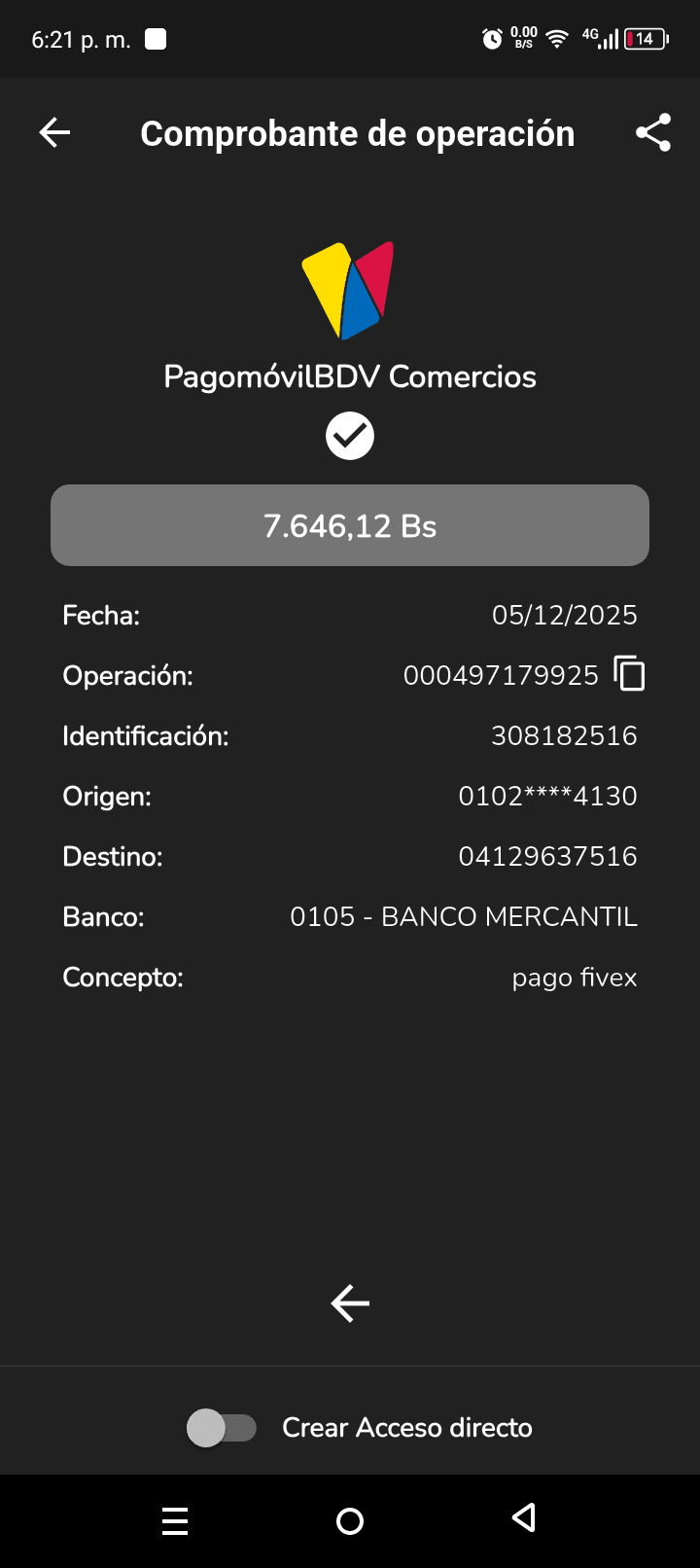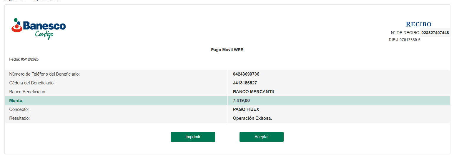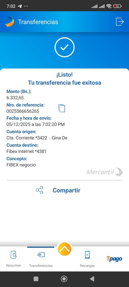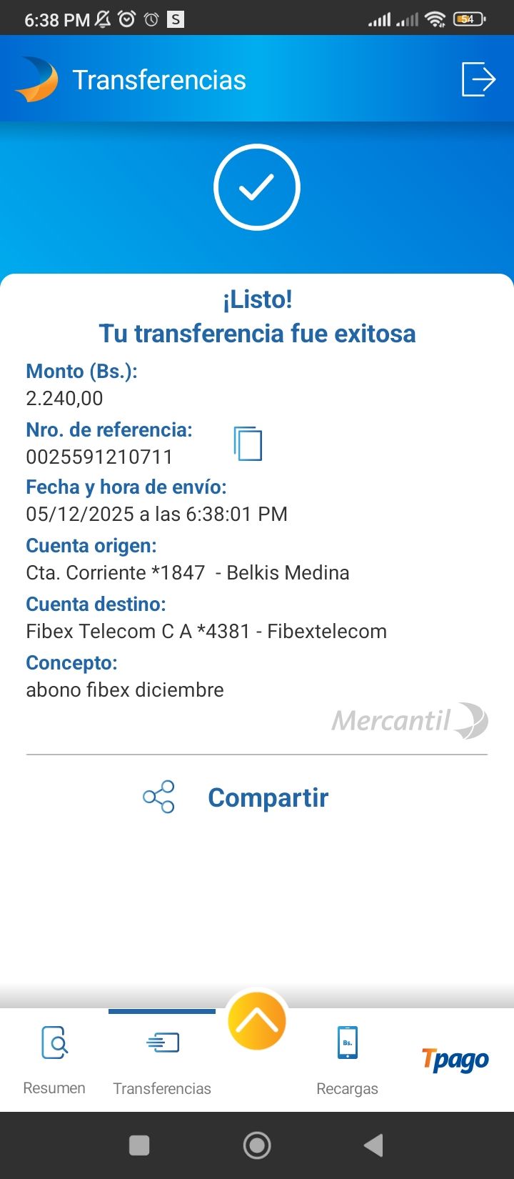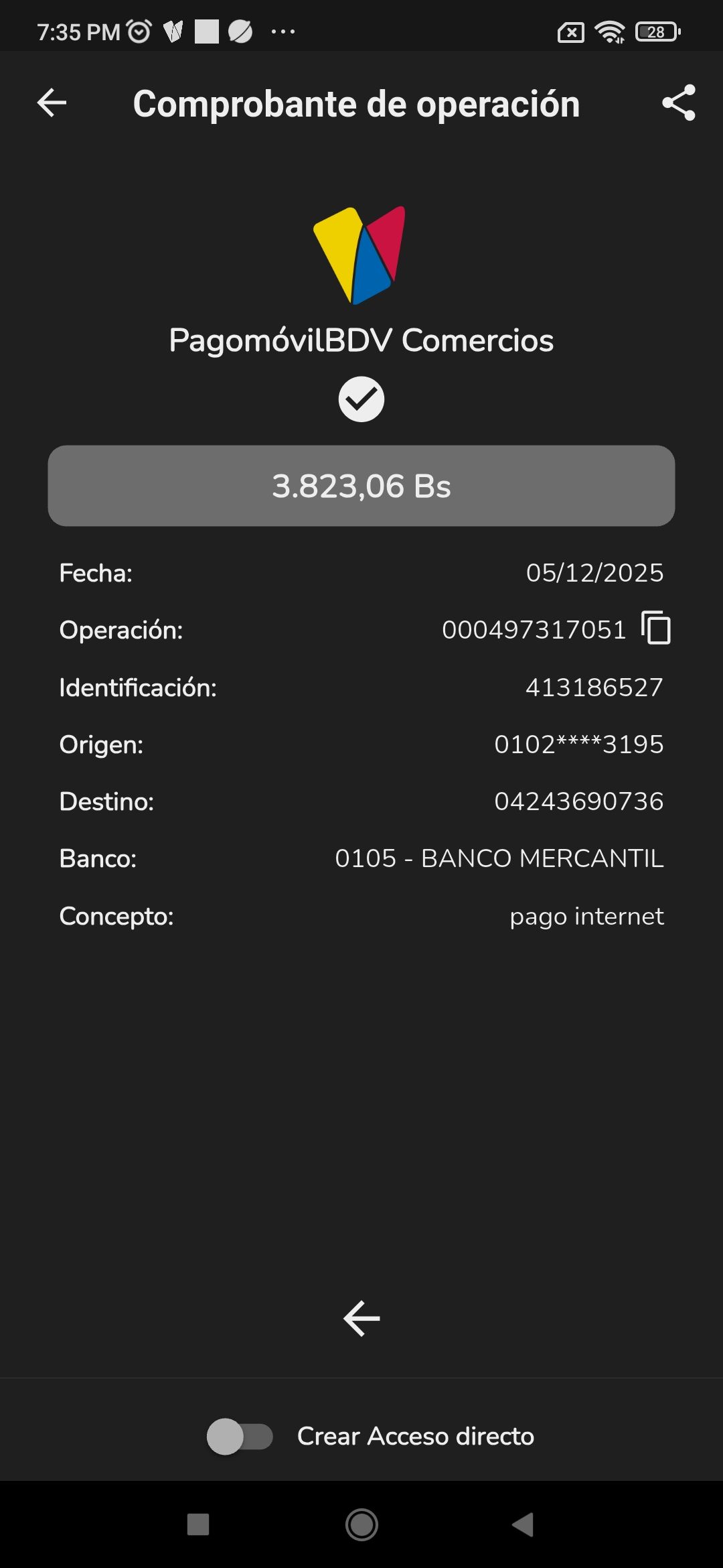 | V7621 | JULIO CESAR LUGO BOCHAGA | 2025-12-05 | MERCANTIL 2163 | 95183493 | | 11,644.00 BS | 247.30 | REGISTRADO |