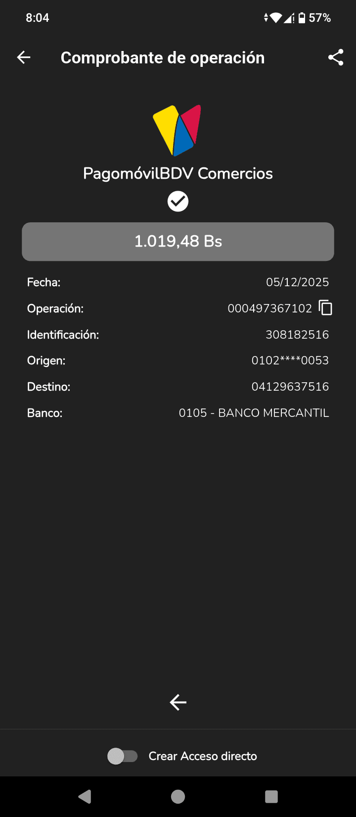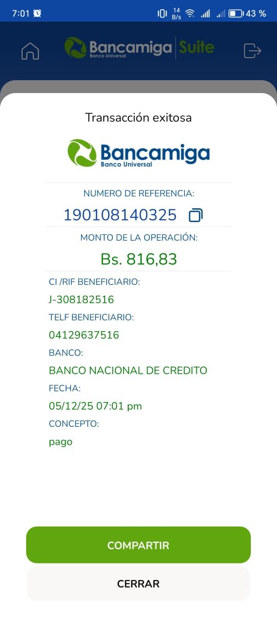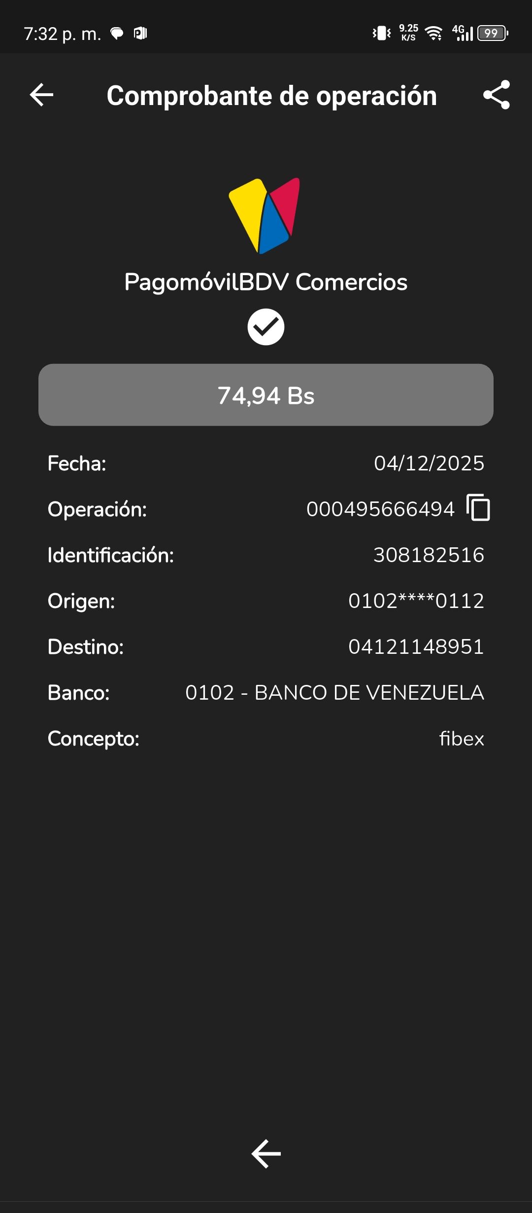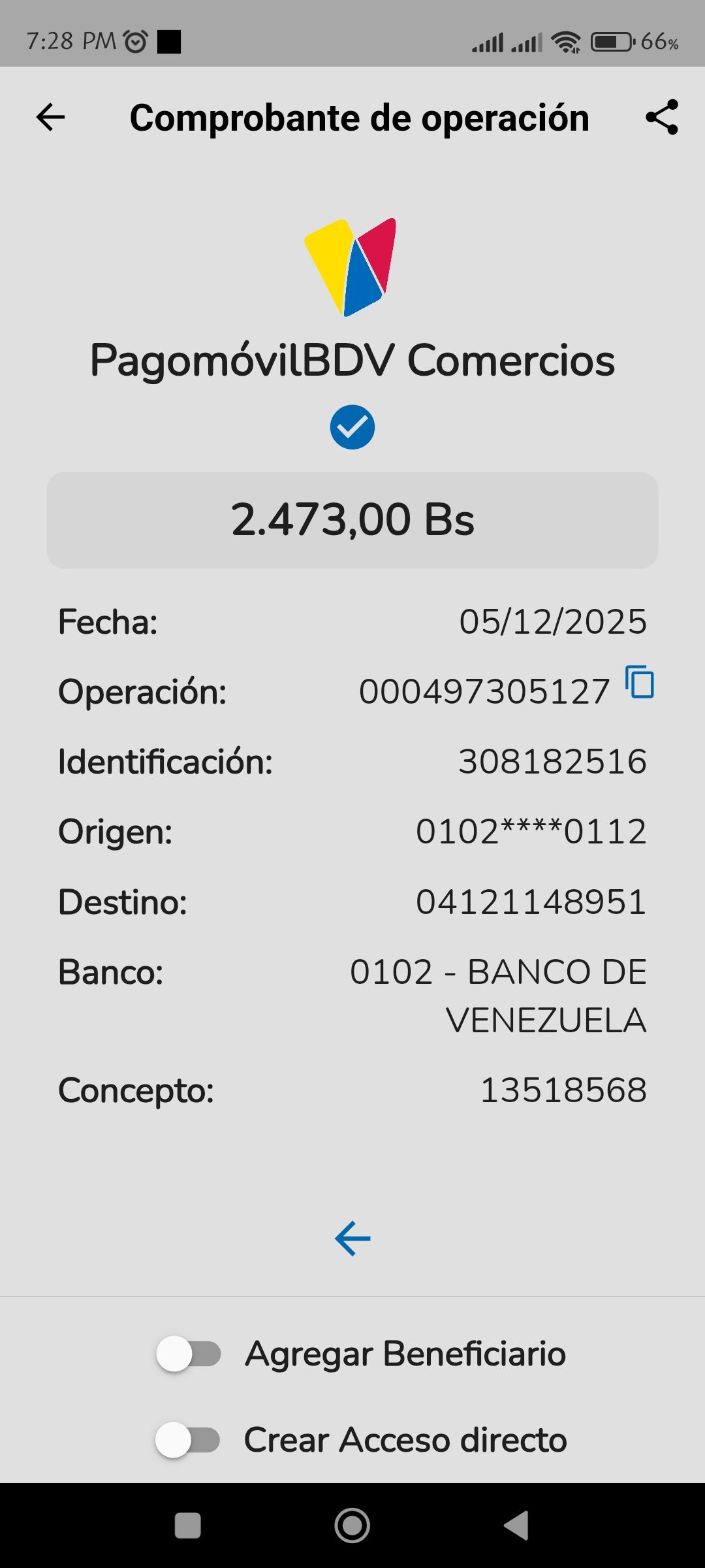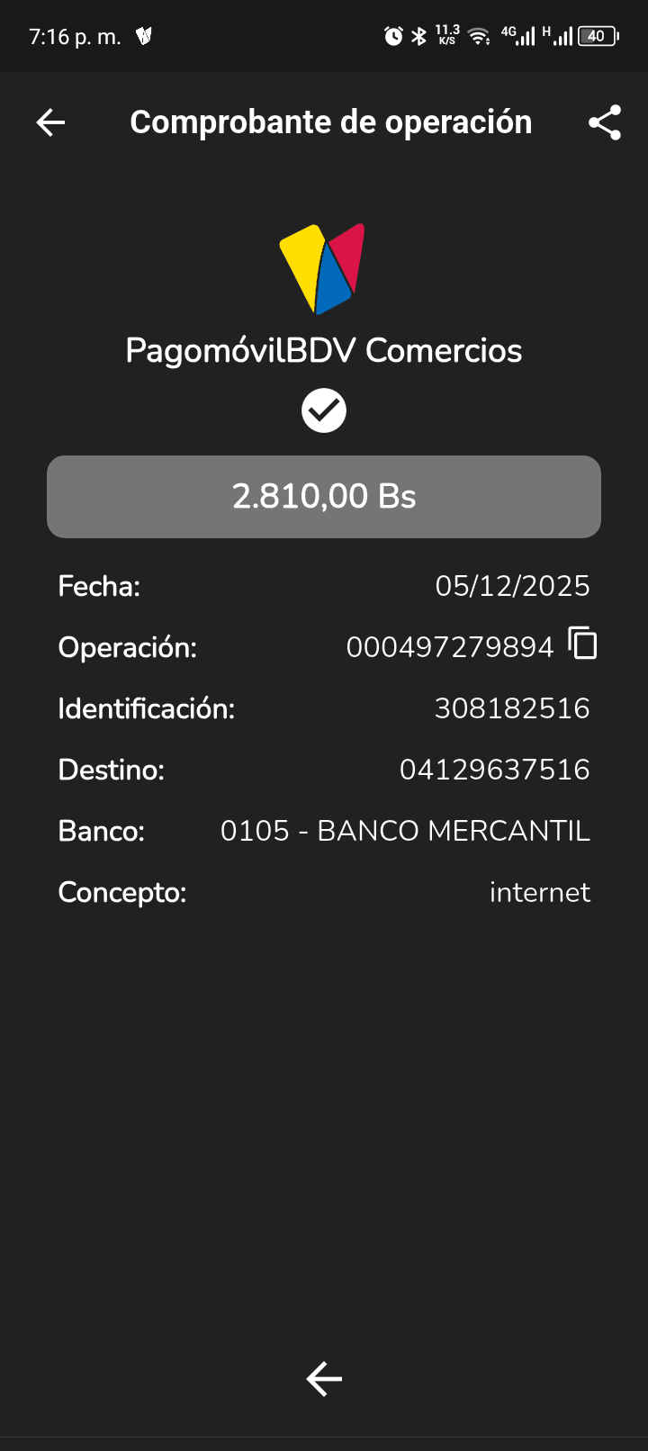 | V7621 | JULIO CESAR LUGO BOCHAGA | 2025-12-05 | MERCANTIL 2163 | 95183493 | | 11,644.00 BS | 247.30 | REGISTRADO |