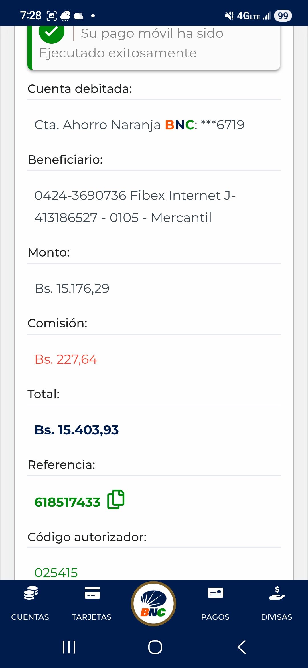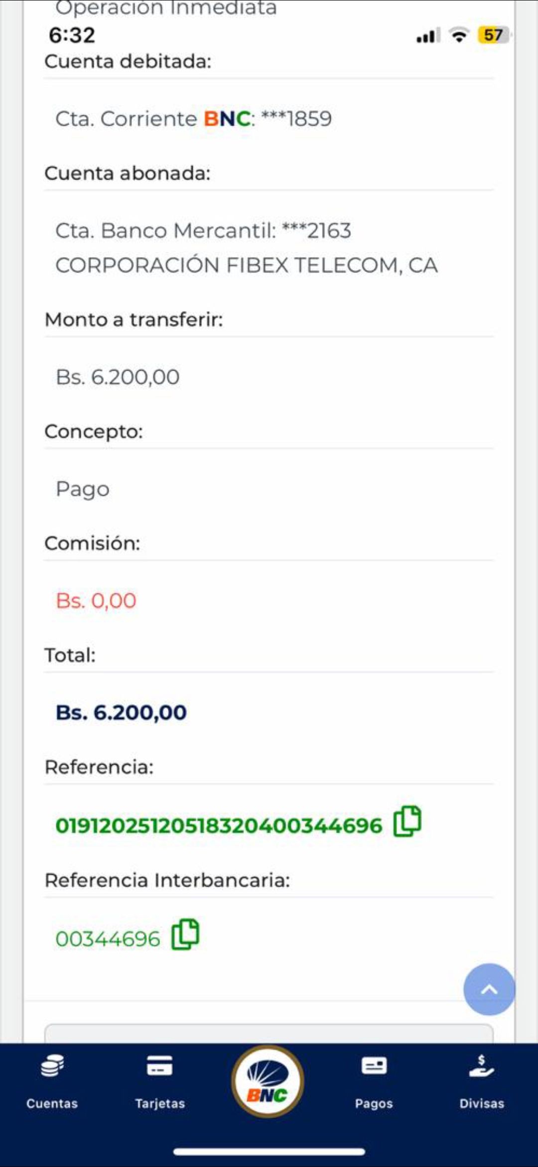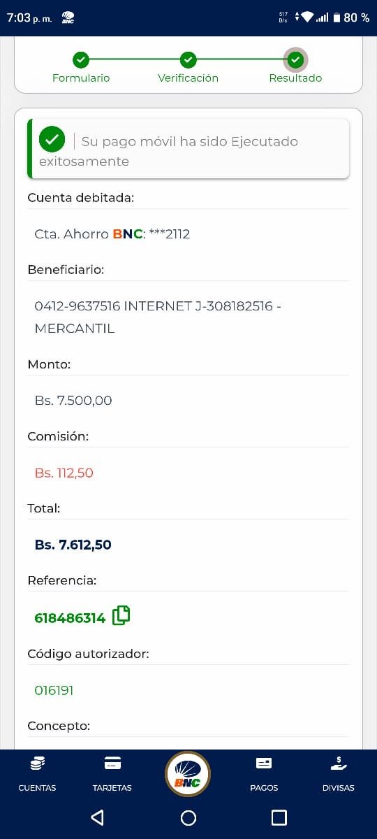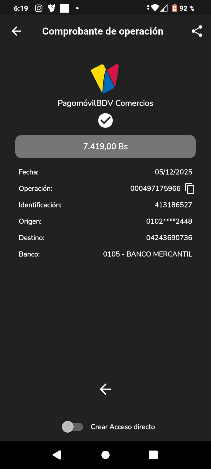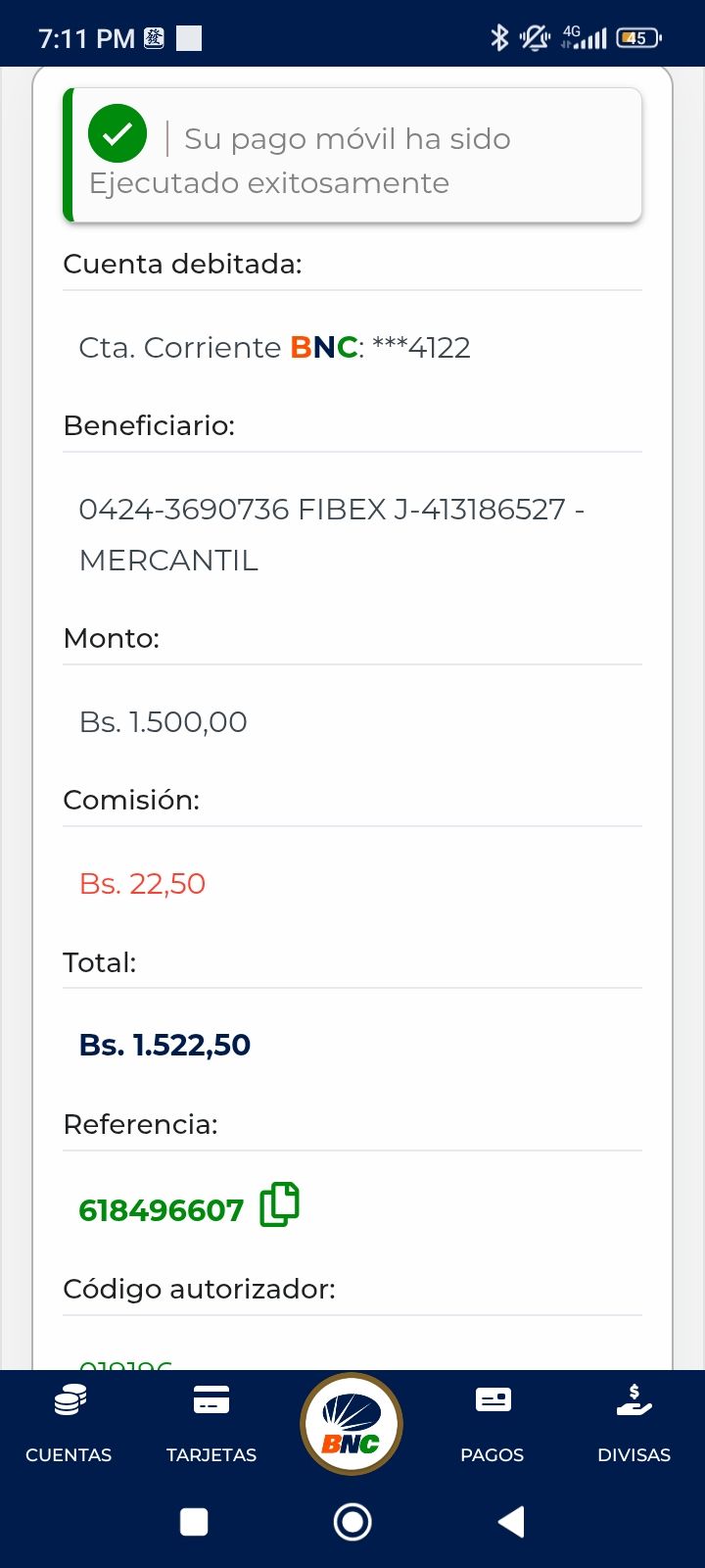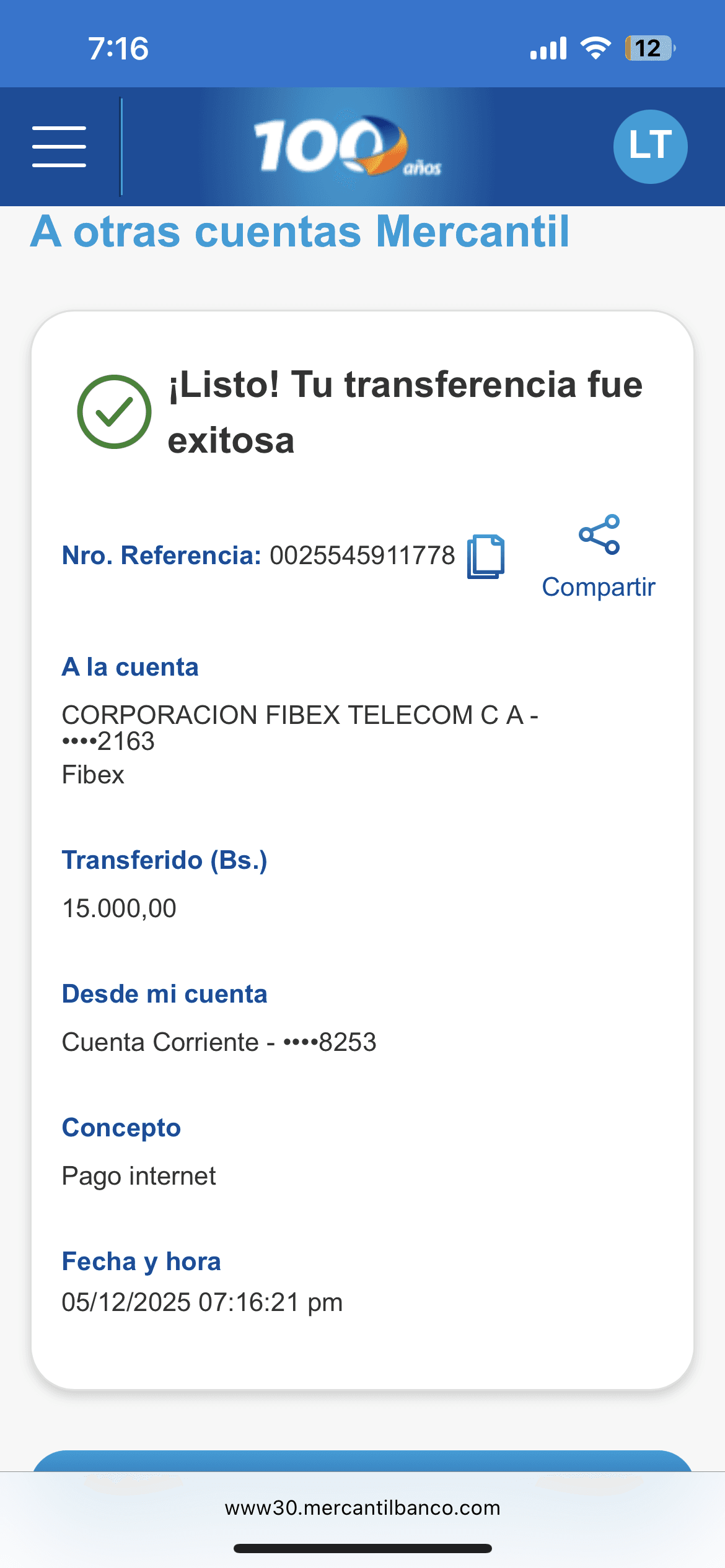| V7621 | JULIO CESAR LUGO BOCHAGA | 2025-12-05 | MERCANTIL 2163 | 95183493 | | 11,644.00 BS | 247.30 | REGISTRADO |