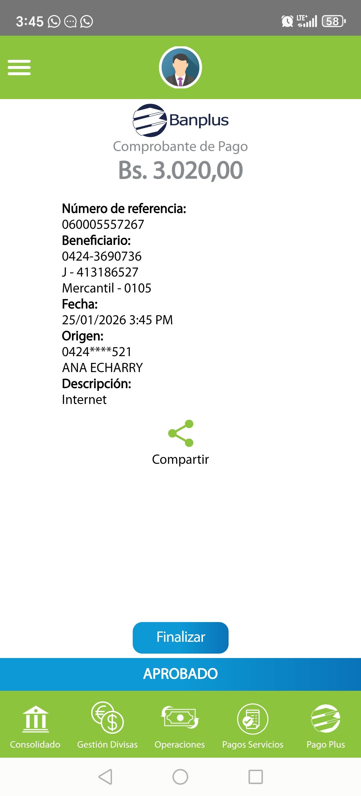 | A5908 | OLYMER ALEXANDER LEON COLMENAREZ | 2026-01-25 | MERCANTIL-4381-ARAGU | 661110290 | | 1,058.00 BS | 301.37 | REGISTRADO |
