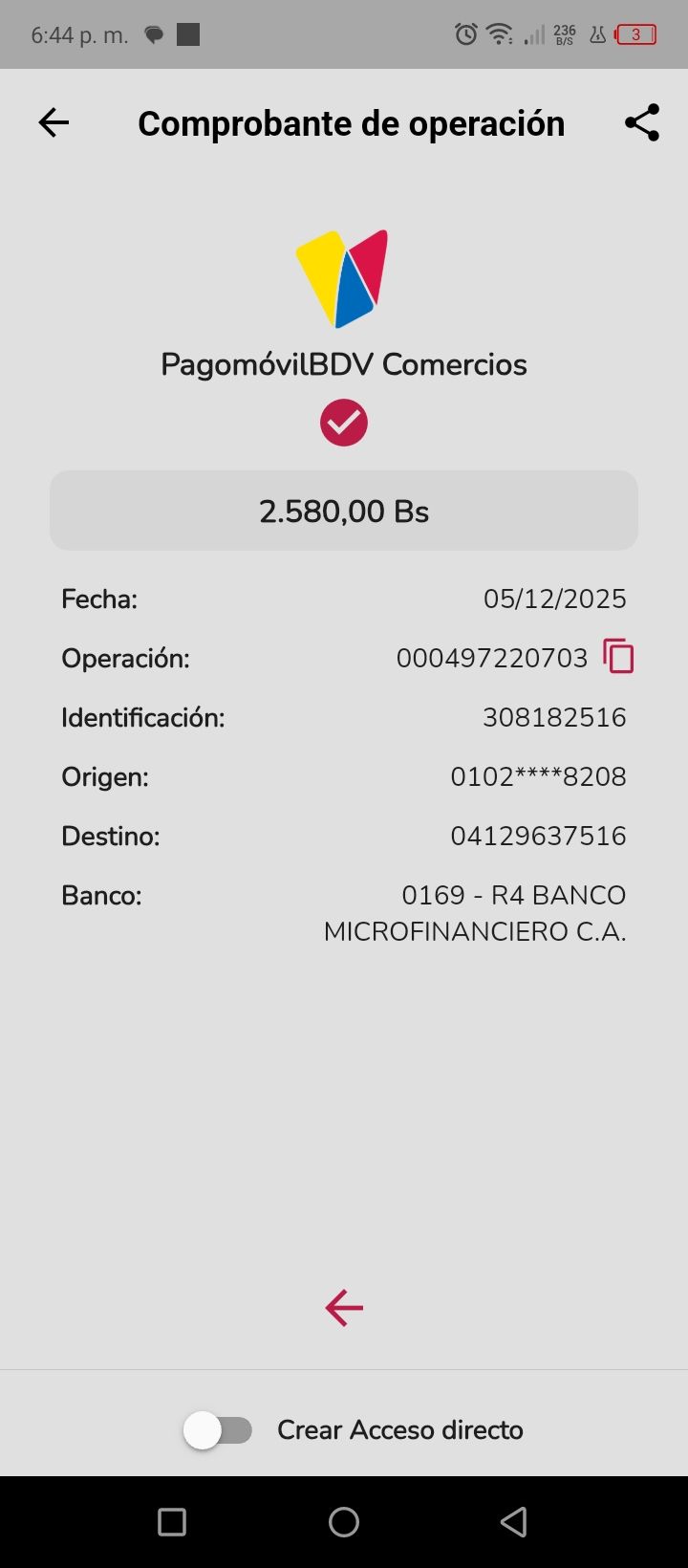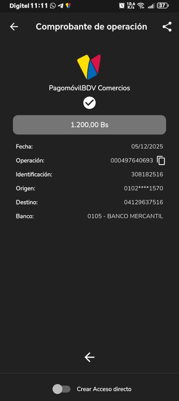 | V30673 | DAMELYS SIVADA MARIELYS | 2025-12-05 | MERCANTIL 2163 | 370117480878 | | 1,300.00 BS | 247.30 | REGISTRADO |