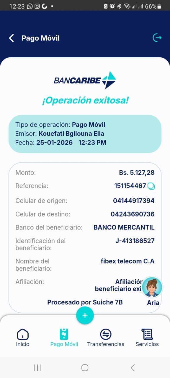 | A74261 | ELIA KOUEFATI BGILOUNA | 2026-01-25 | MERCANTIL-4381-ARAGU | 151154467 | | 5,127.28 BS | 301.37 | REGISTRADO |