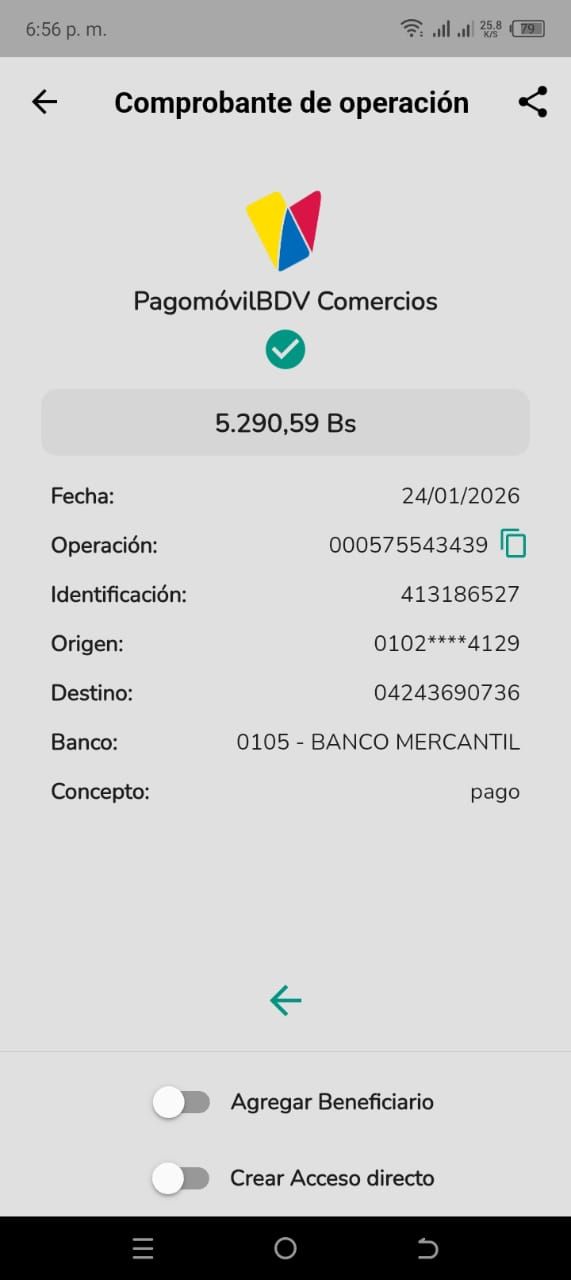 | A58381 | VICTORIA DEL CARMEN MOLINA PEREZ | 2026-01-25 | MERCANTIL-4381-ARAGU | 576723083 | | 3,097.50 BS | 301.37 | REGISTRADO |
