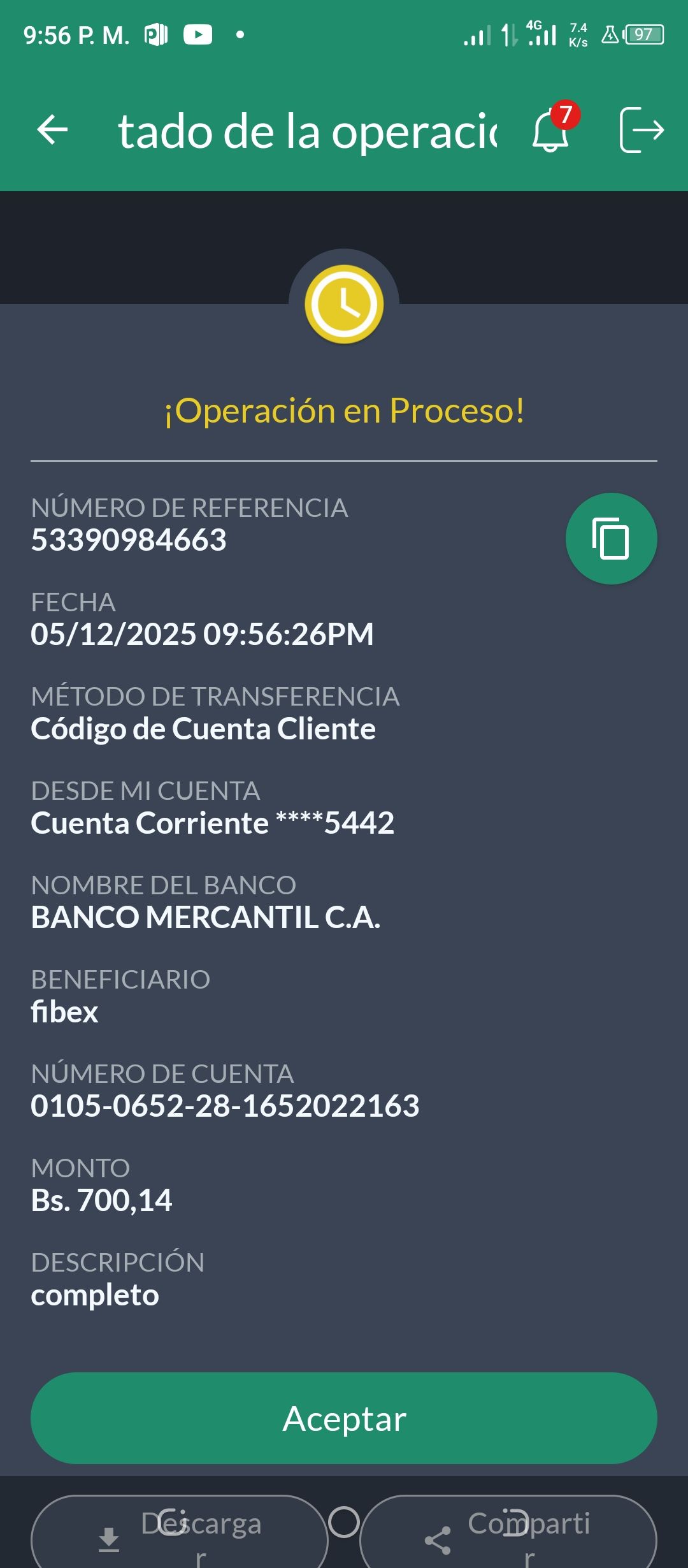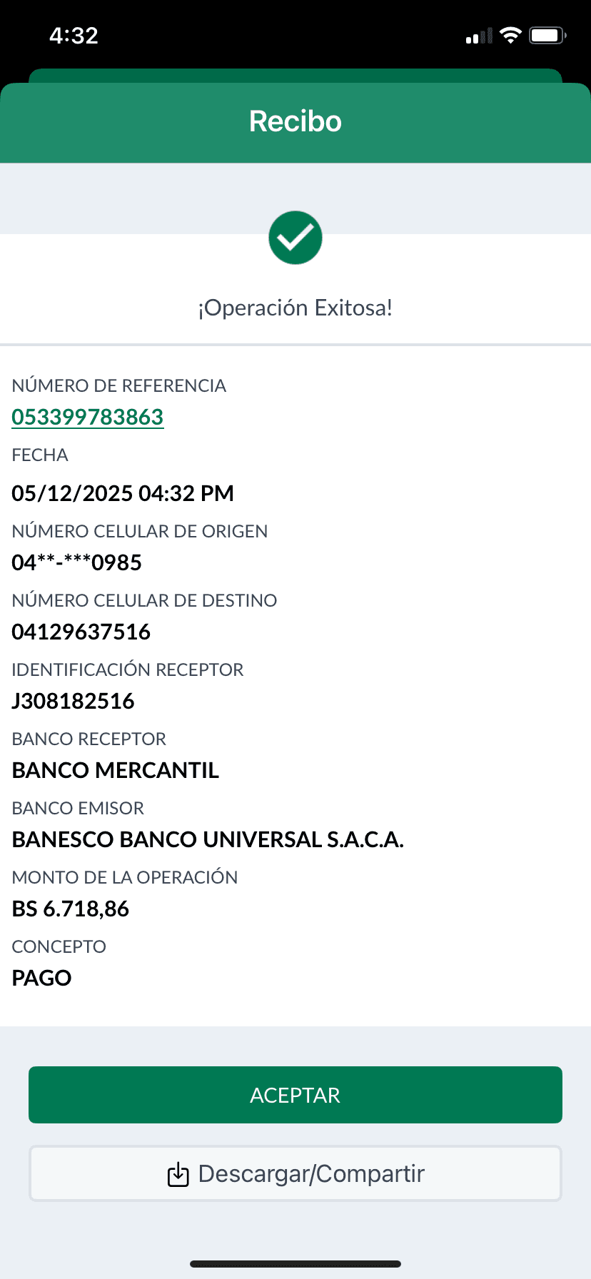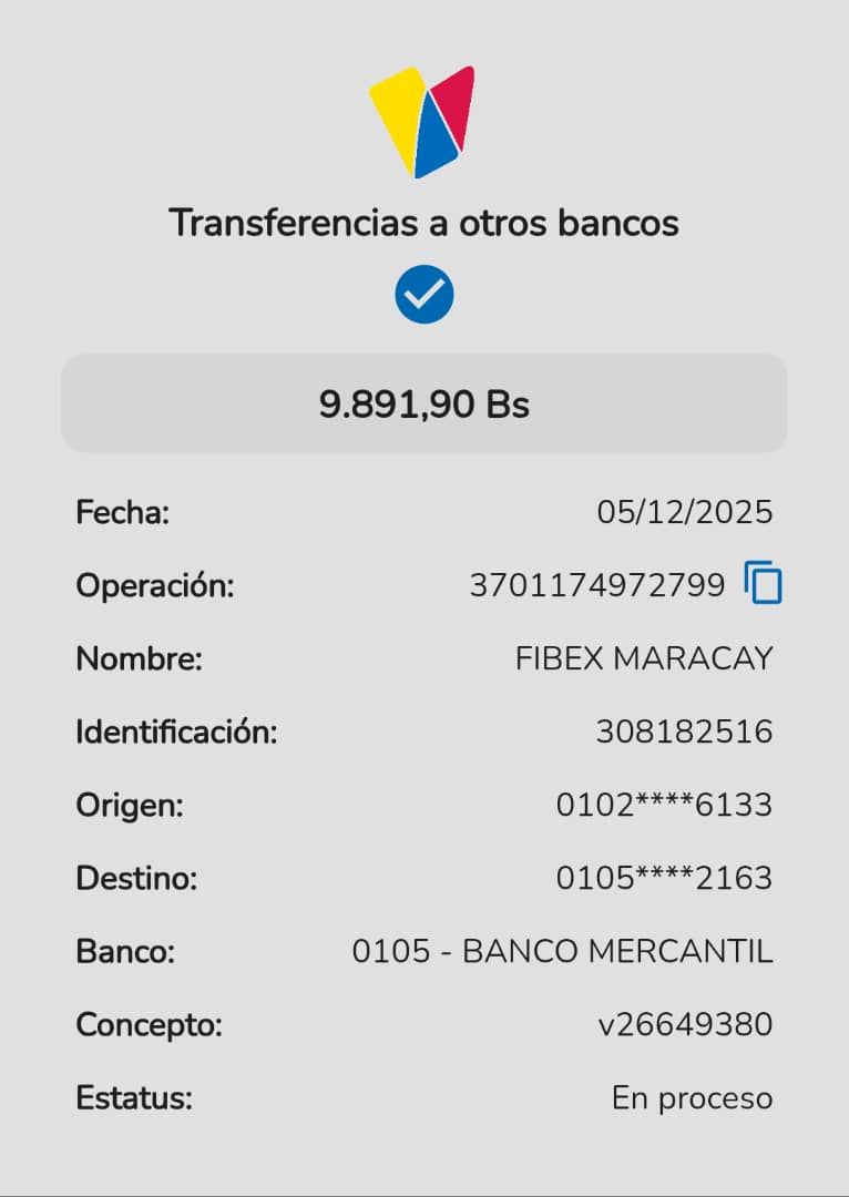 | A6988 | RICHARD SAMUEL CEPEDA MOSQUERA | 2025-12-05 | MERCANTIL-4381-ARAGU | 74972799 | | 9,891.90 BS | 247.30 | REGISTRADO |