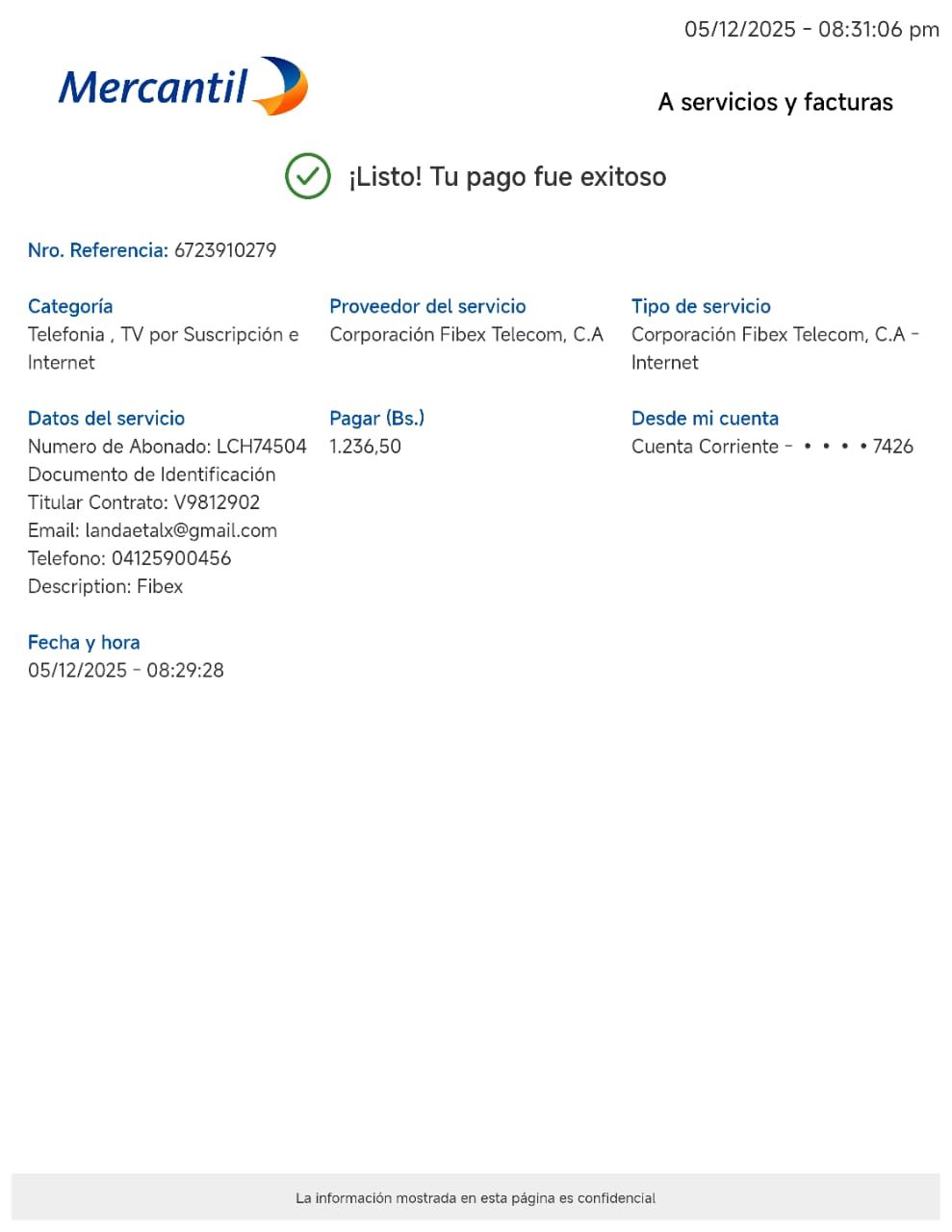 | LCH74504 | LUIS ENRIQUE LANDAETA GOMEZ | 2025-12-05 | MERCANTIL 2163 | 6723910279 | | 1,236.50 BS | 247.30 | REGISTRADO |