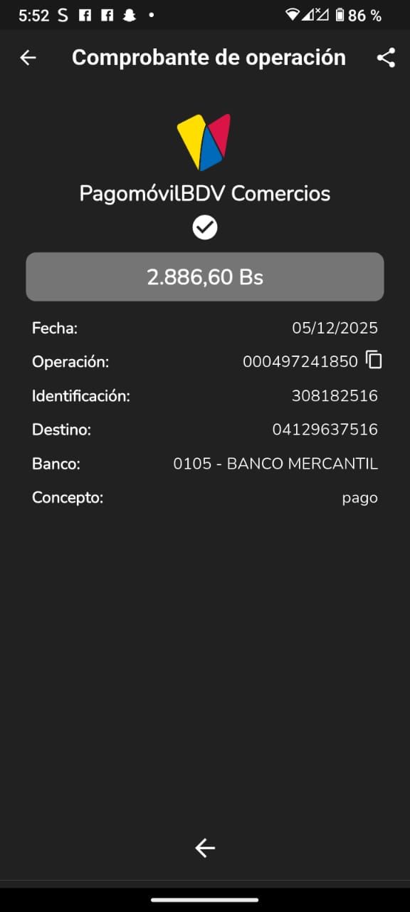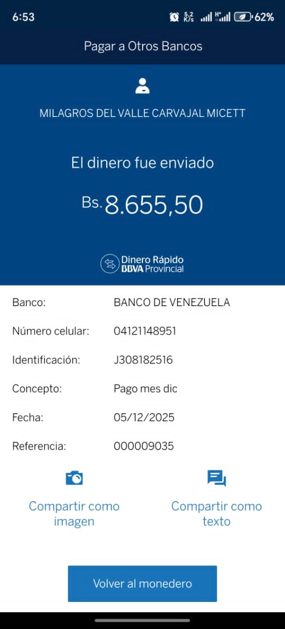 | LCH36942 | MILAGROS DEL VALLE CARVAJAL MICETT | 2025-12-05 | MERCANTIL 2163 | 123456 | | 8,655.50 BS | 247.30 | REGISTRADO |