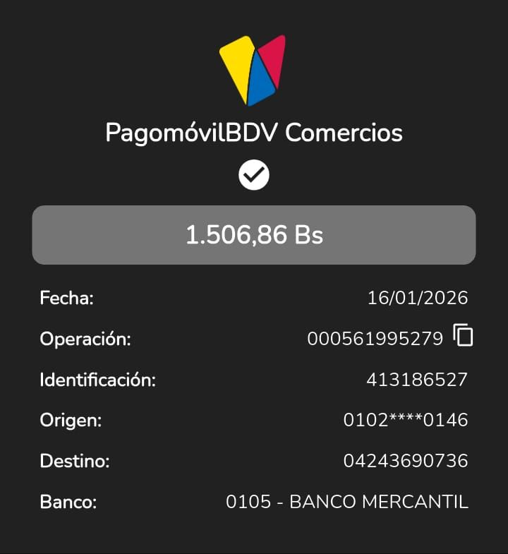 | A60105 | YAMILA COROMOTO YUSTI JAURE | 2026-01-25 | MERCANTIL-4381-ARAGU | 76741238 | | 9,041.11 BS | 301.37 | REGISTRADO |