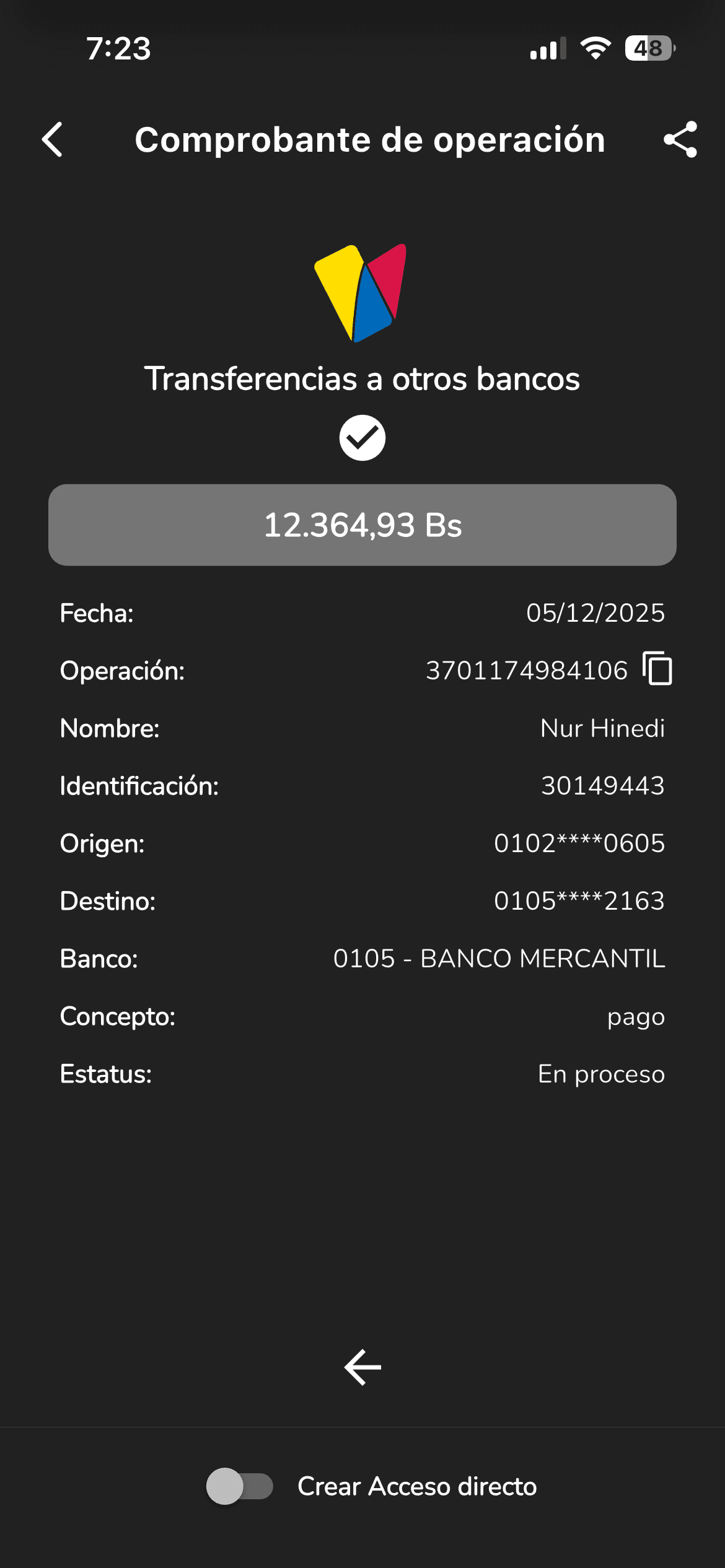 | V69102 | MAJEDAH HINEDI DE ELSHIBLI | 2025-12-05 | MERCANTIL 2163 | 74984106 | | 12,364.93 BS | 247.30 | REGISTRADO |