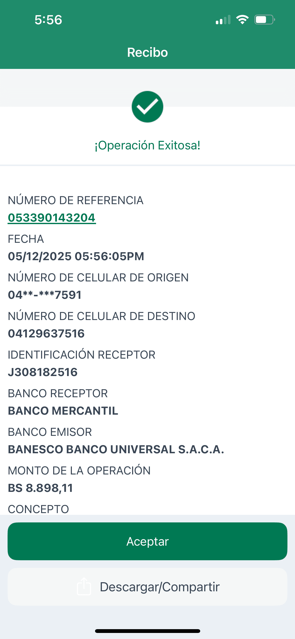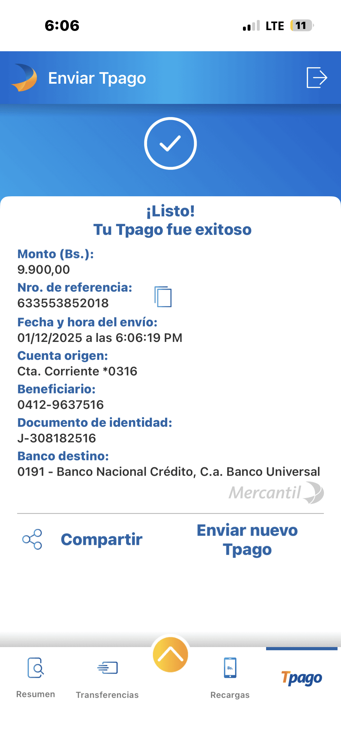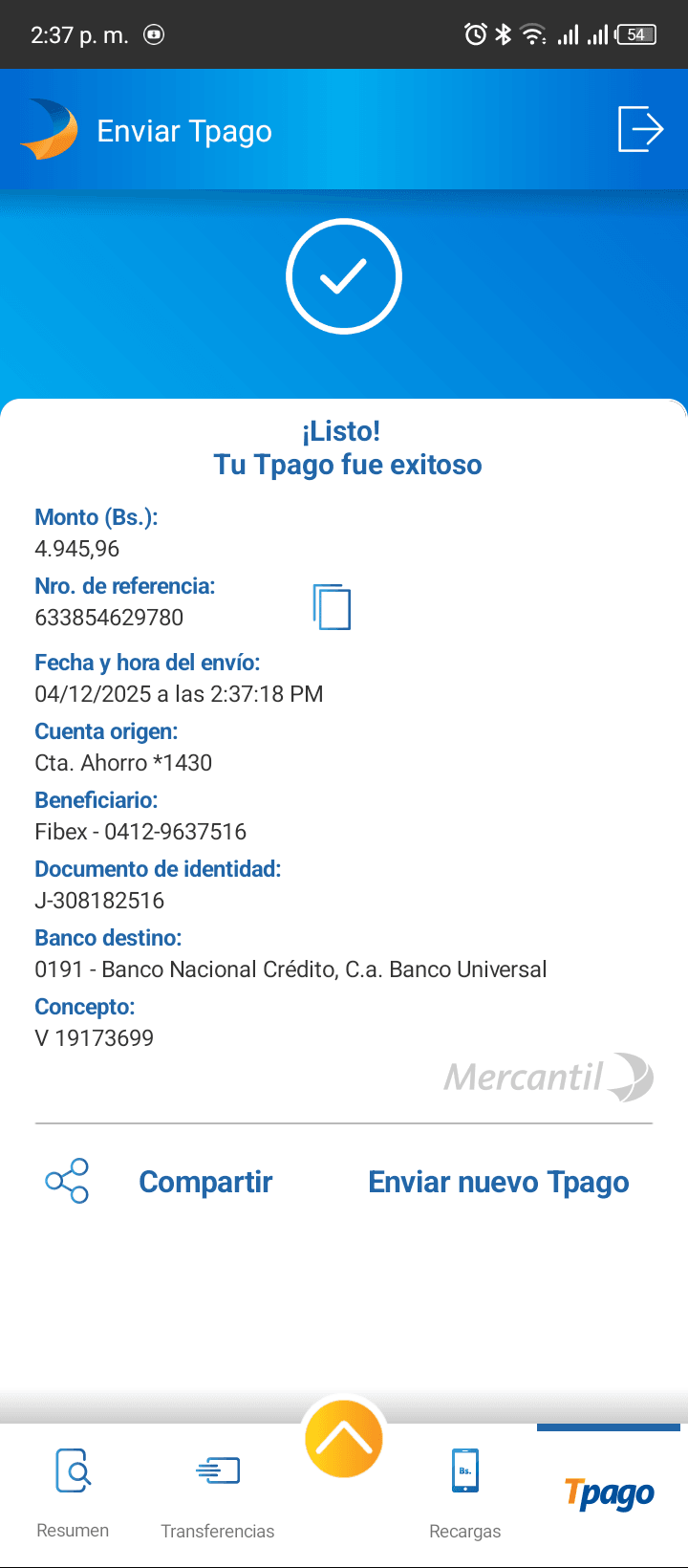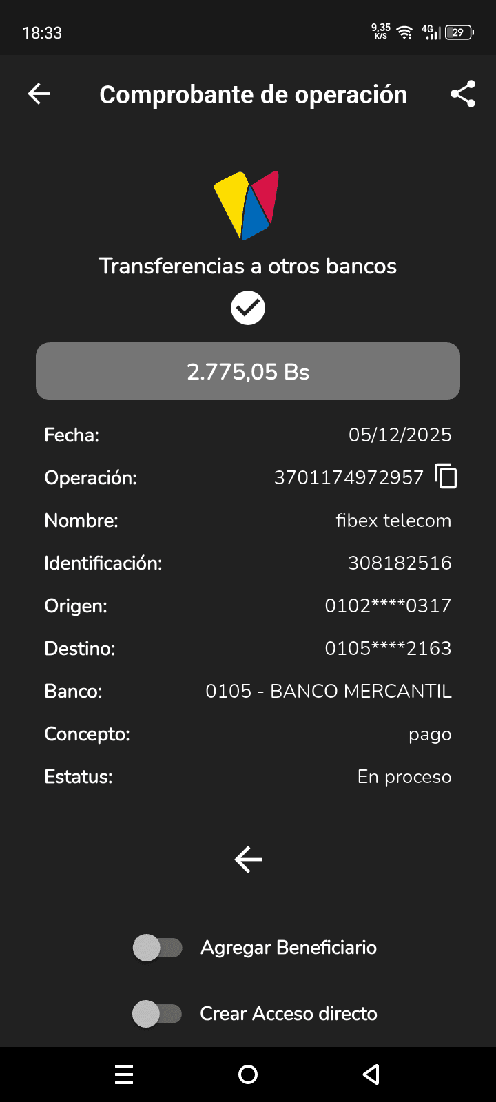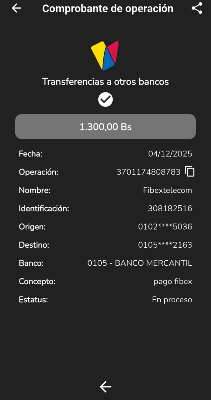 | LCH72355 | ELVIS ROGELIO RUIZ VELASQUEZ | 2025-12-05 | MERCANTIL 2163 | 97231611 | — | 6,180.50 BS | 247.30 | REGISTRADO |