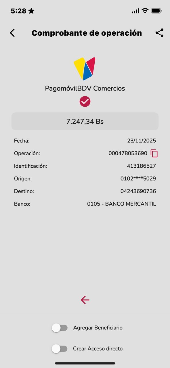 | A56541 | DAVID RAPHIEL RUMBO MACKENZIE | 2025-12-05 | MERCANTIL-4381-ARAGU | 18447564 | | 7,419.00 BS | 247.30 | REGISTRADO |