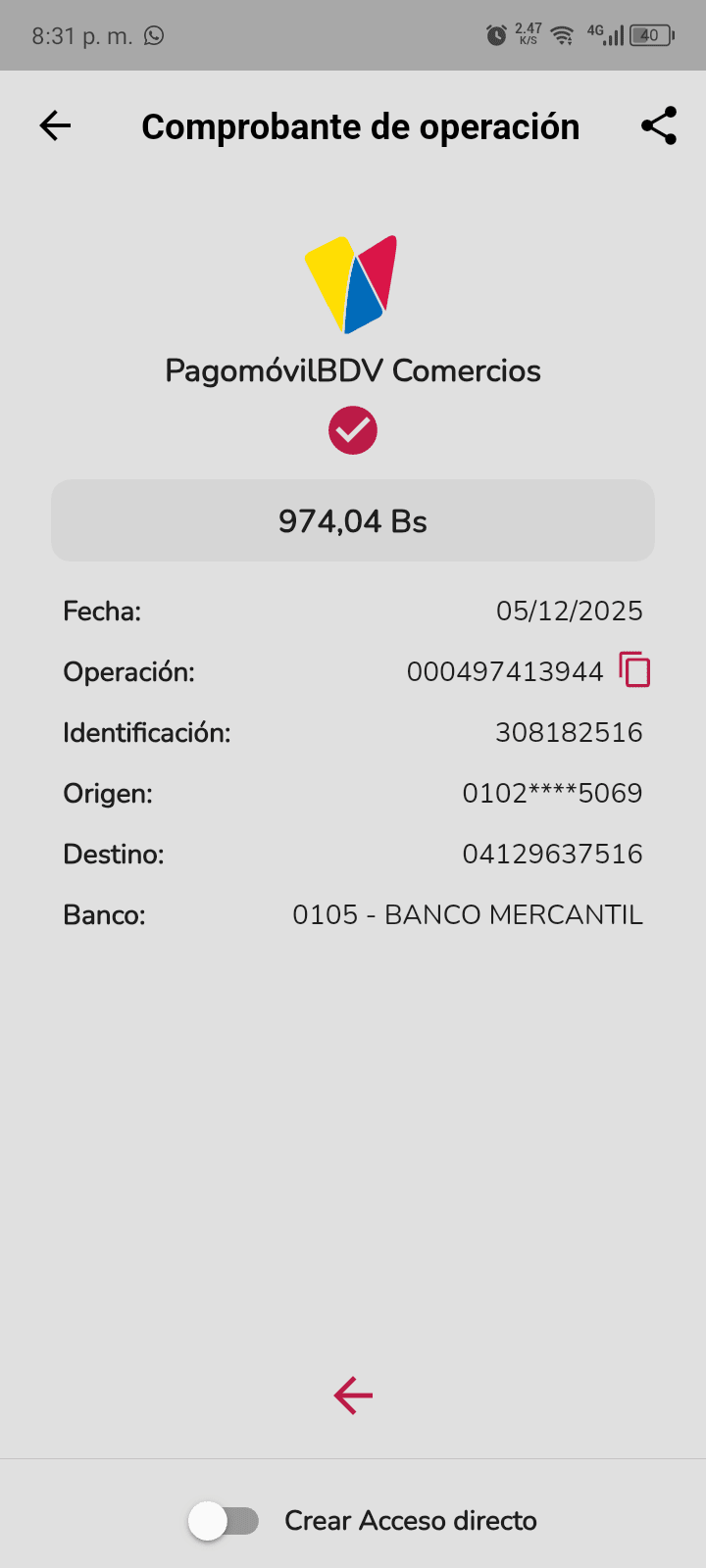| A40504 | CARMEN HIPOLITA NAVAS AMARO | 2025-12-05 | MERCANTIL-4381-ARAGU | 48486357 | | 7,419.01 BS | 247.30 | REGISTRADO |