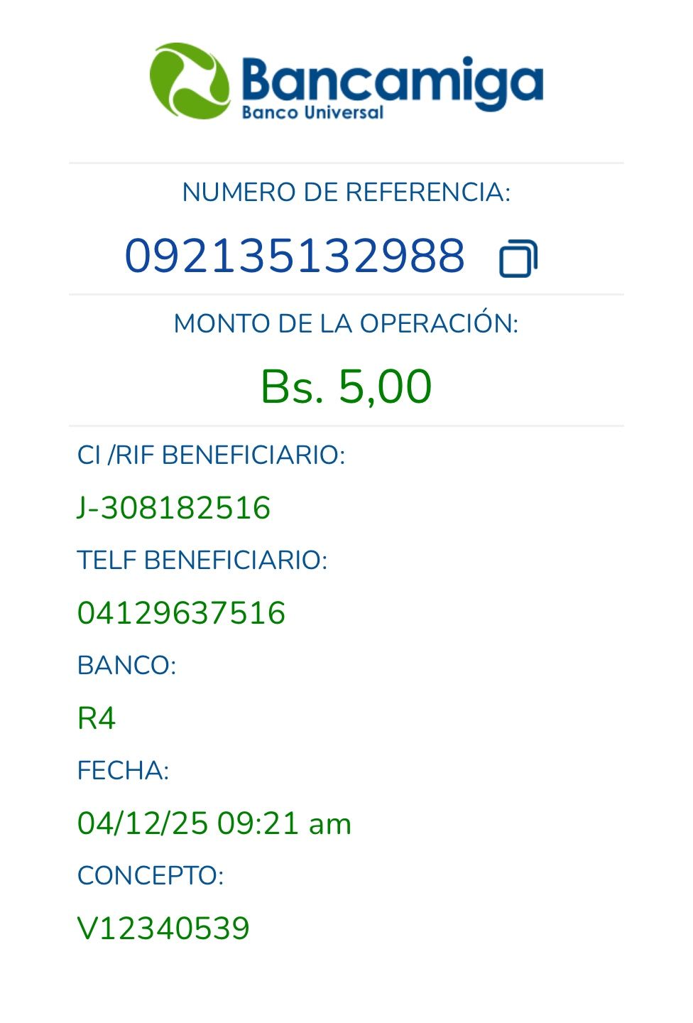 | A23399 | LUISANA CAROLINA DE LA COROMOTO TORREALBA RODRIGUEZ | 2025-12-05 | MERCANTIL-4381-ARAGU | 2554591177 | | 15,000.00 BS | 247.30 | REGISTRADO |
