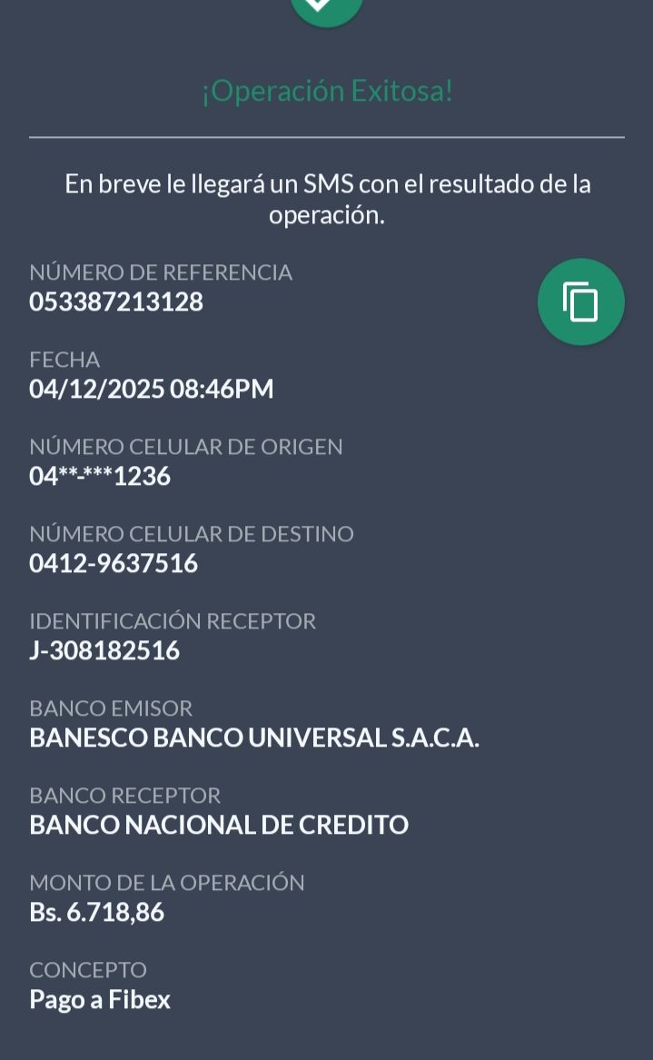 | VC3738 | YORMELIS MICHELL PéREZ MARTINEZ | 2025-12-05 | MERCANTIL 2163 | 97367102 | | 1,019.48 BS | 247.30 | REGISTRADO |