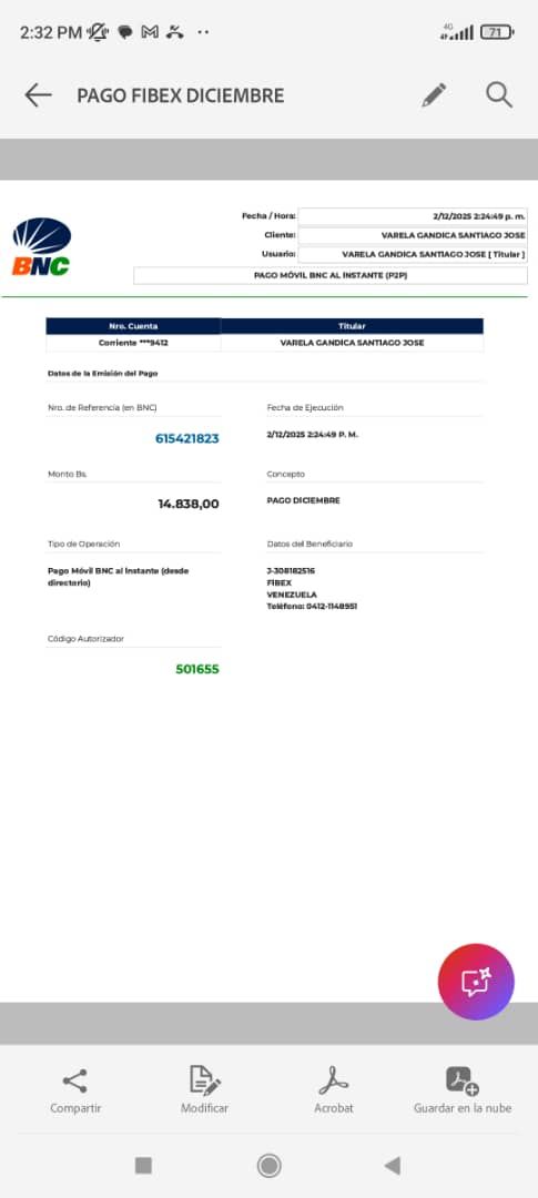 | A71305 | MARIA ALEJANDRA DIAZ SEIJAS | 2025-12-05 | BNC 6064 | 18517433 | | 15,176.29 BS | 247.30 | REGISTRADO |