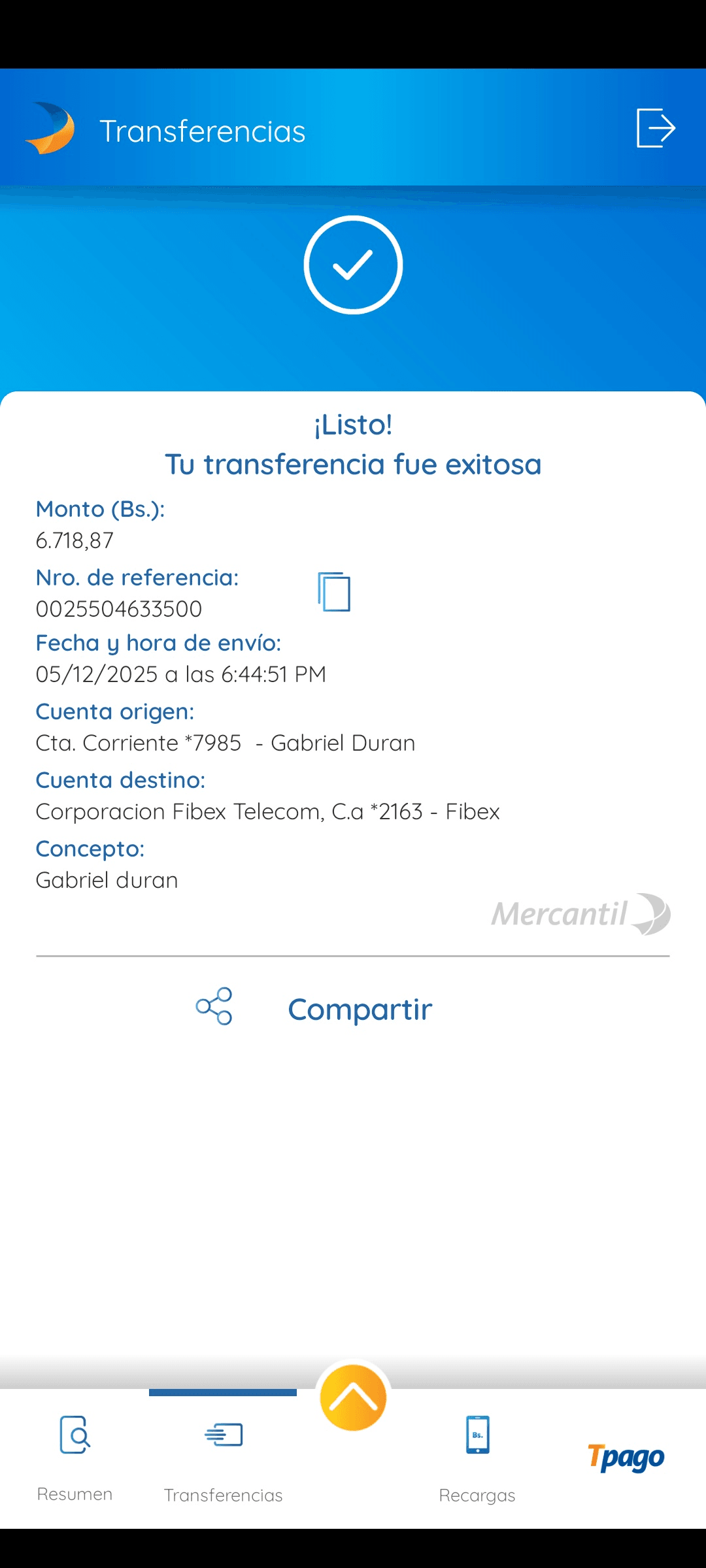 | V20654 | GABRIEL ALEJANDRO DURAN D ACOSTA | 2025-12-05 | MERCANTIL 2163 | 50463350 | | 6,718.87 BS | 247.30 | REGISTRADO |