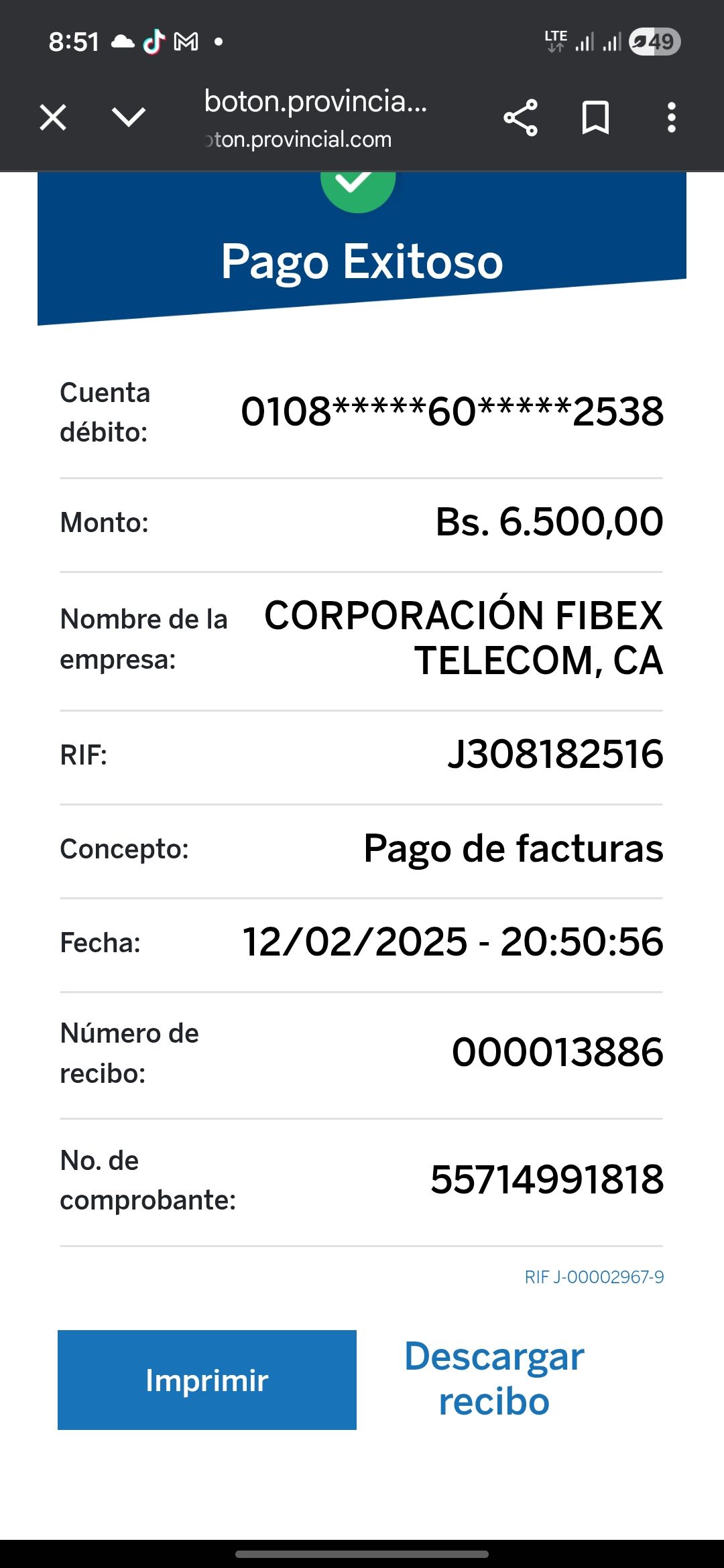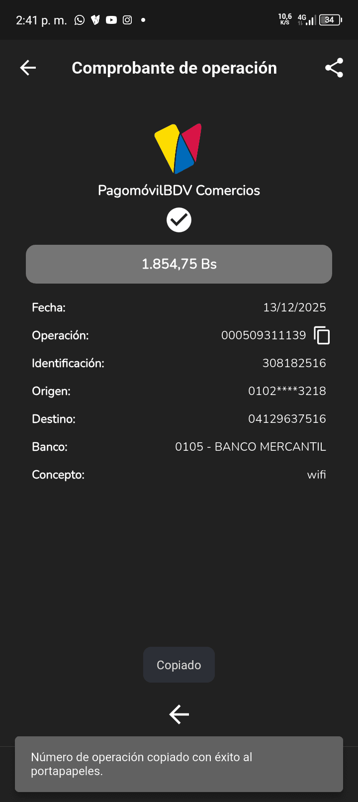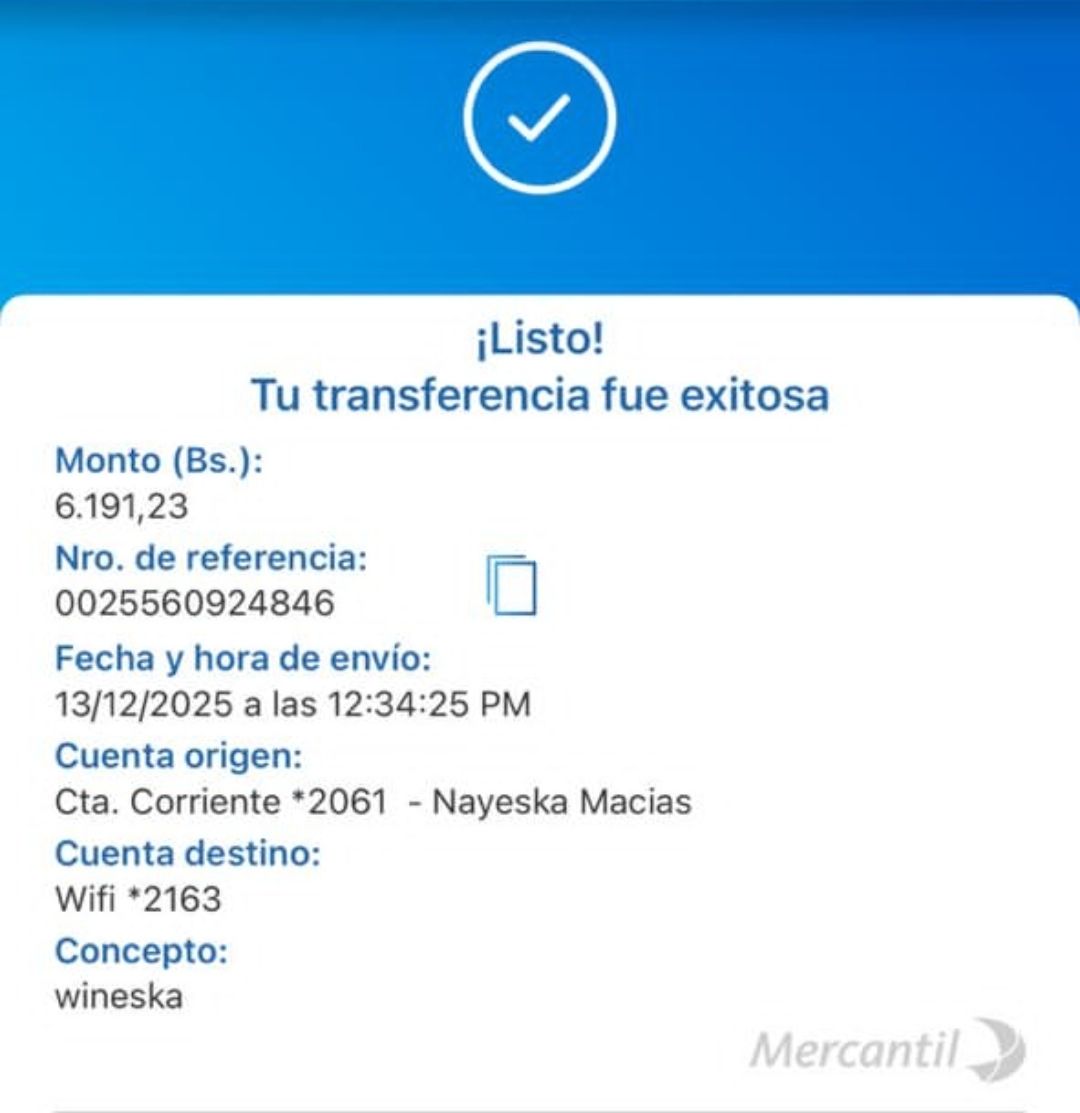 | N0523 | ARIS JOSE OJEDA LEON | 2025-12-08 | MERCANTIL 2163 | 427783893. | — | 6,718.84 BS | 247.30 | REGISTRADO |