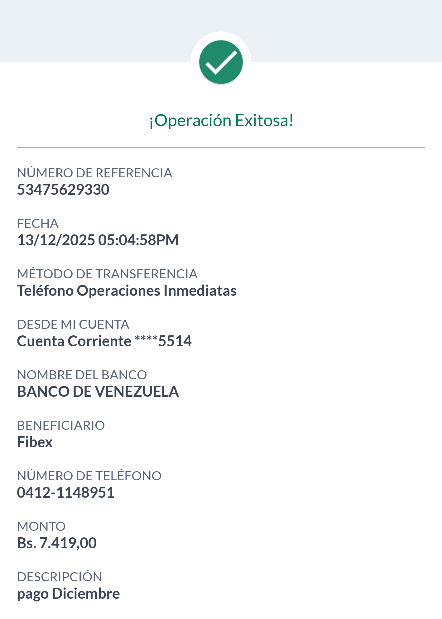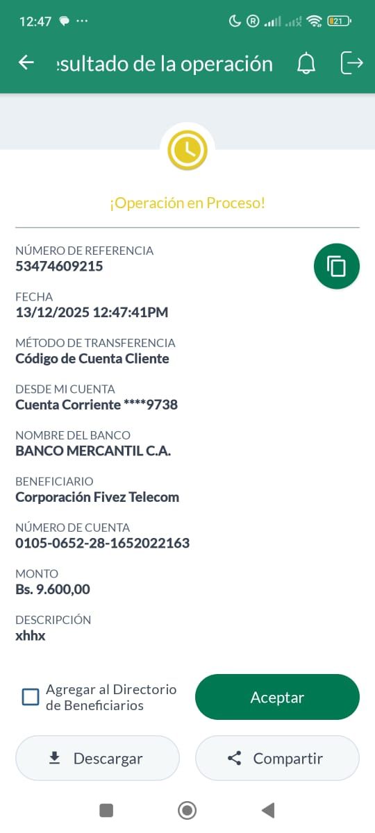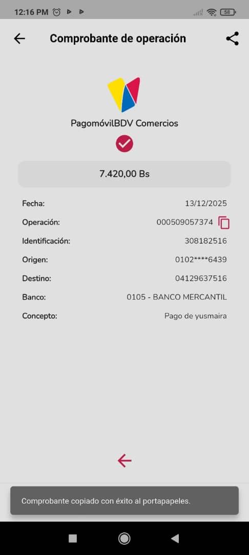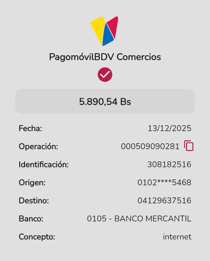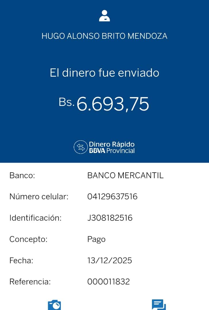 | BQ8450 | CARMEN ALICIA CORDERO RODRIGUEZ | 2025-12-13 | MERCANTIL 2163 | 58576458 | | 5,084.00 BS | 247.30 | REGISTRADO |