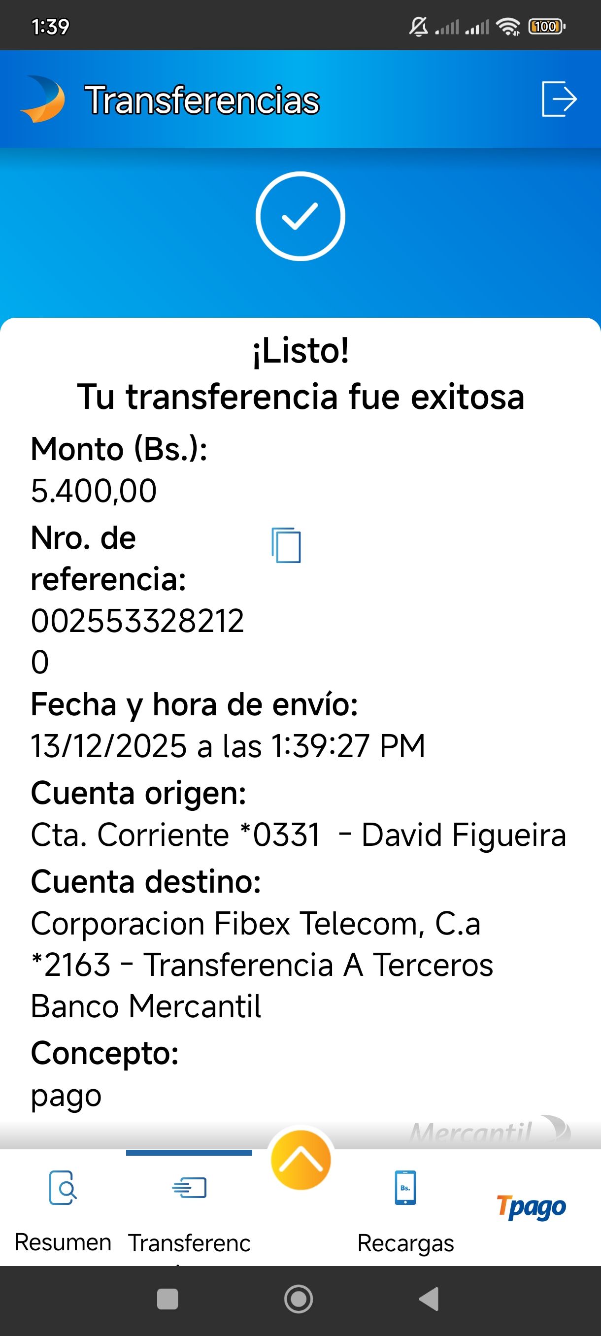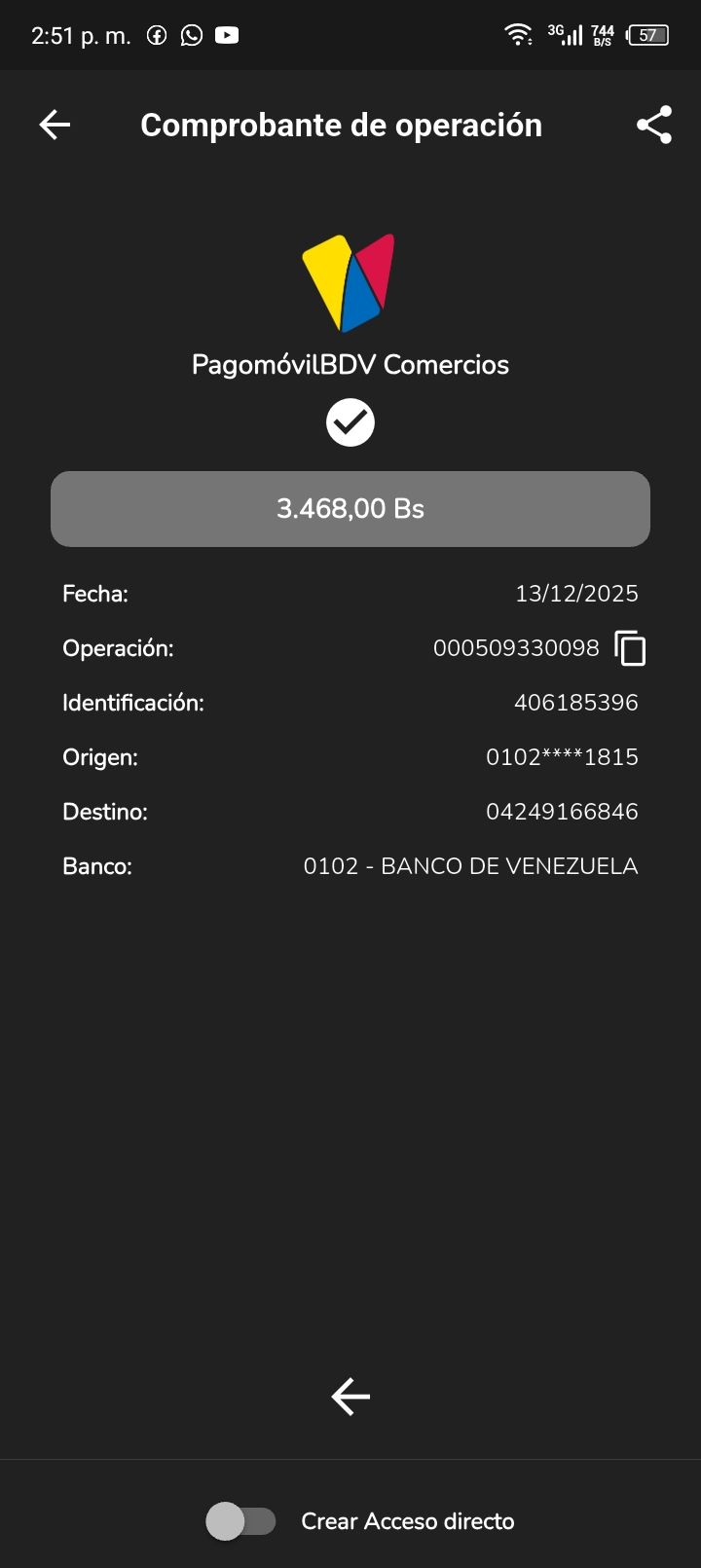 | V83291 | JUAN ANTONIO SOTILLETT | 2025-12-13 | MERCANTIL 2163 | 24852248 | | 7,430.00 BS | 247.30 | REGISTRADO |