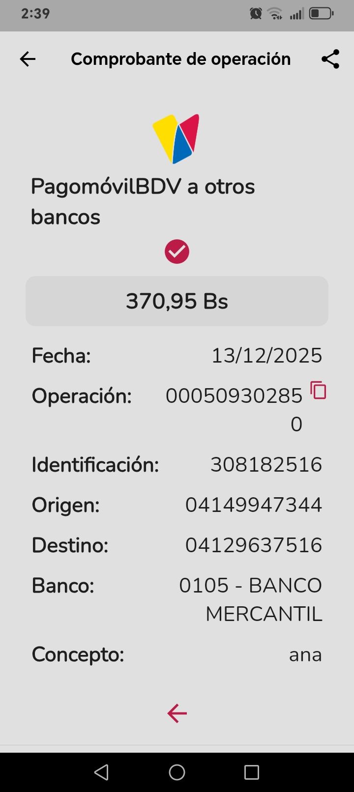 | FM4335 | LEIDI DIANA MARVAL IDROGO | 2025-12-13 | MERCANTIL 2163 | 09311139 | | 1,874.85 BS | 247.30 | REGISTRADO |