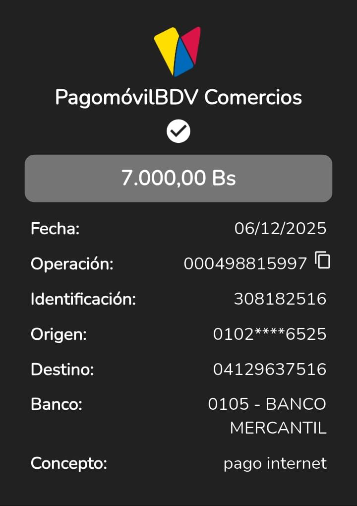 | C25390 | DUBRASKA YAMILETH PONCE MOLINA | 2025-12-06 | MERCANTIL 2163 | 08182516 | | 7,000.00 BS | 247.30 | REGISTRADO |