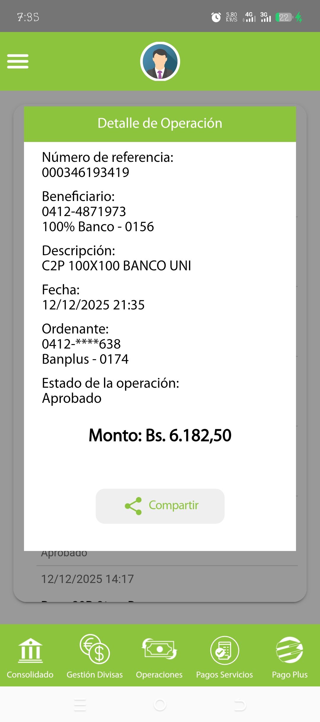 | LCH8752 | JESUS DANIEL PERALES CARVAJAL | 2025-12-05 | MERCANTIL 2163 | 12345678 | | 26.07 BS | 247.30 | REGISTRADO |