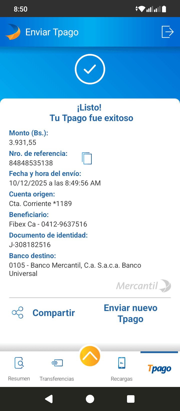 | MGTA14516 | LISSET SALAZAR | 2025-12-10 | MERCANTIL 2163 | 000007566 | | 8,655.55 BS | 247.30 | REGISTRADO |