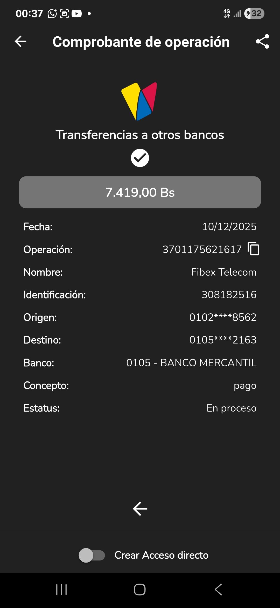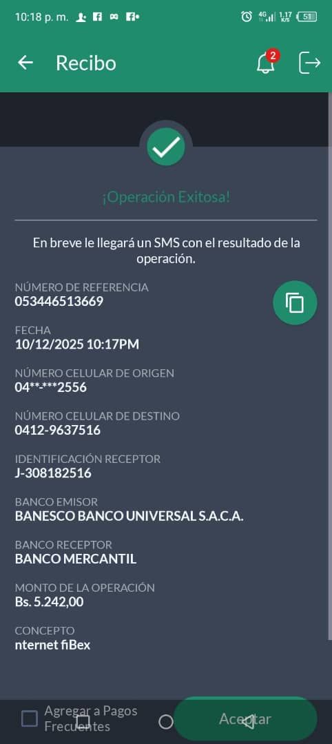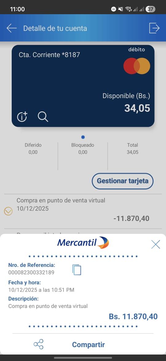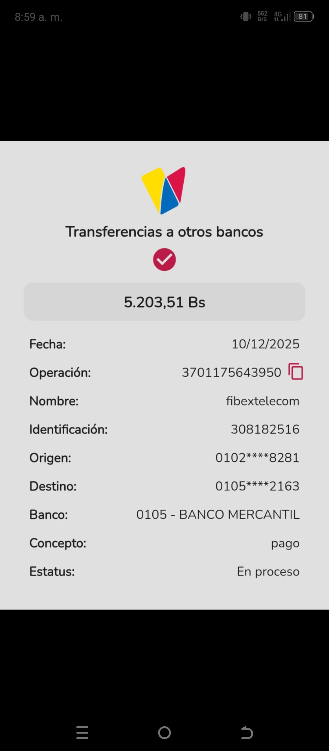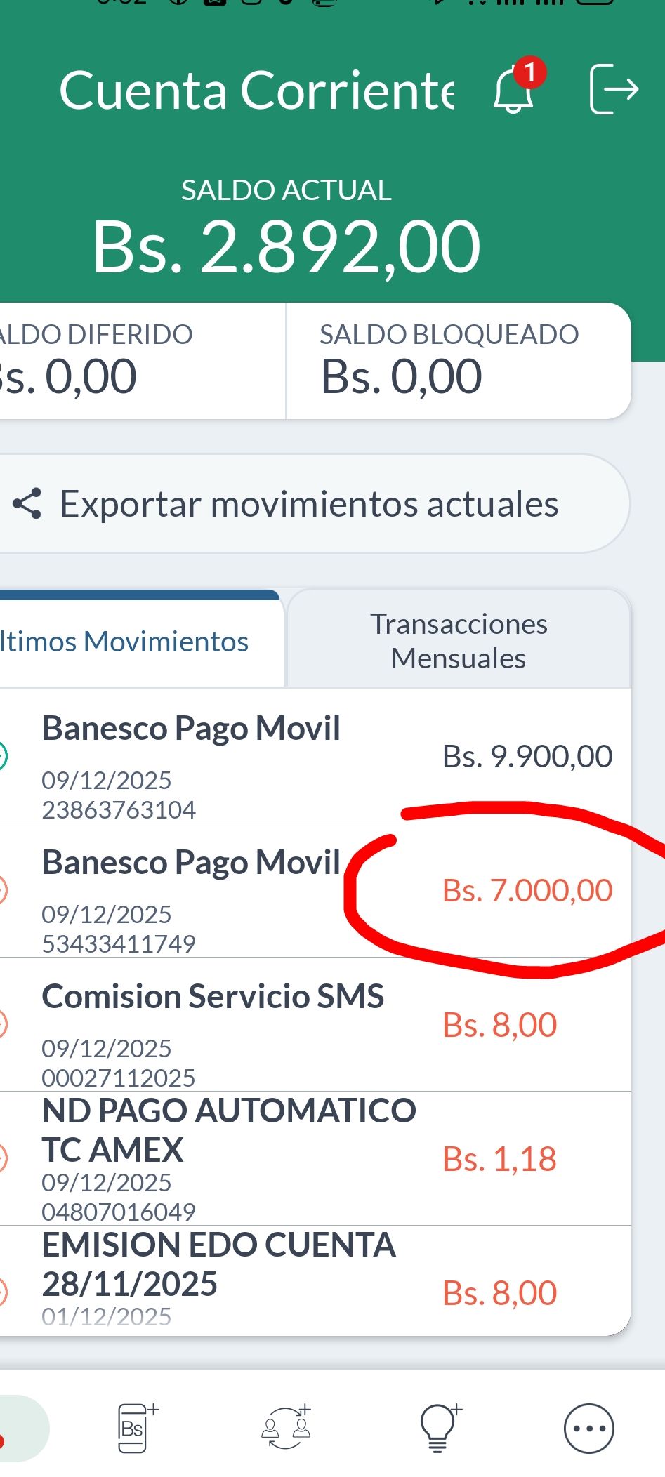 | GU40953 | ENDRY JESUS MICHINEL MORALES | 2025-12-10 | MERCANTIL 2163 | 3701175621617 | | 7,419.00 BS | 247.30 | REGISTRADO |