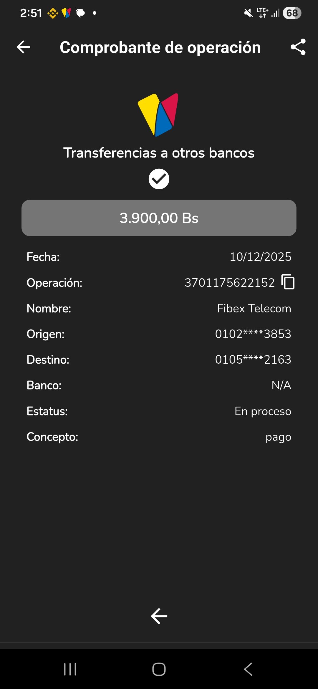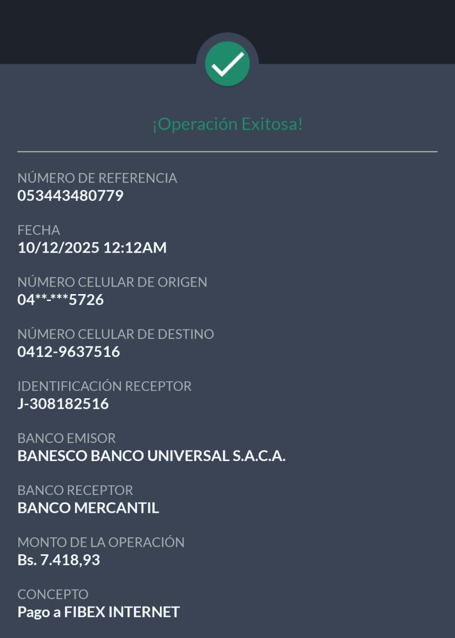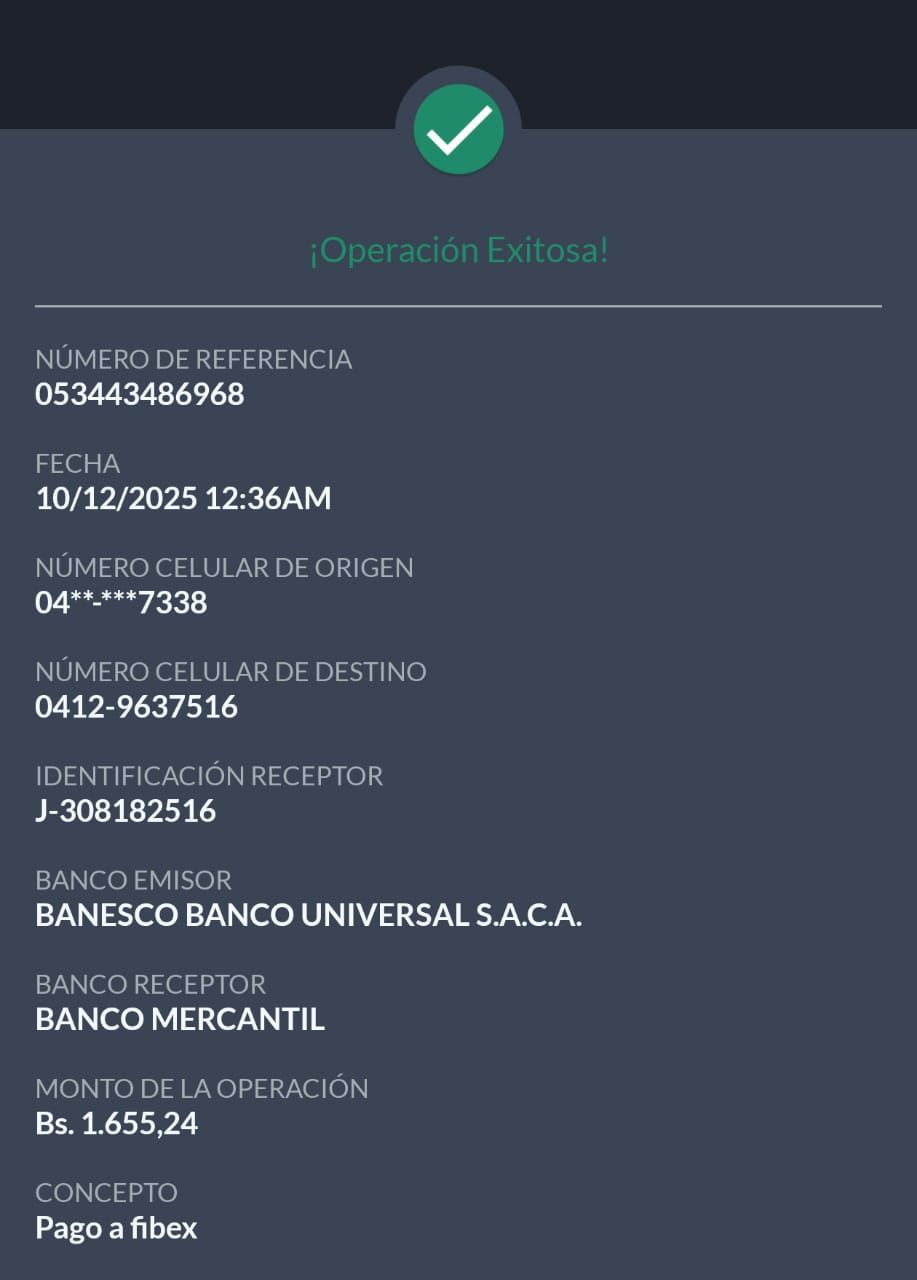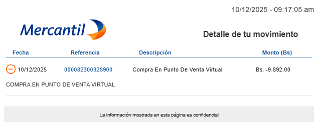 | LA0054 | JUAN ADOLFREDO RONDON BASTARDO | 2025-12-10 | MERCANTIL 2163 | 33411749 | | 7,000.00 BS | 247.30 | REGISTRADO |
