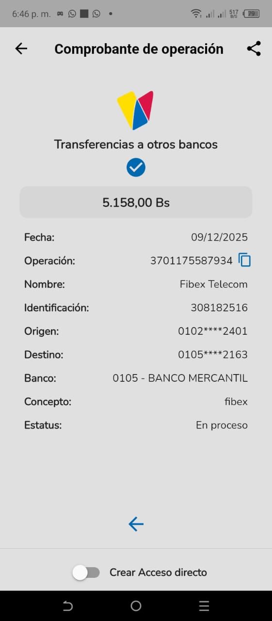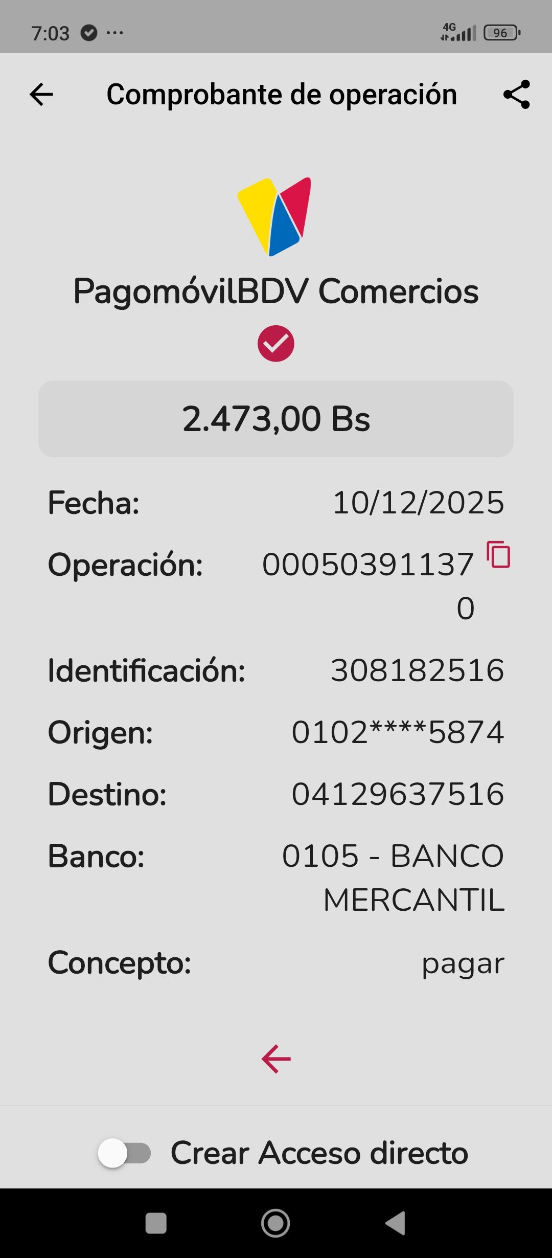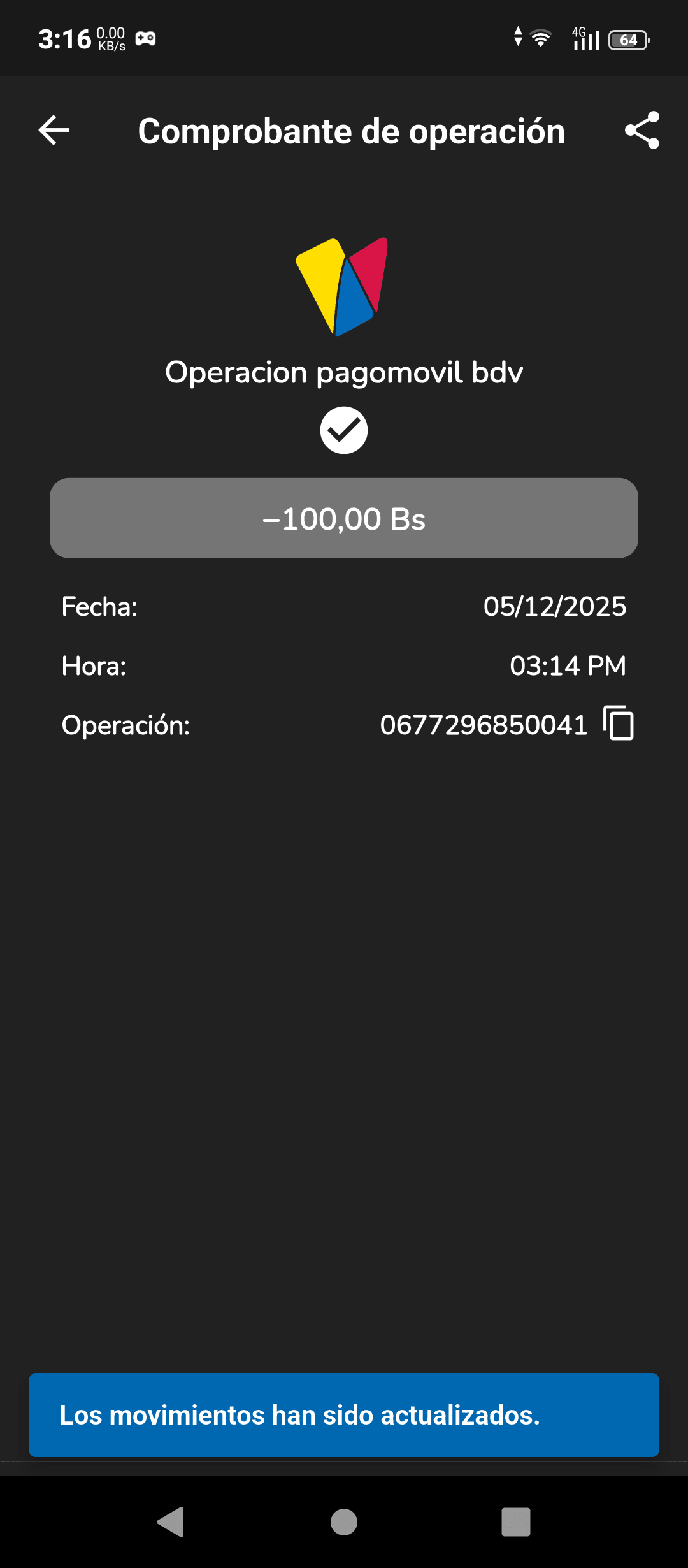 | LA0054 | JUAN ADOLFREDO RONDON BASTARDO | 2025-12-10 | MERCANTIL 2163 | 33411749 | | 7,000.00 BS | 247.30 | REGISTRADO |