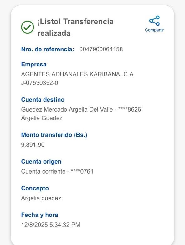 | GU8633 | YOLY ORTIZ RAMIREZ | 2025-12-10 | MERCANTIL 2163 | 48535138 | | 3,937.55 BS | 247.30 | REGISTRADO |