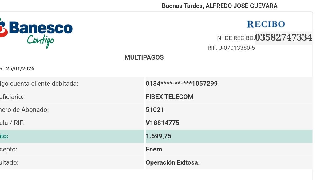 | C51021 | ALFREDO JOSé GUEVARA BORREGO | 2026-01-25 | 100% BANCO 5214 | 03582747334 | | 1,699.75 BS | 301.37 | REGISTRADO |