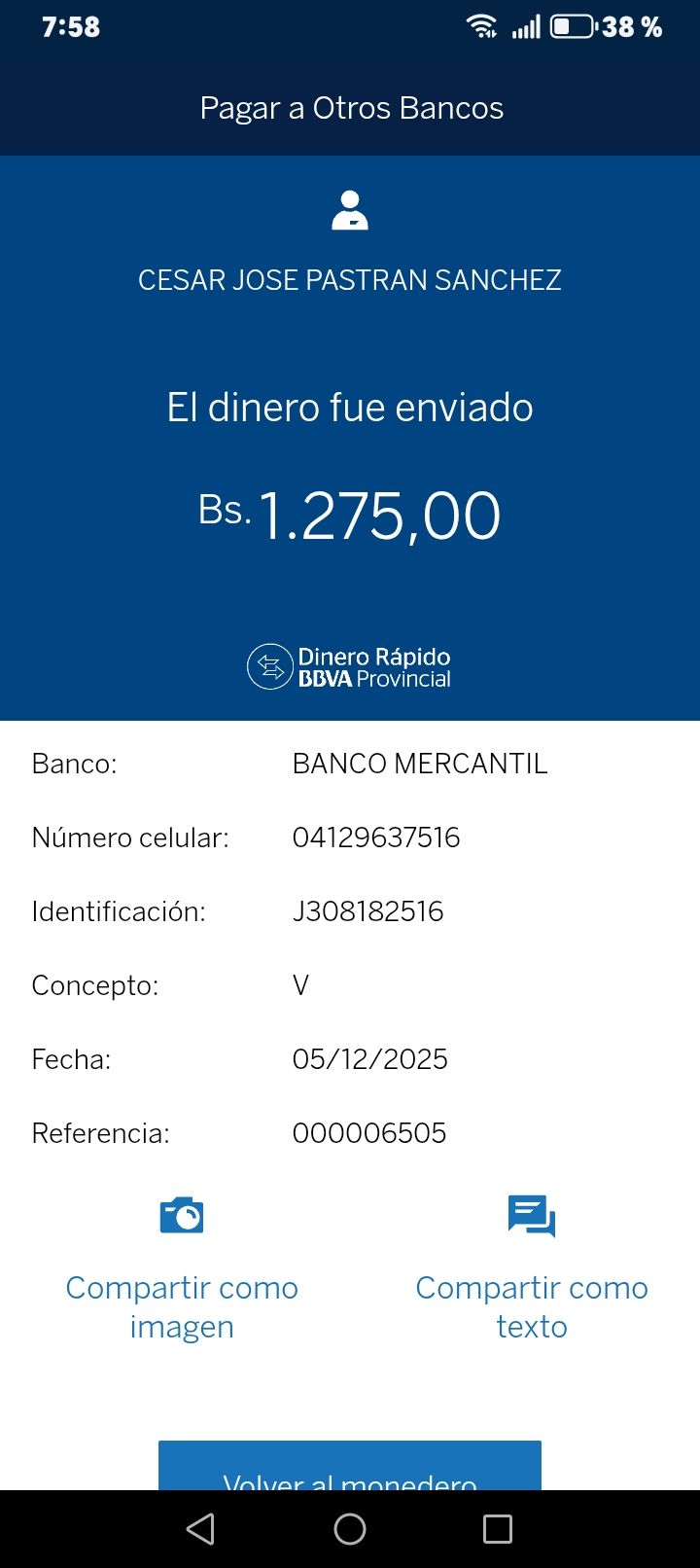 | BQ18433 | CESAR JOSE PASTRAN SANCHEZ | 2025-12-05 | MERCANTIL 2163 | 00006505 | | 1,275.00 BS | 247.30 | REGISTRADO |