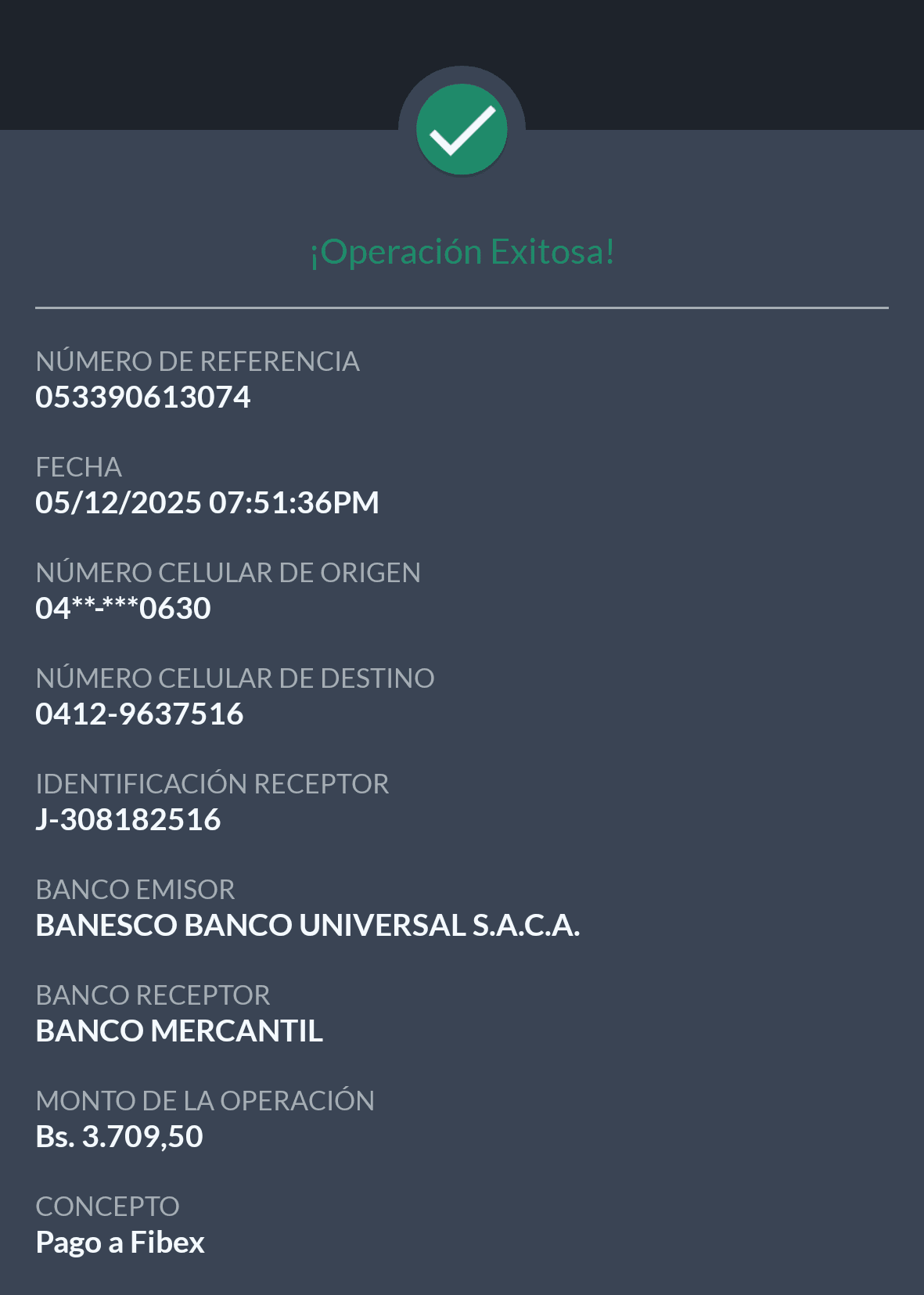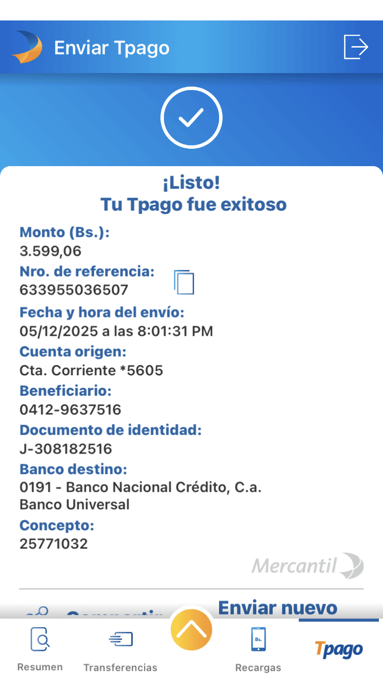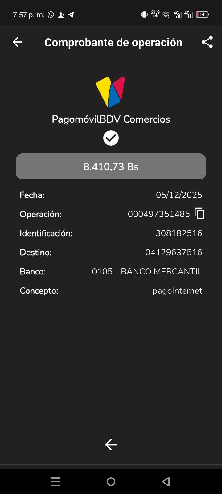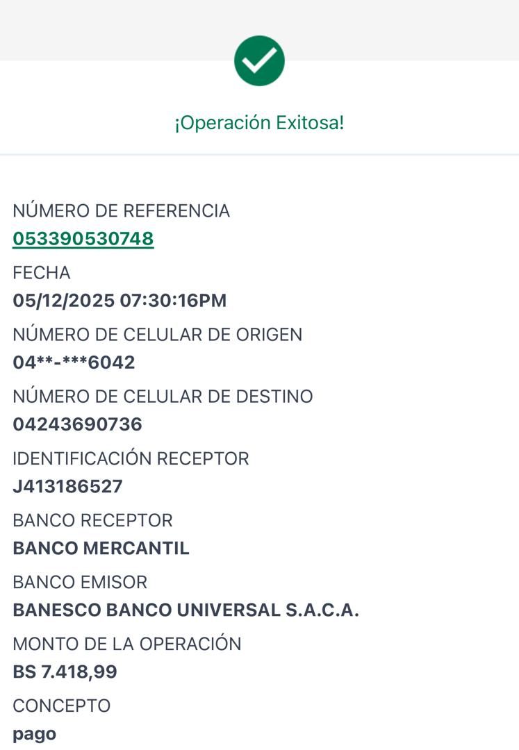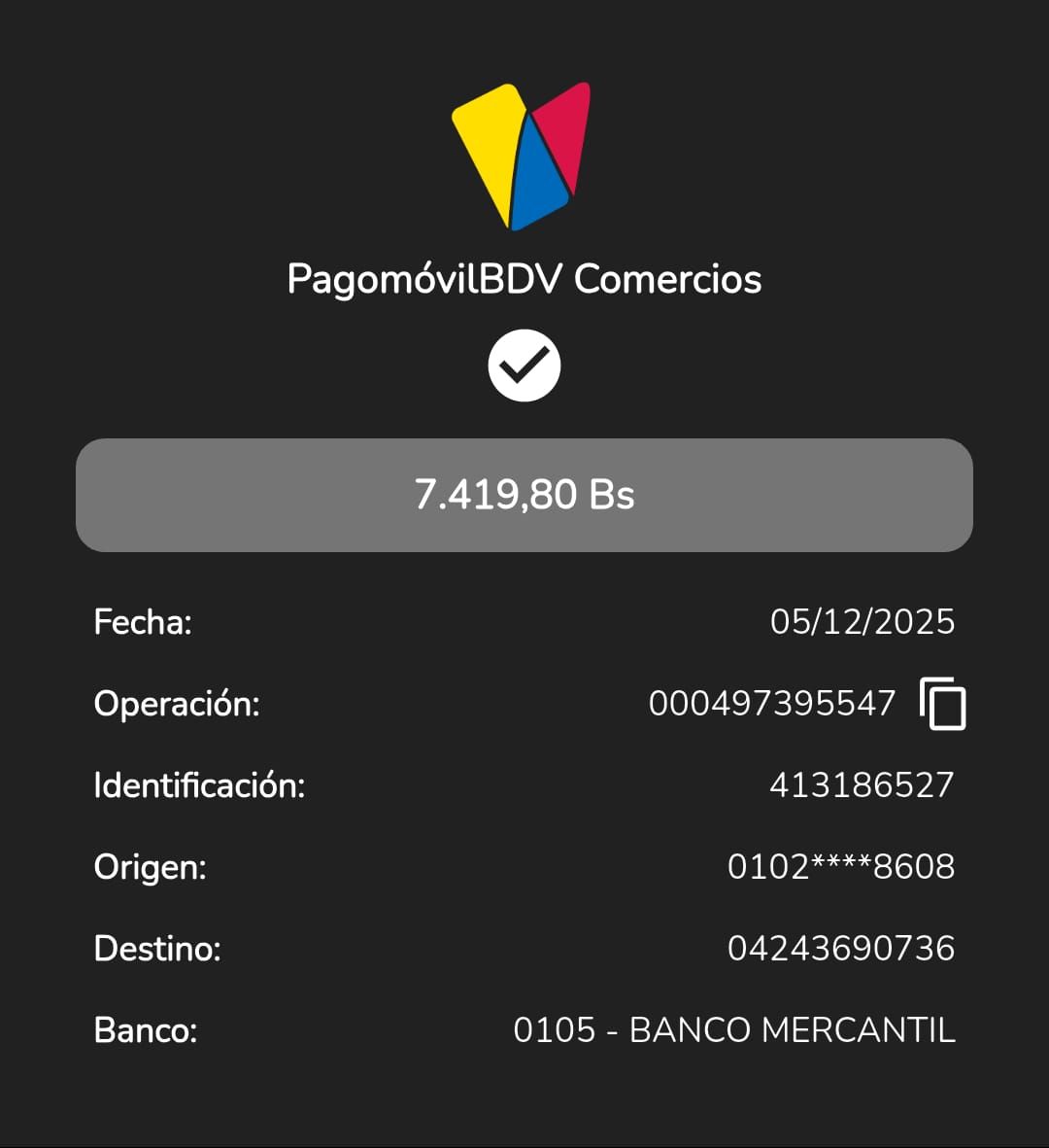 | LAG1479 | EDWIN WILLIANGEL ESCOBAR PEREZ | 2025-12-05 | MERCANTIL 2163 | 97401673 | | 4,941.70 BS | 247.30 | REGISTRADO |