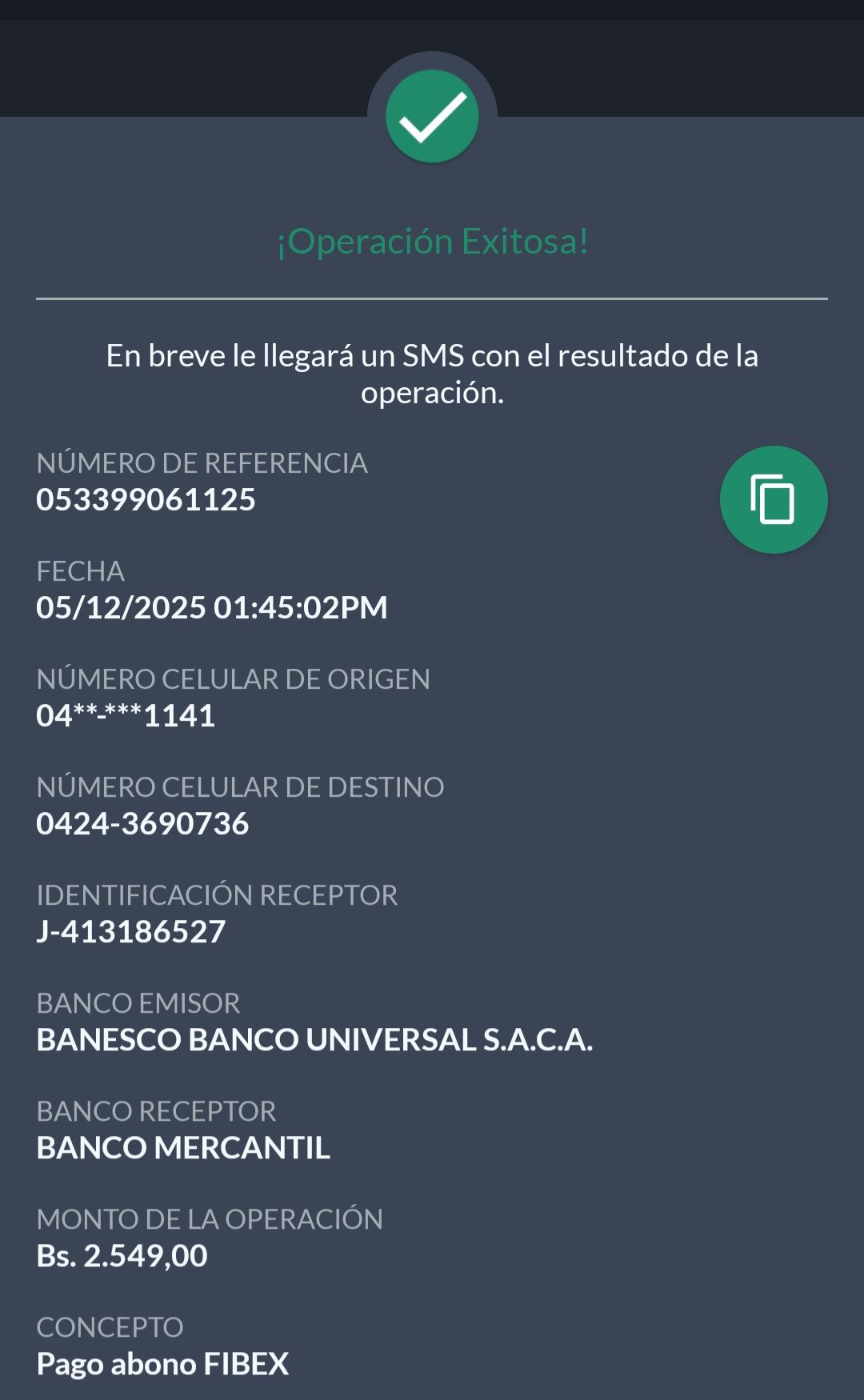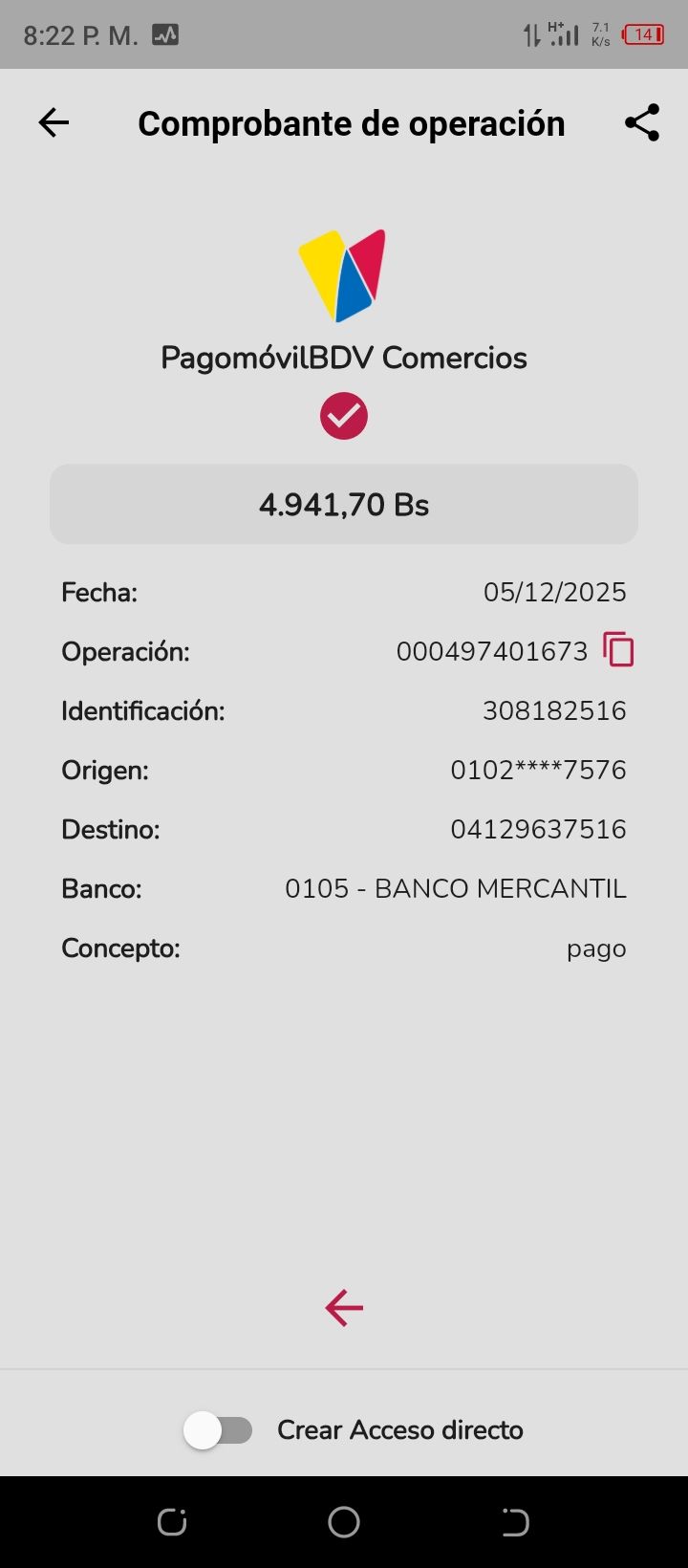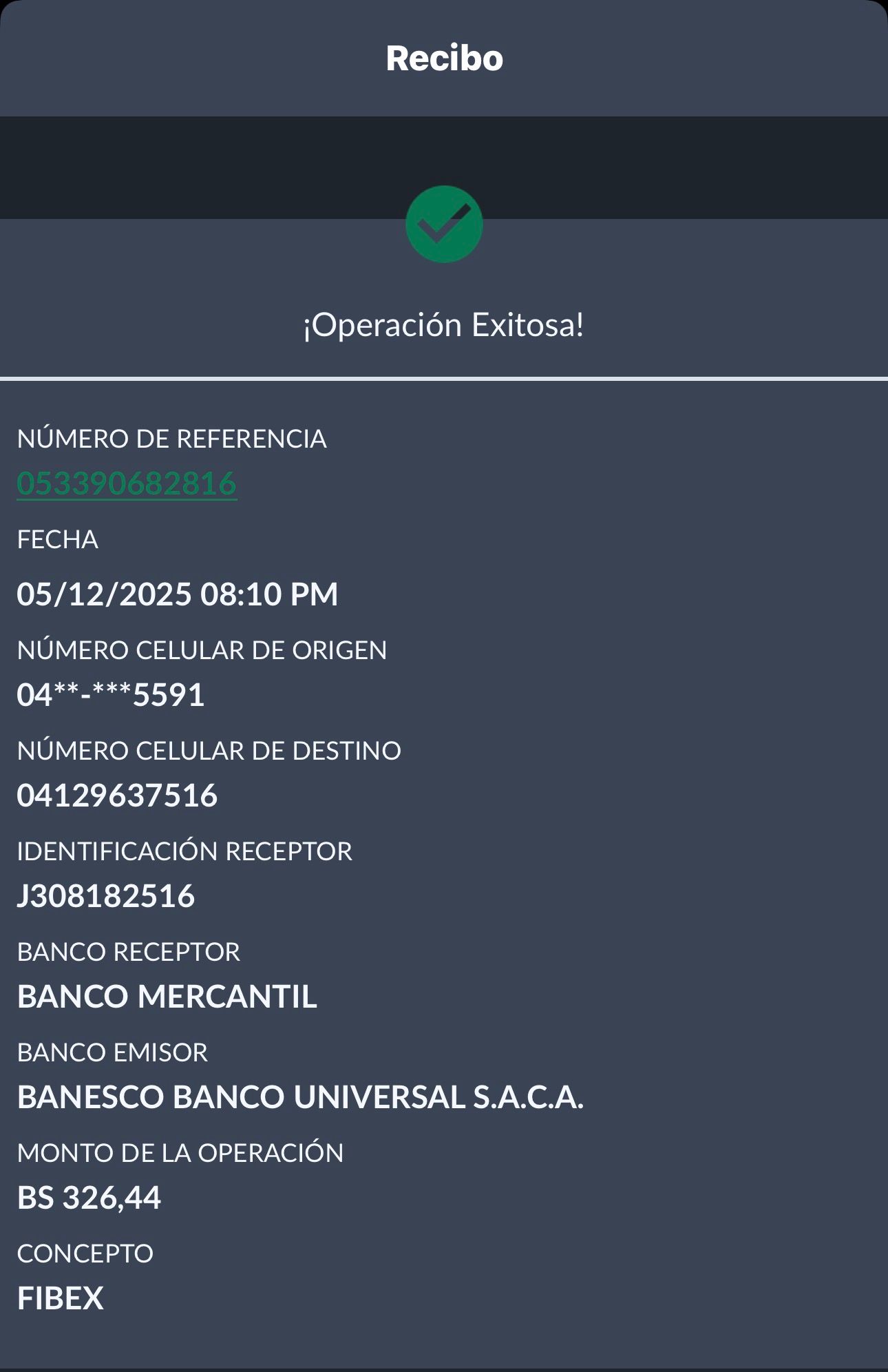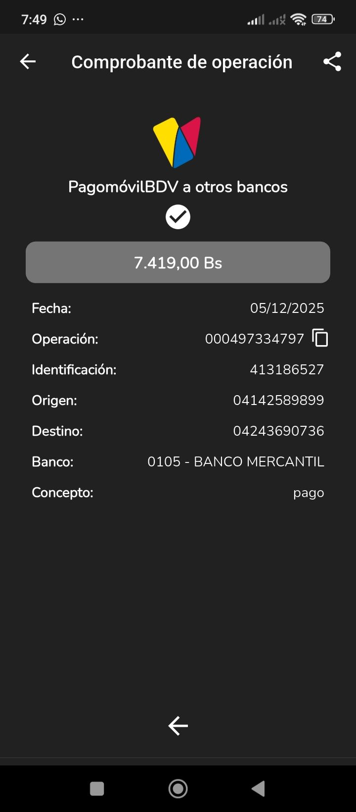 | LAG1479 | EDWIN WILLIANGEL ESCOBAR PEREZ | 2025-12-05 | MERCANTIL 2163 | 97401673 | | 4,941.70 BS | 247.30 | REGISTRADO |