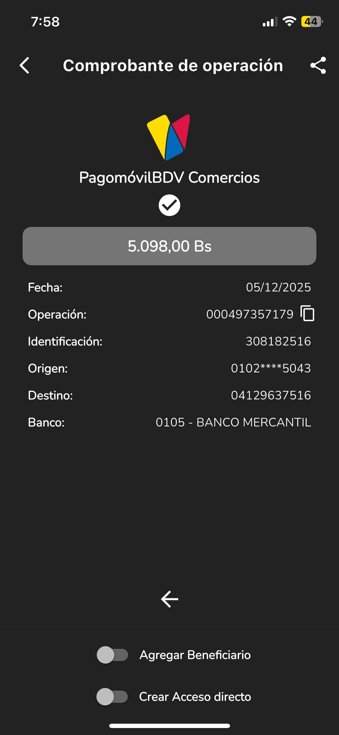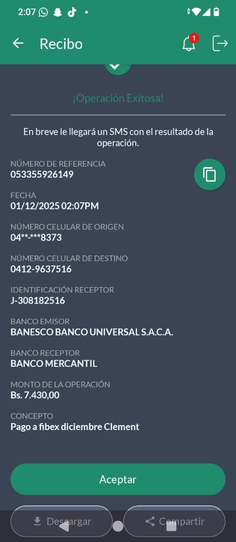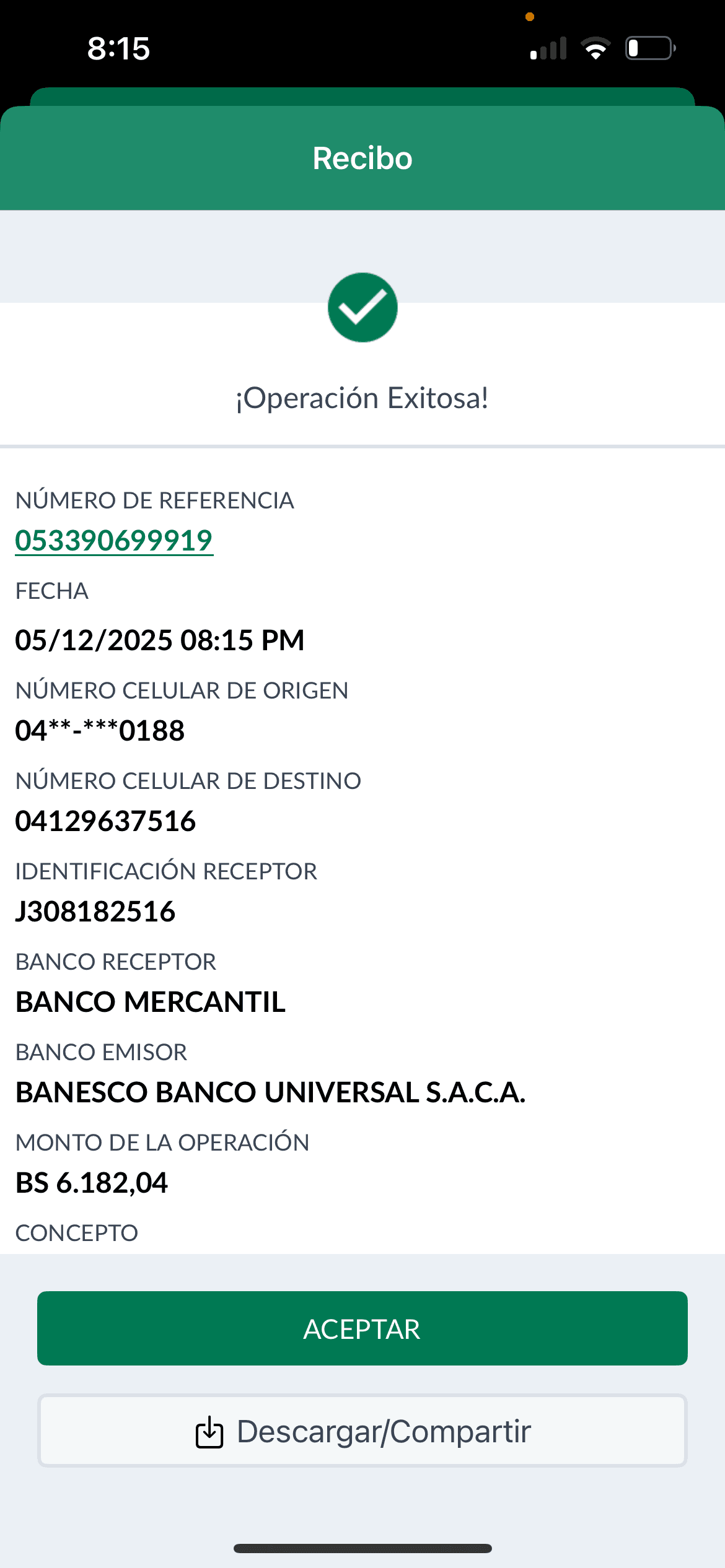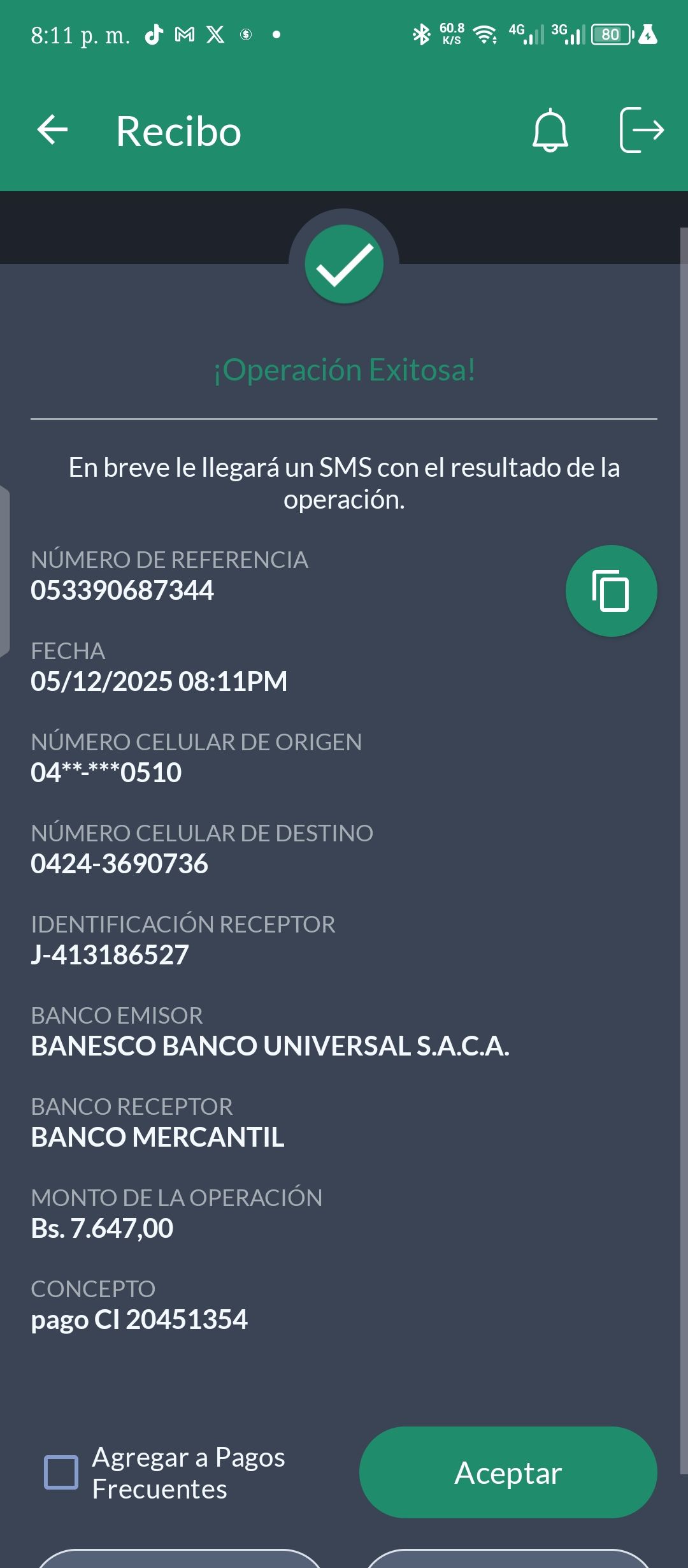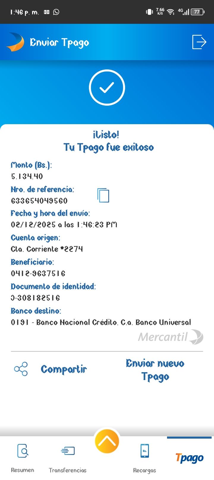 | LAG1479 | EDWIN WILLIANGEL ESCOBAR PEREZ | 2025-12-05 | MERCANTIL 2163 | 97401673 | | 4,941.70 BS | 247.30 | REGISTRADO |