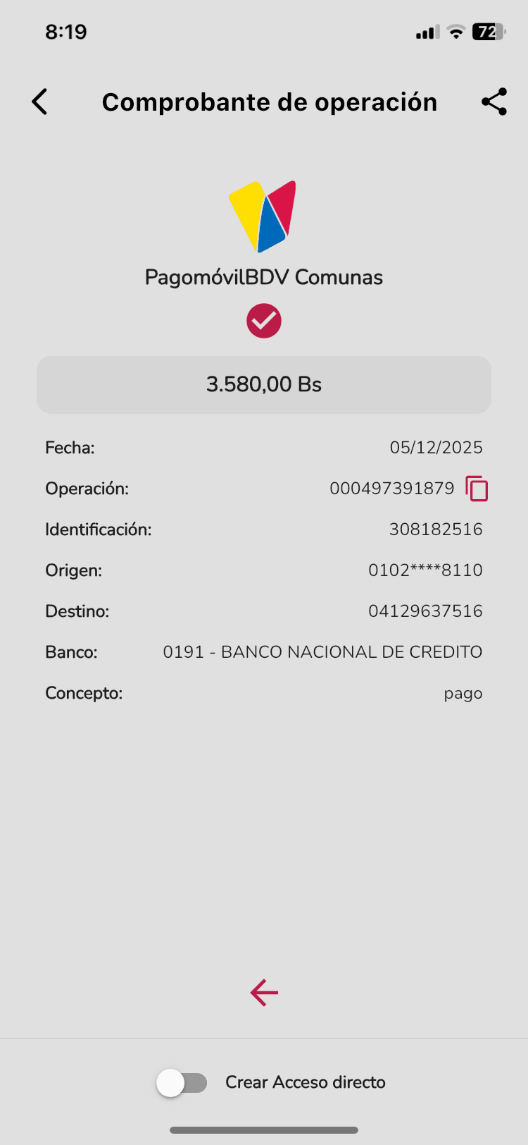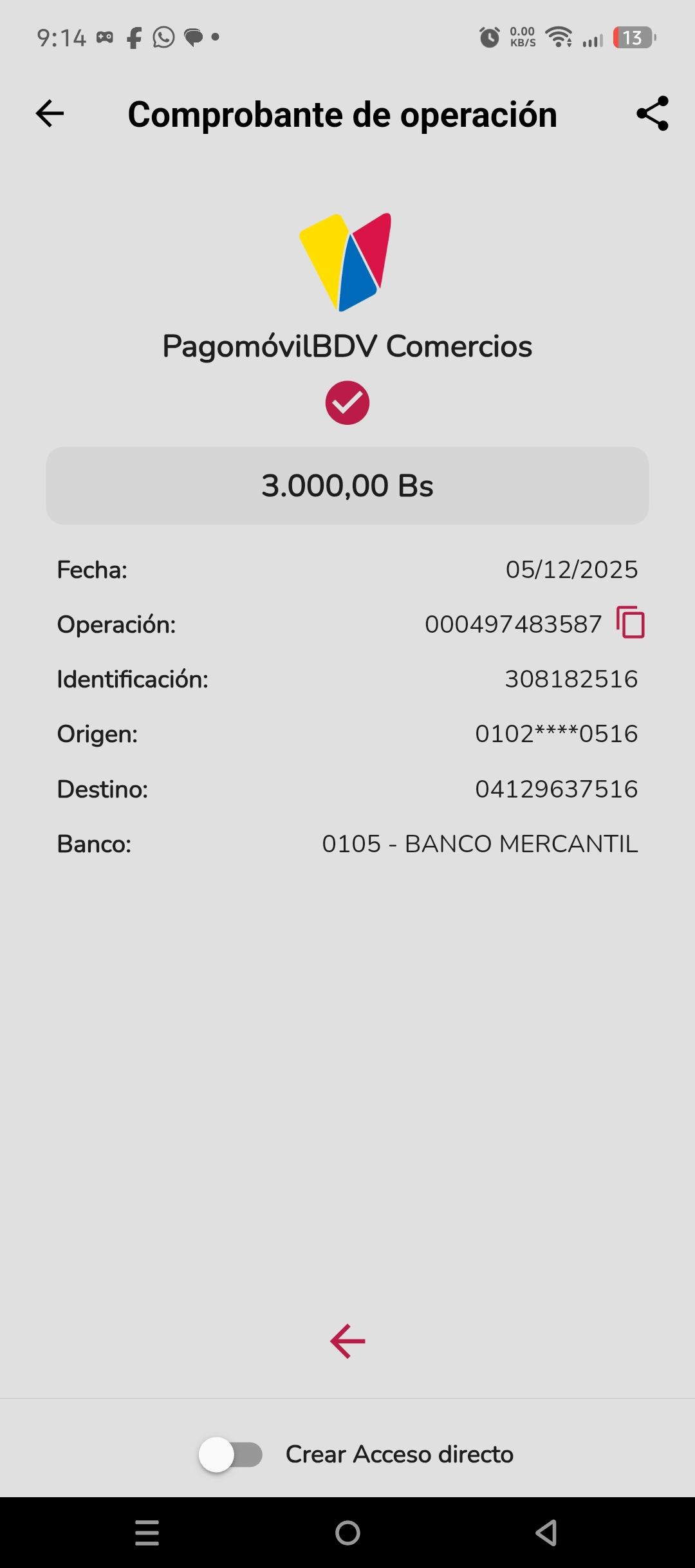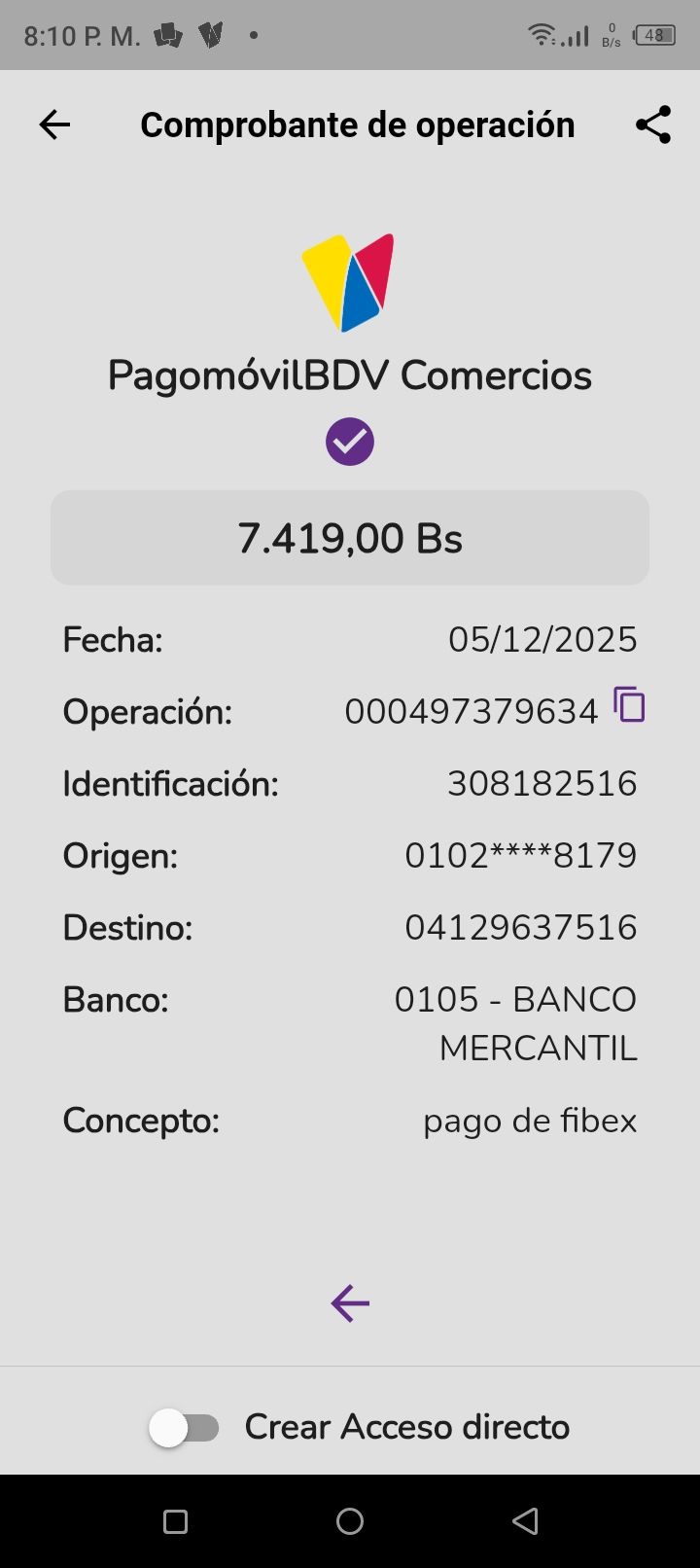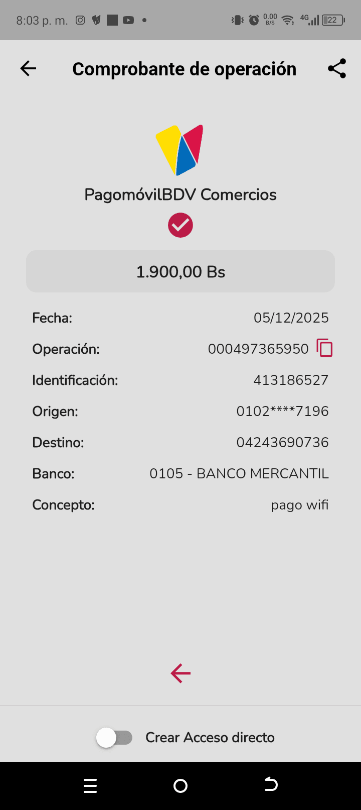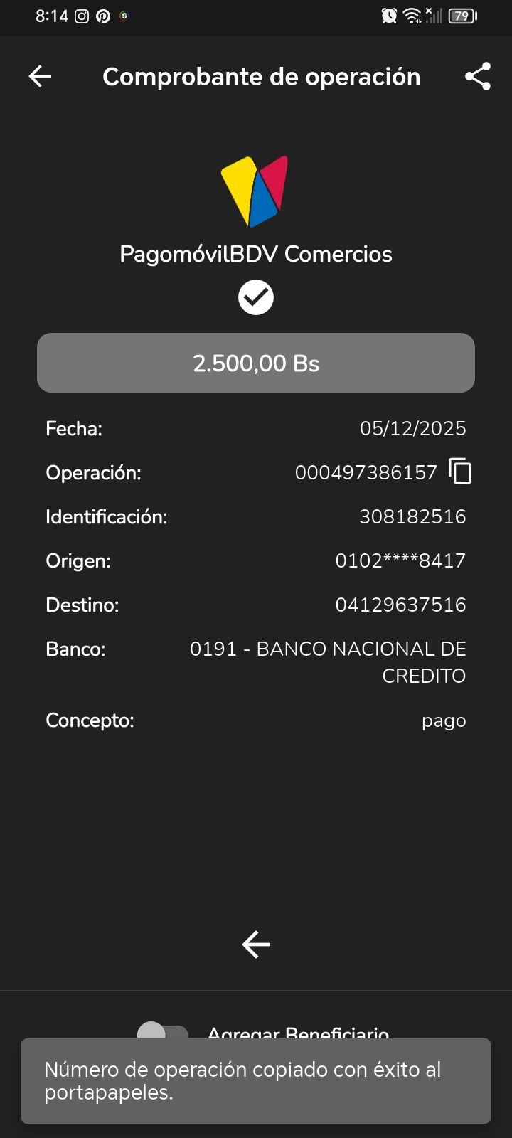 | LAG1479 | EDWIN WILLIANGEL ESCOBAR PEREZ | 2025-12-05 | MERCANTIL 2163 | 97401673 | | 4,941.70 BS | 247.30 | REGISTRADO |