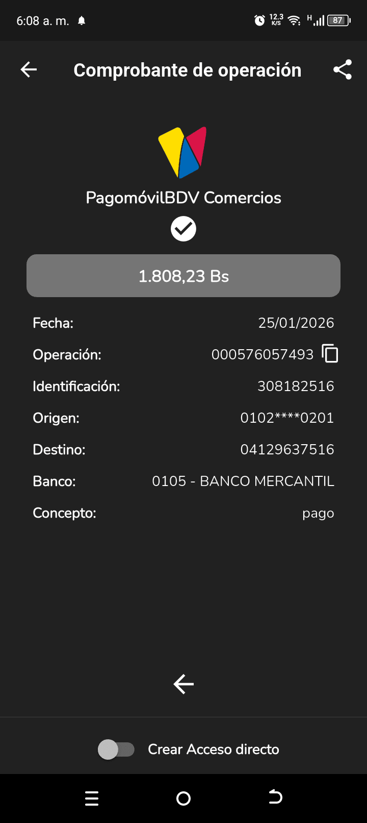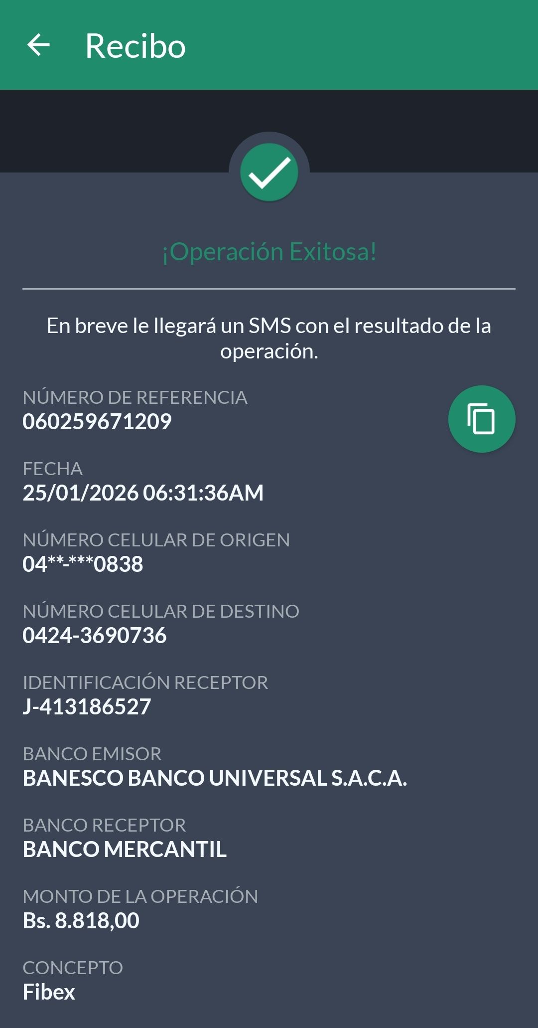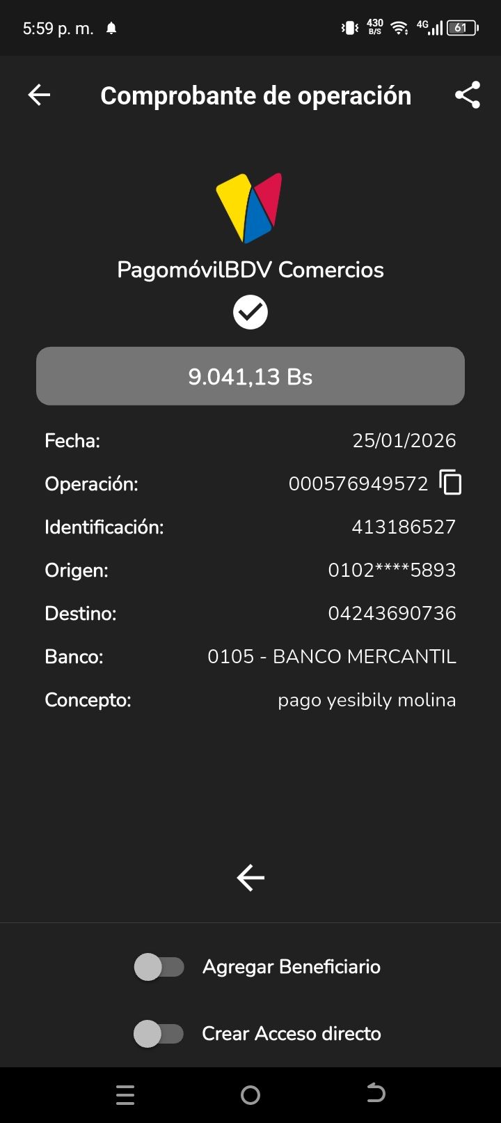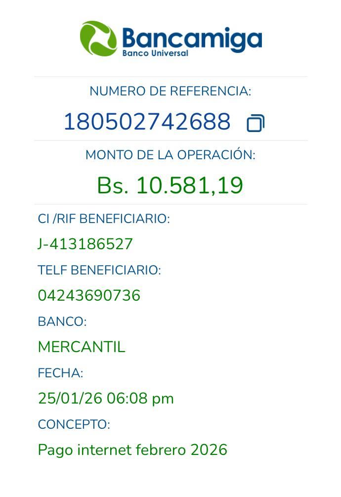 | G2586 | BEISY MORAIMA MONTILLA RODRIGUEZ | 2026-01-25 | MERCANTIL 2163 | 000576057493 | | 10,808.23 BS | 301.37 | REGISTRADO |