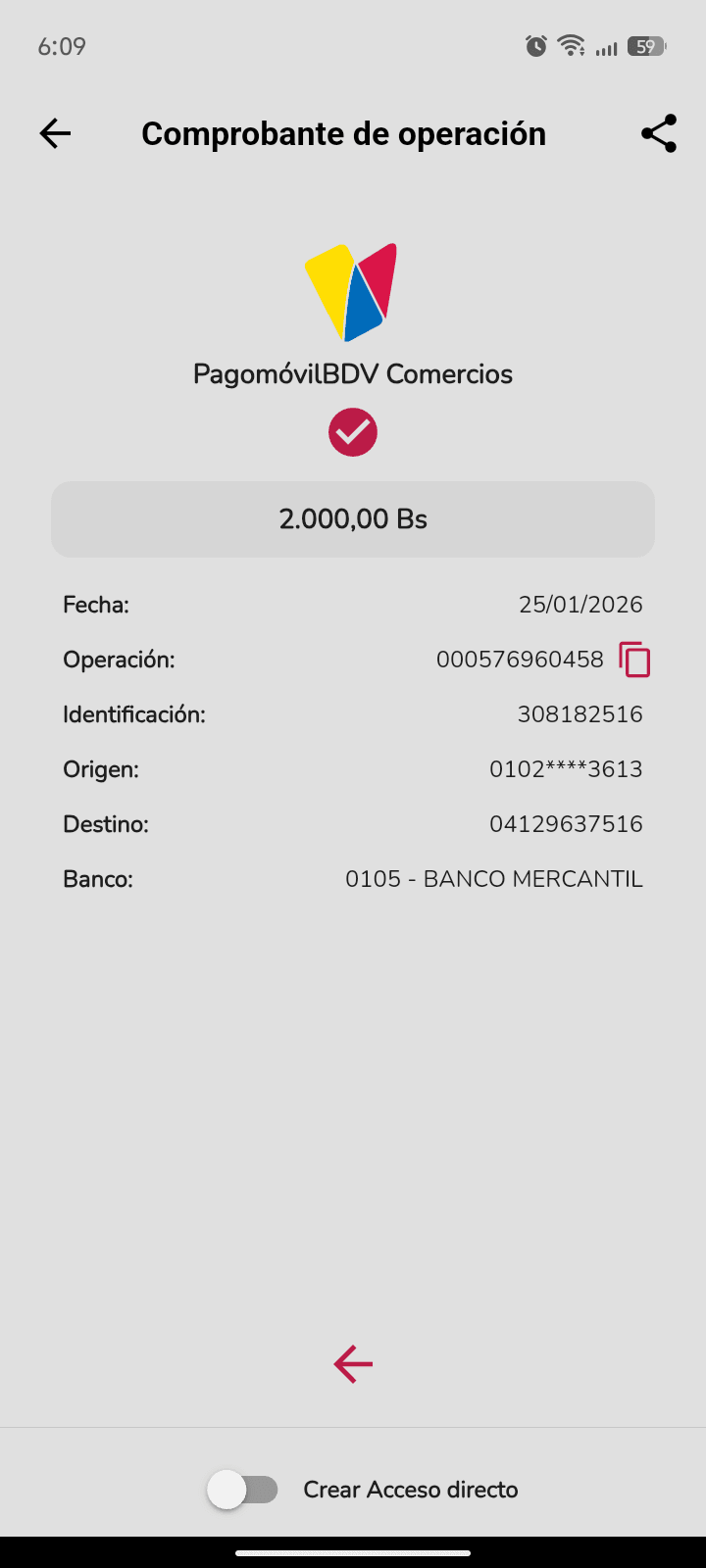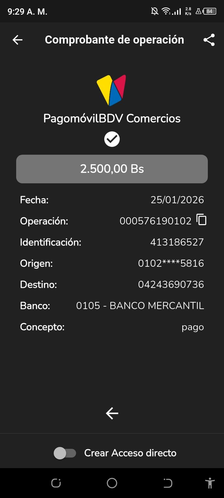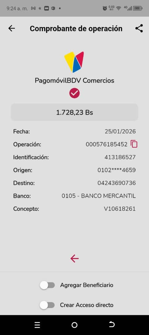| A54191 | DIANA CAROLINA ROJAS DE MONDOZZI | 2026-01-25 | MERCANTIL-4381-ARAGU | 576190102 | | 2,500.00 BS | 301.37 | REGISTRADO |