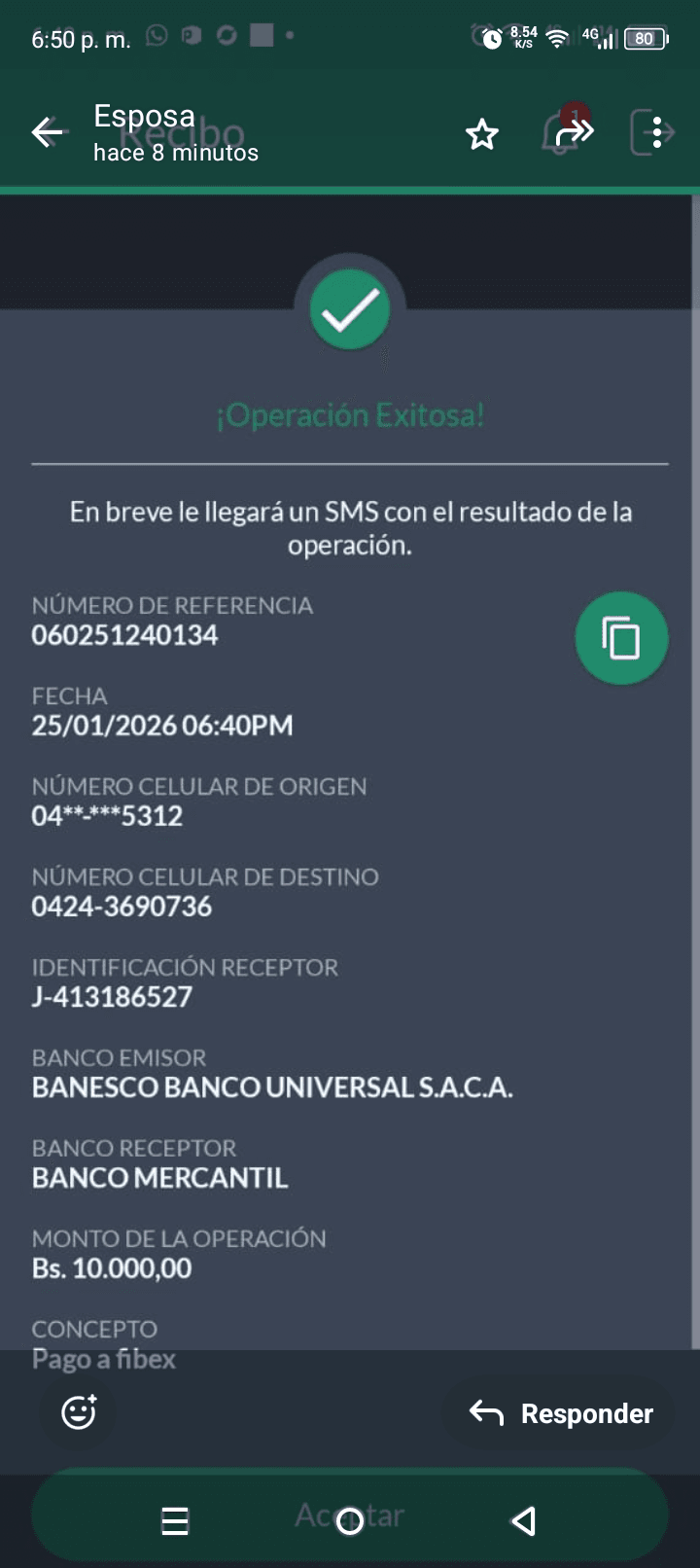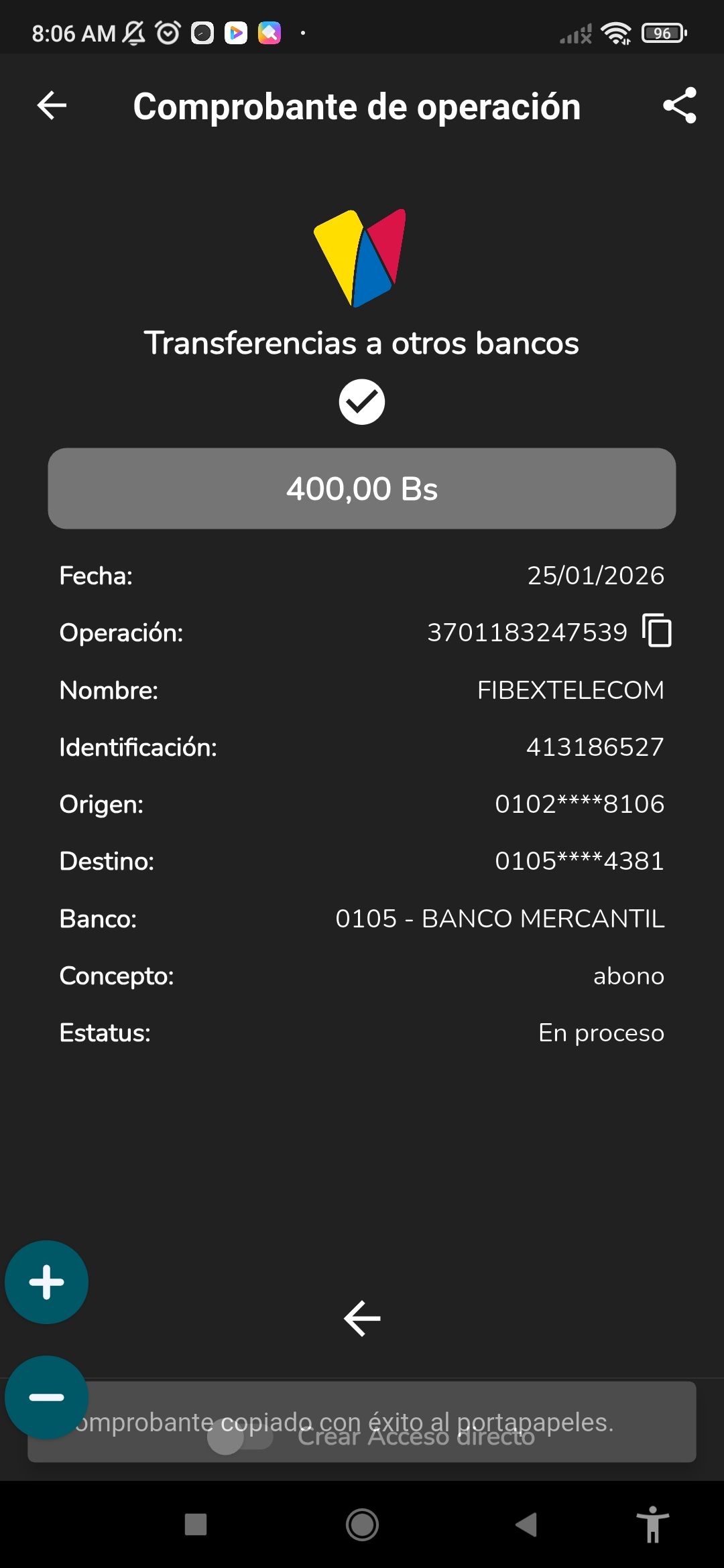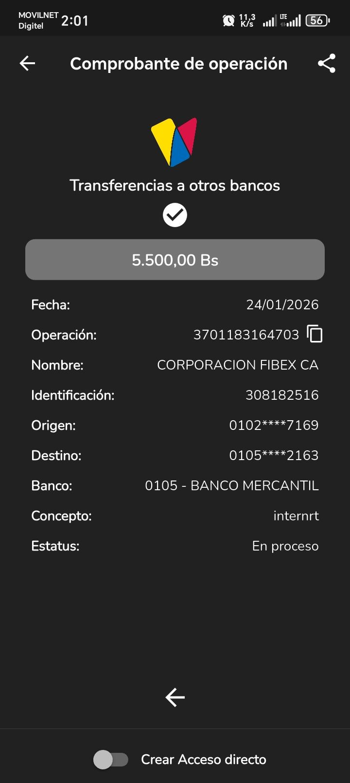 | A54191 | DIANA CAROLINA ROJAS DE MONDOZZI | 2026-01-25 | MERCANTIL-4381-ARAGU | 576190102 | | 2,500.00 BS | 301.37 | REGISTRADO |