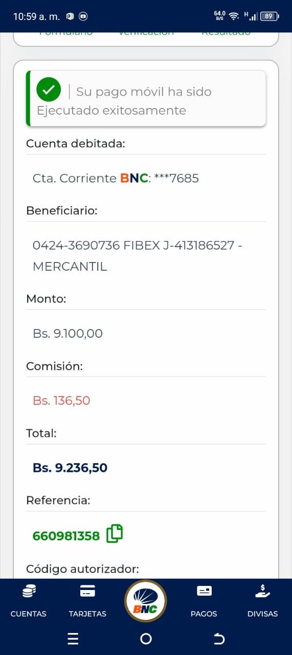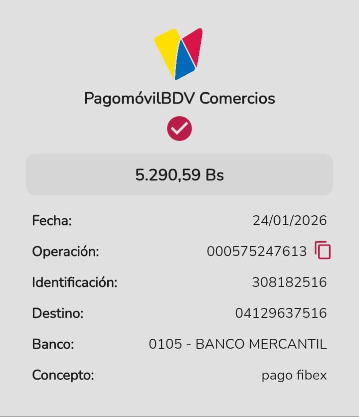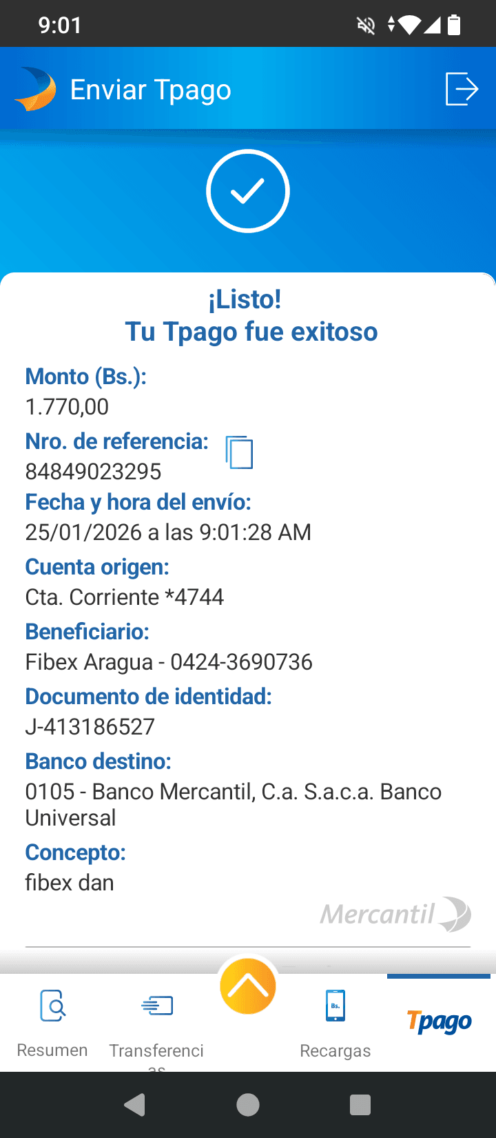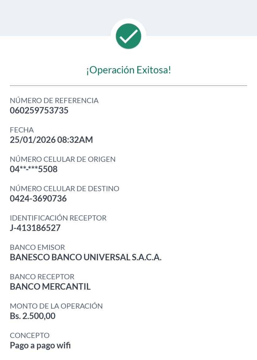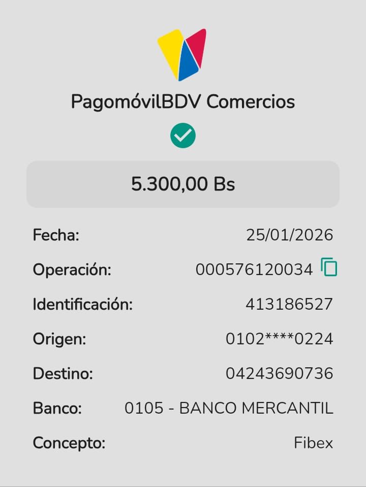 | A63023 | DALMIRO JOSE PEREZ GRIZEL | 2026-01-25 | MERCANTIL-4381-ARAGU | 49023295 | | 1,770.00 BS | 301.37 | REGISTRADO |