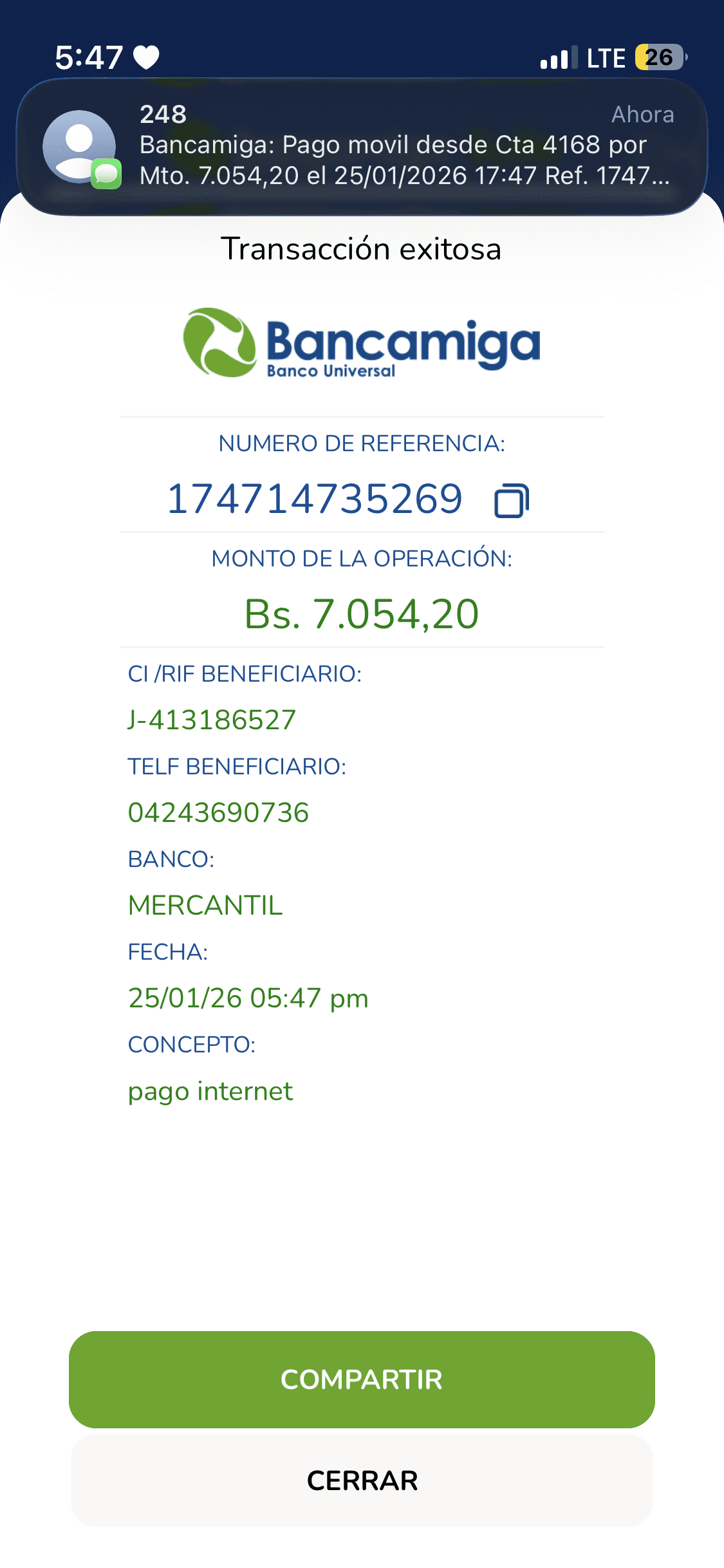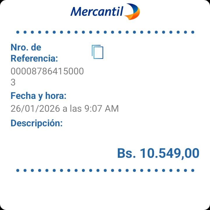 | A4931 | MARIA ALEJANDRA GARCIA DUARTE | 2026-01-25 | MERCANTIL-4381-ARAGU | 060250170429 | | 3,548.00 BS | 301.37 | REGISTRADO |