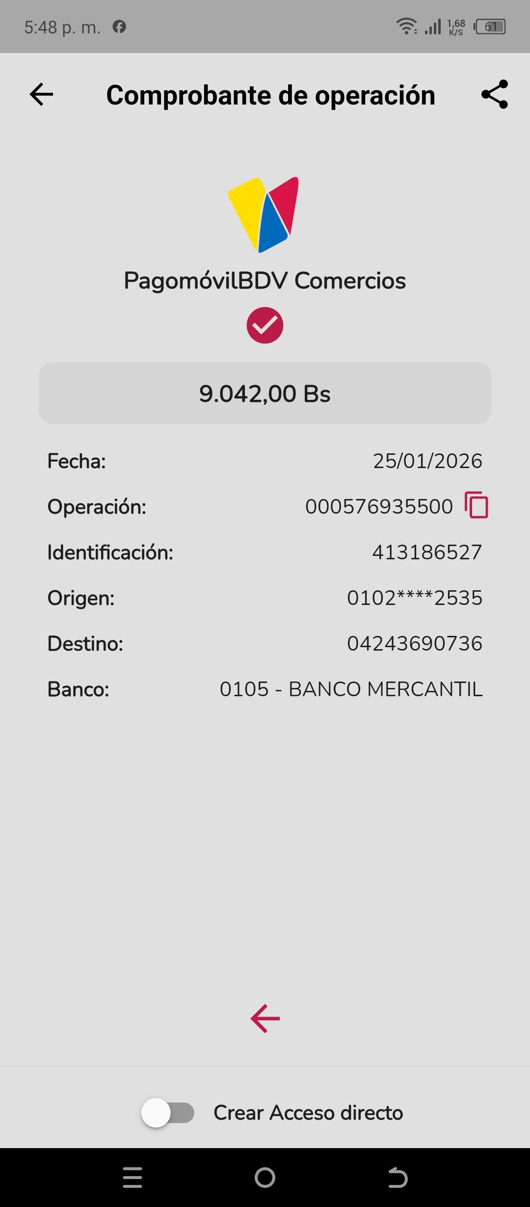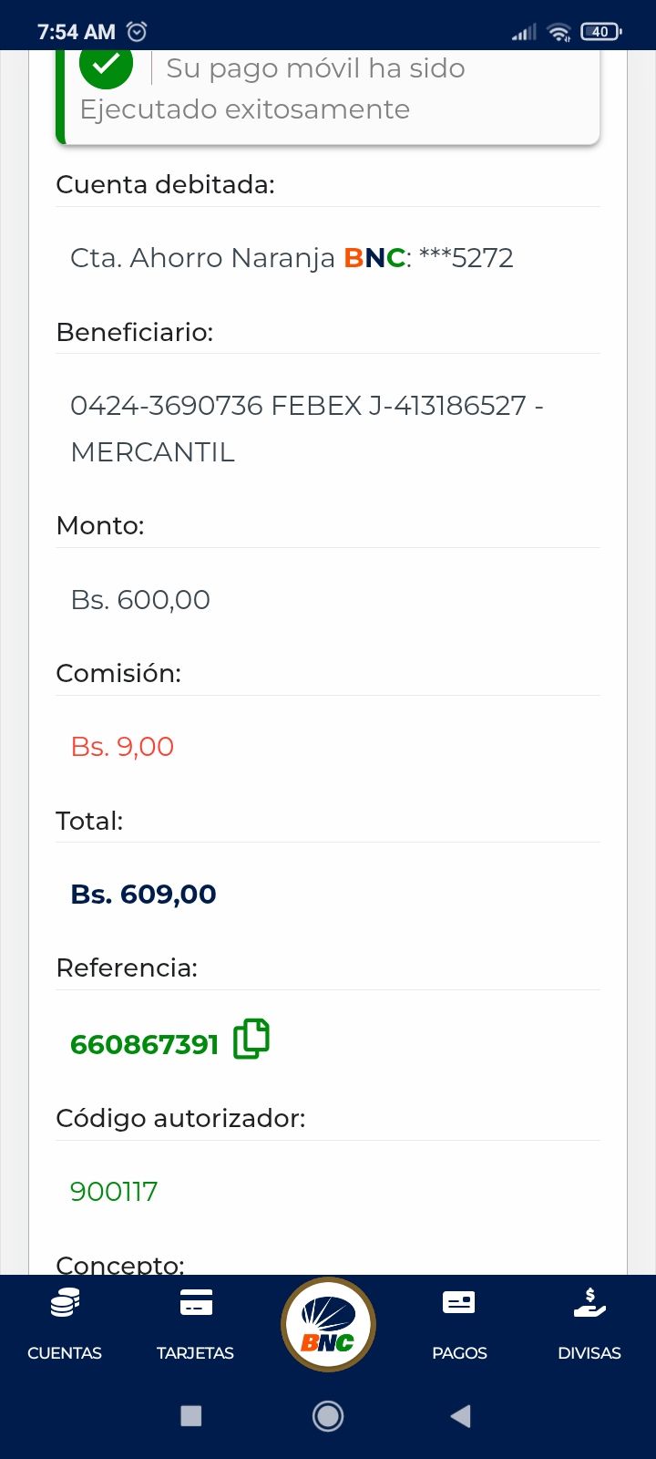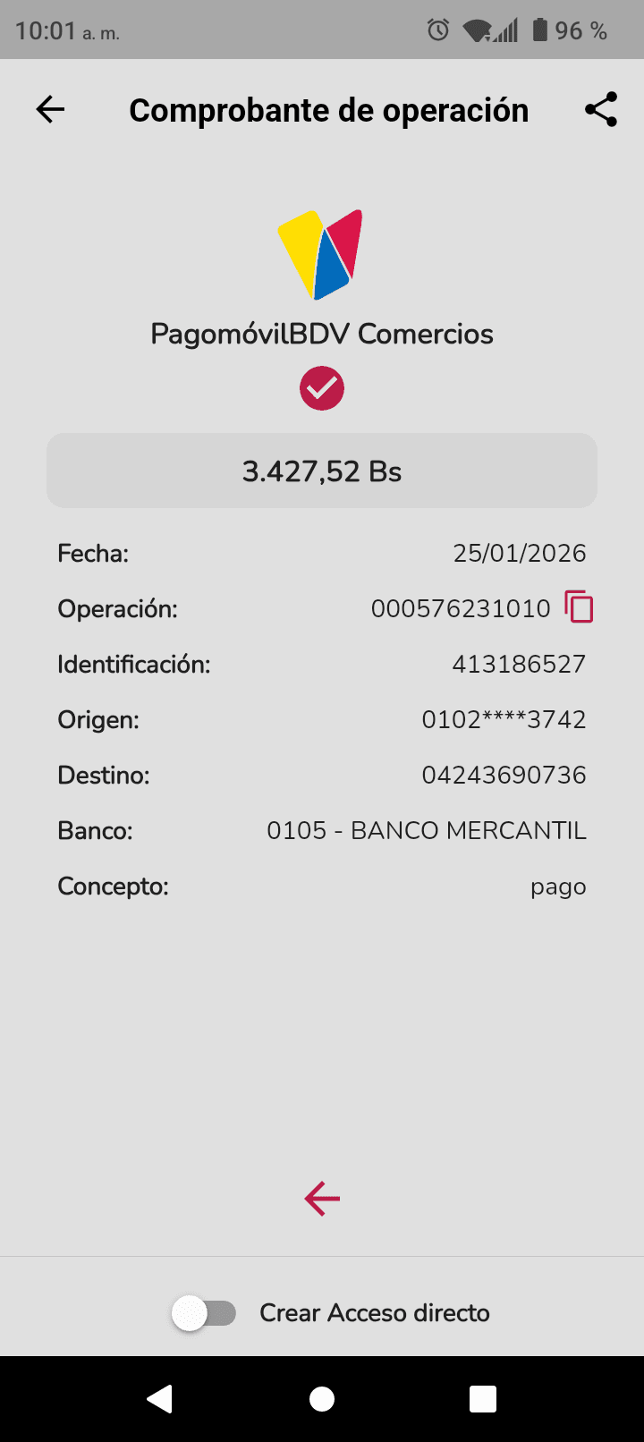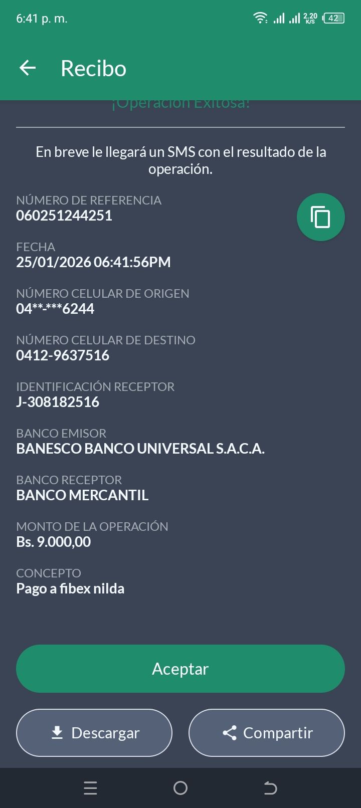| A9485 | ANTHONY JOSE PEREZ ARMAO | 2026-01-25 | MERCANTIL-4381-ARAGU | 00002913 | | 300.00 BS | 301.37 | REGISTRADO |