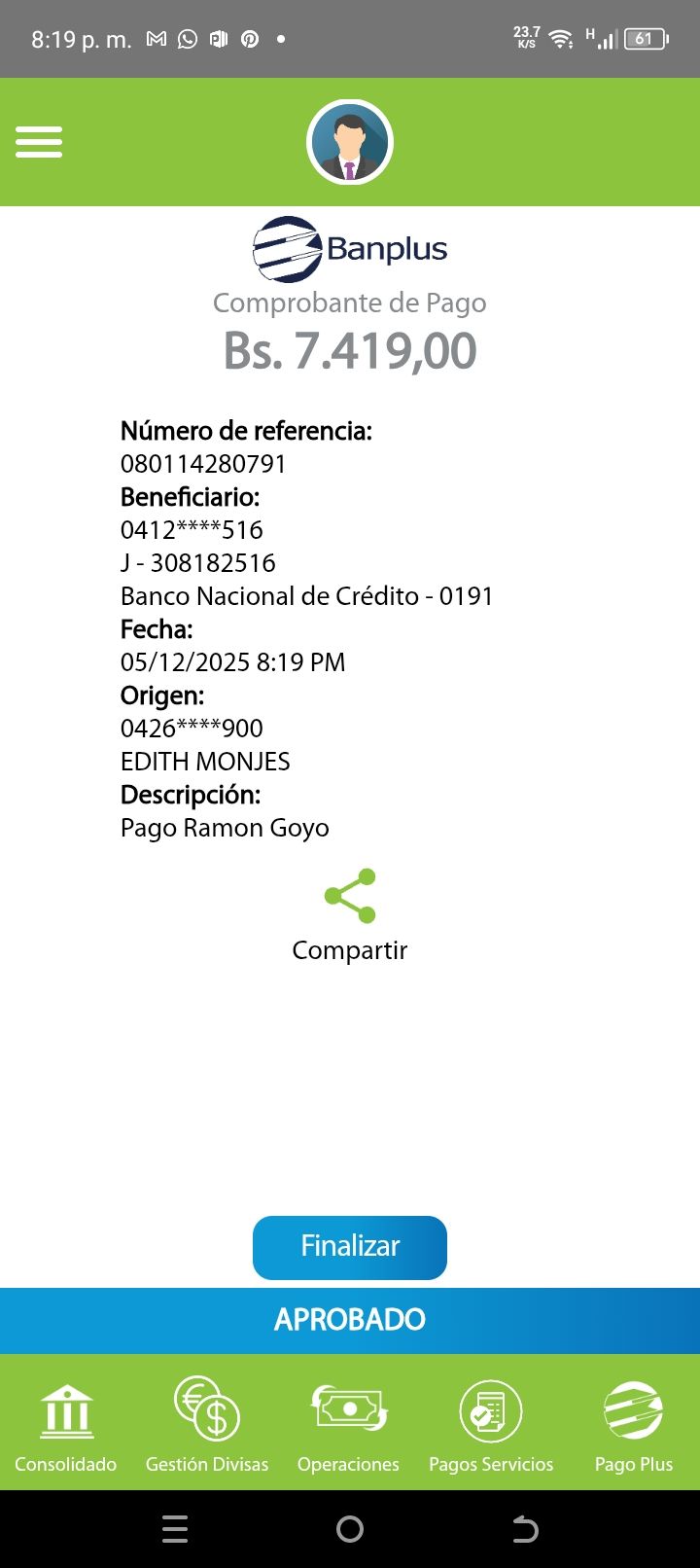 | BQ20391 | RAMÓN ANTONIO GOYO RODRIGUEZ | 2025-12-05 | BNC 2614 | 14280791 | | 7,419.00 BS | 247.30 | REGISTRADO |