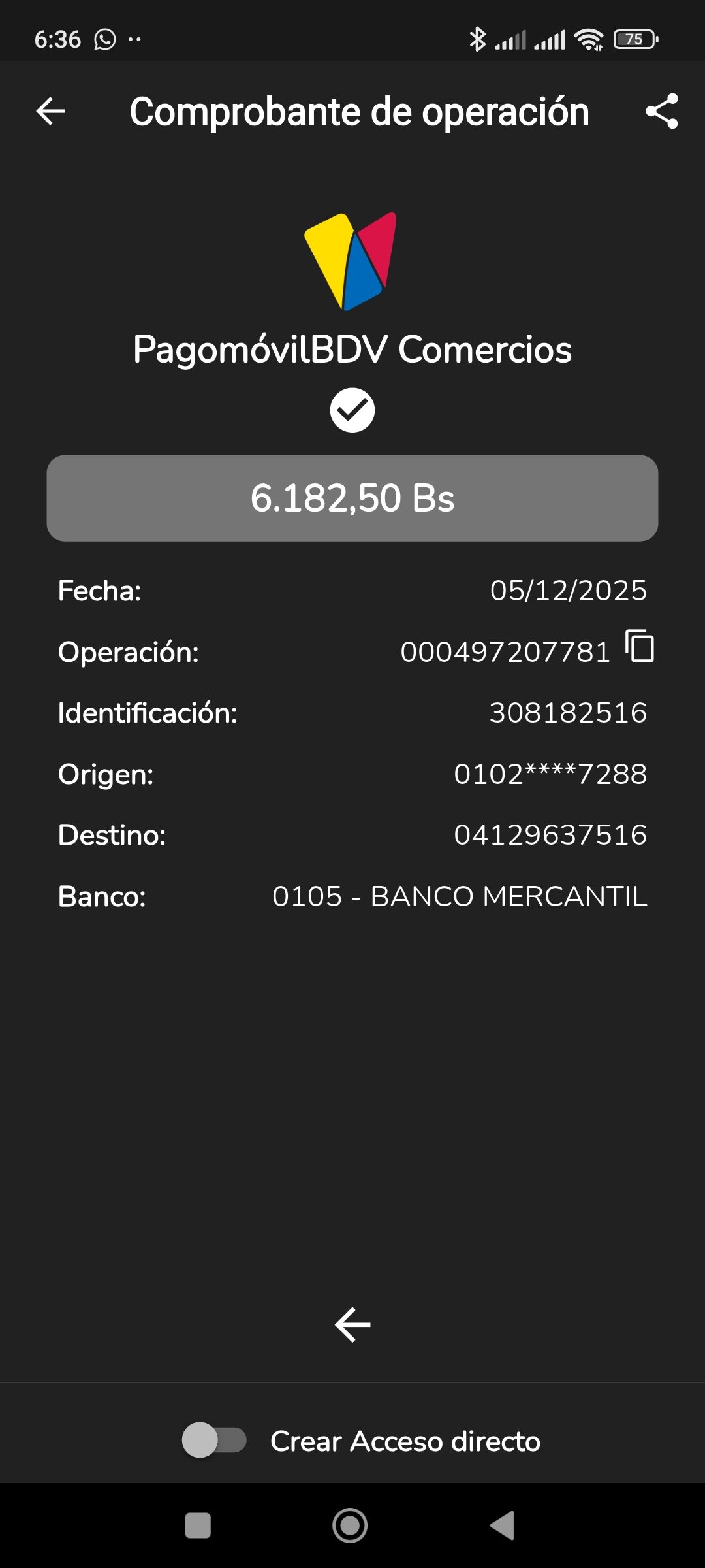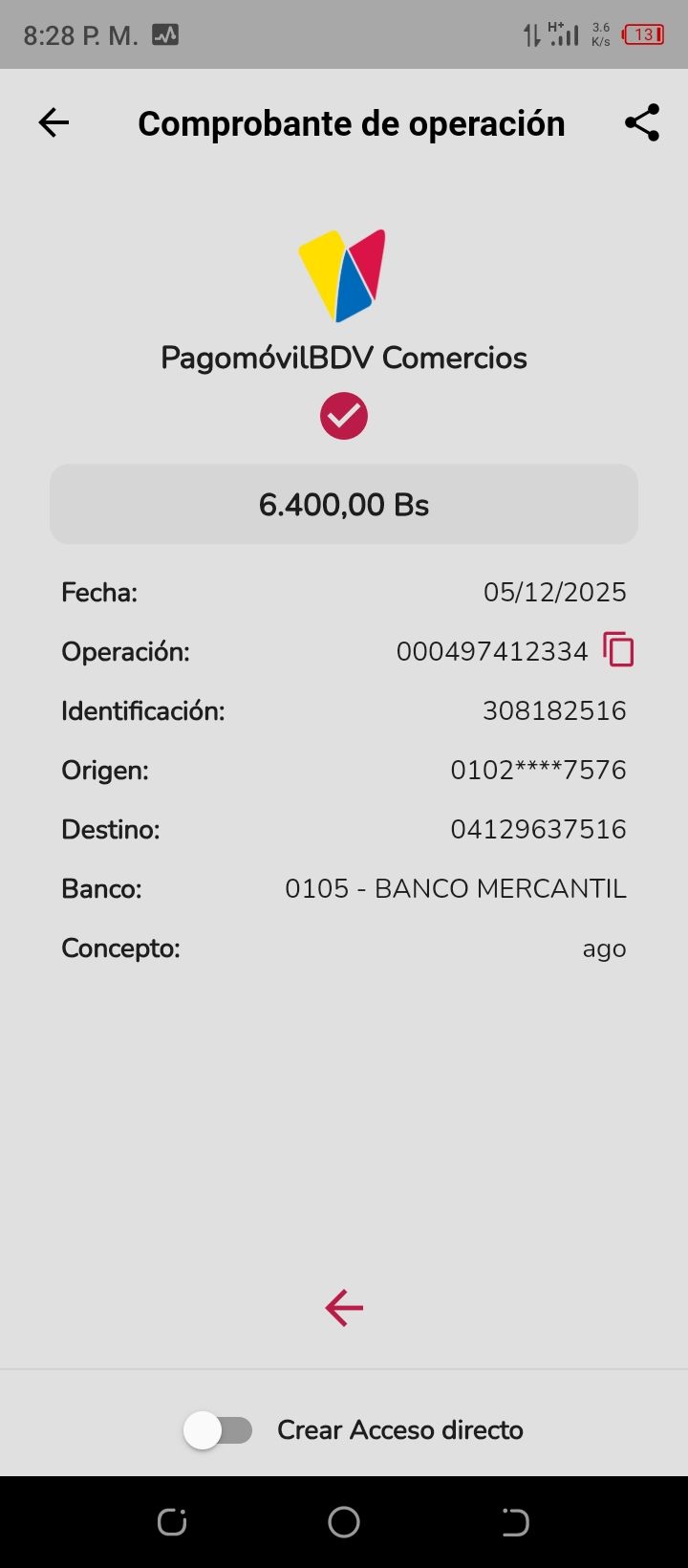 | LAG0542 | EDWIN WILLIANGEL ESCOBAR PEREZ | 2025-12-05 | MERCANTIL 2163 | 97412334 | | 6,400.00 BS | 247.30 | REGISTRADO |